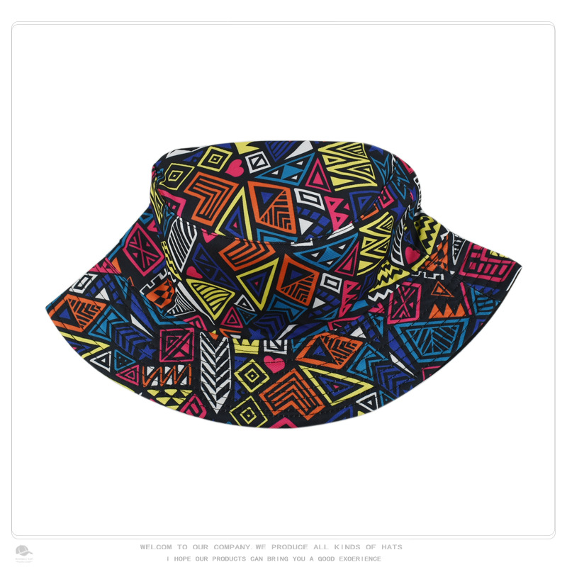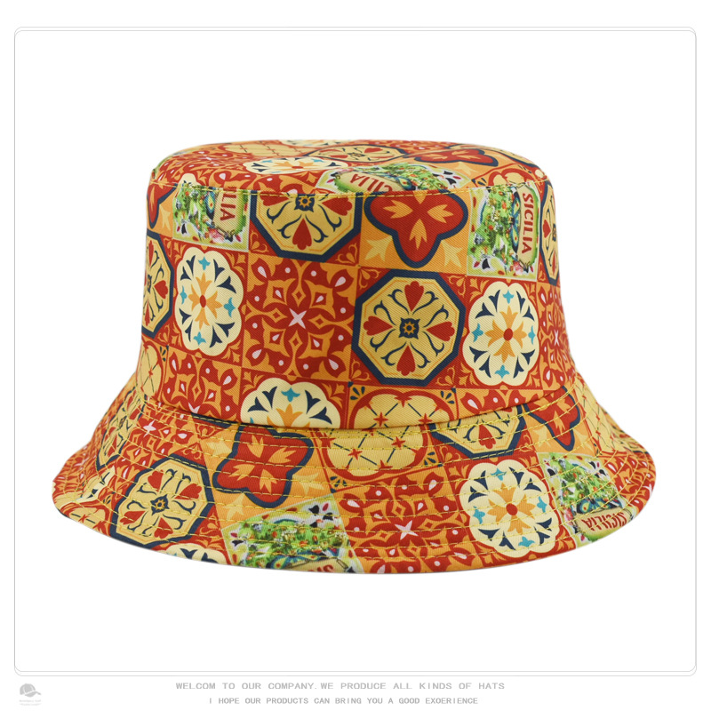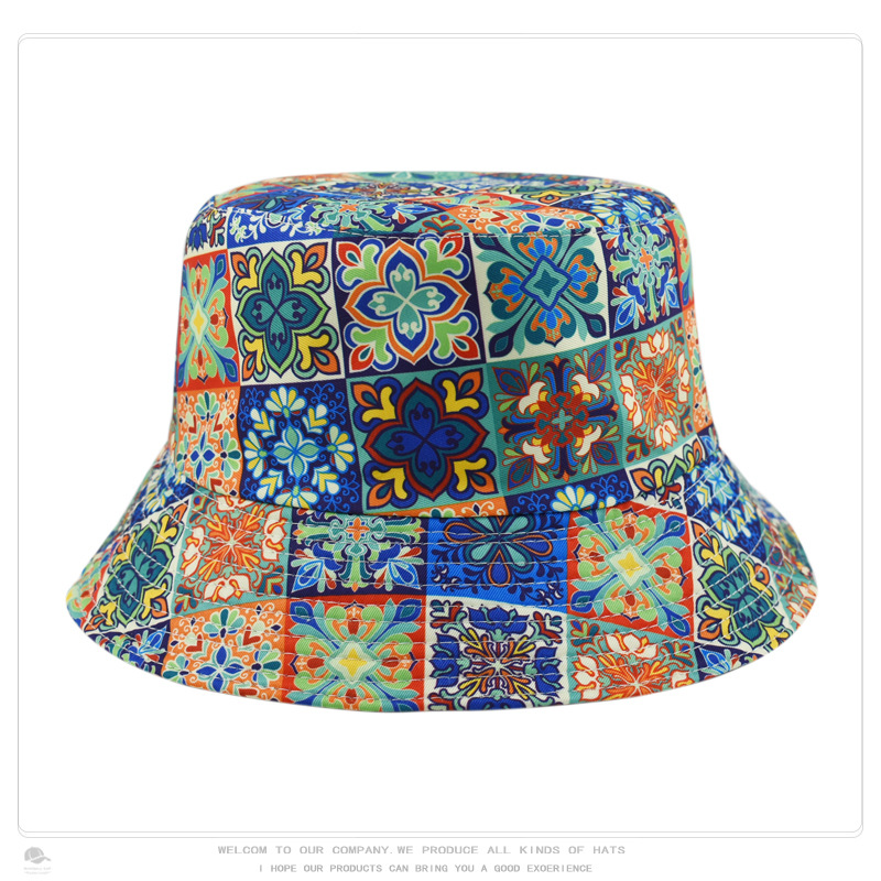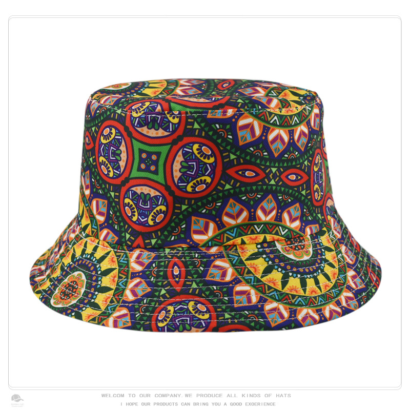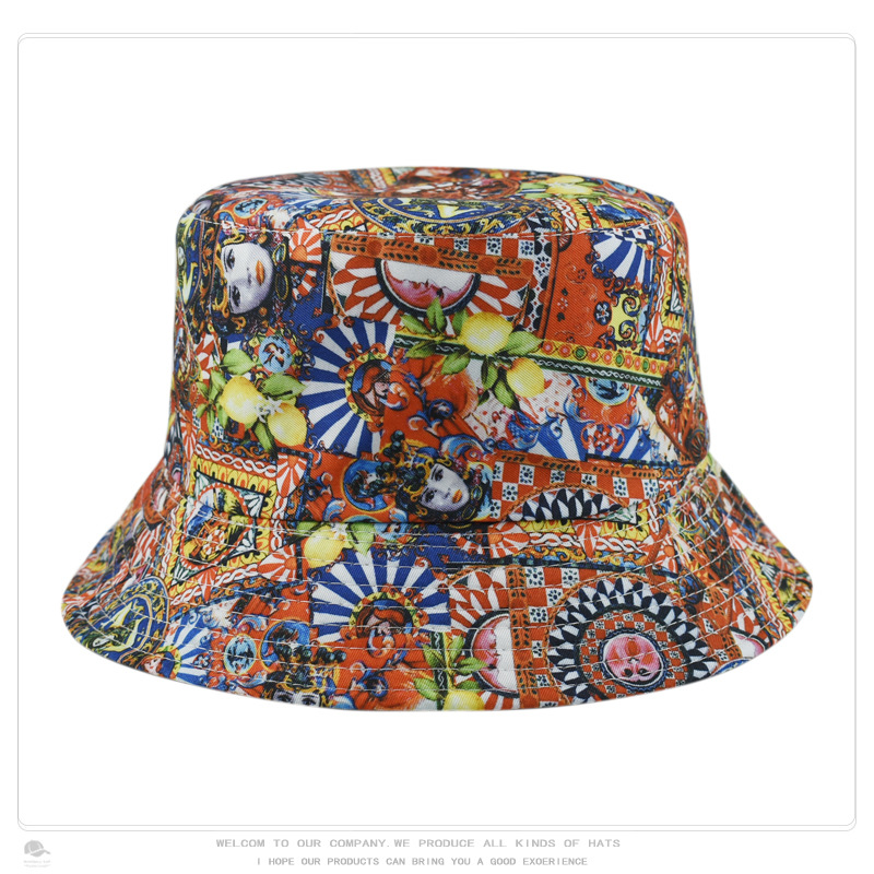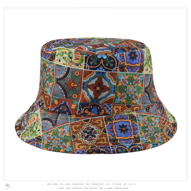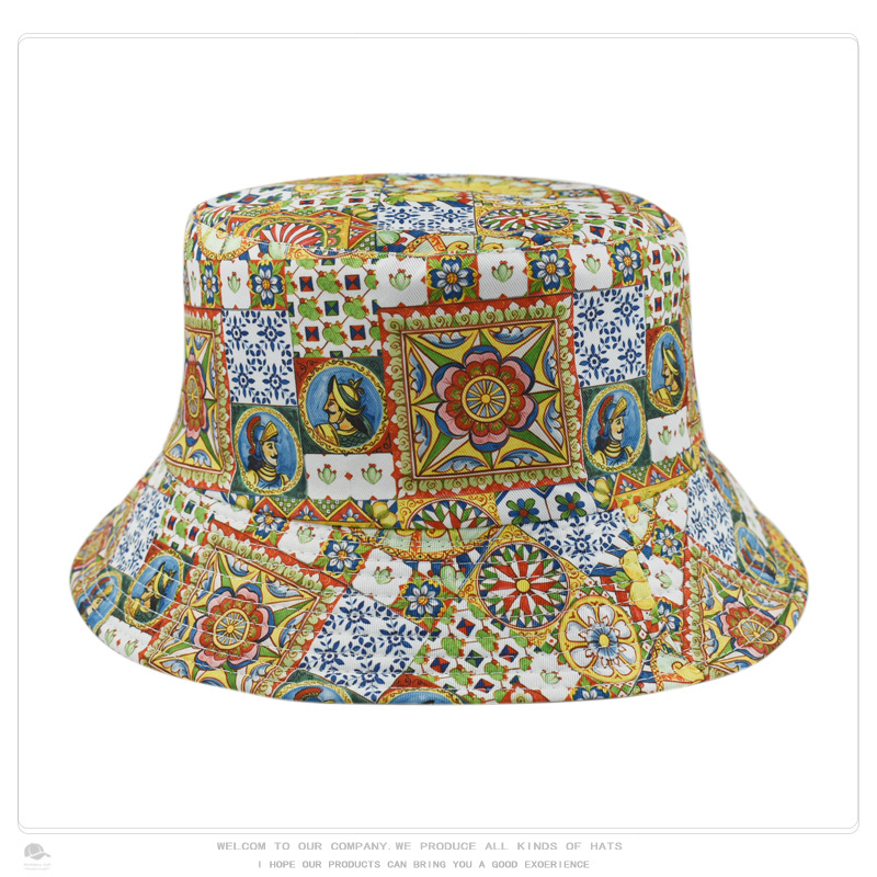 新款欧美时尚复古图案印花渔夫帽女户外旅行遮阳帽双面可戴盆帽男
