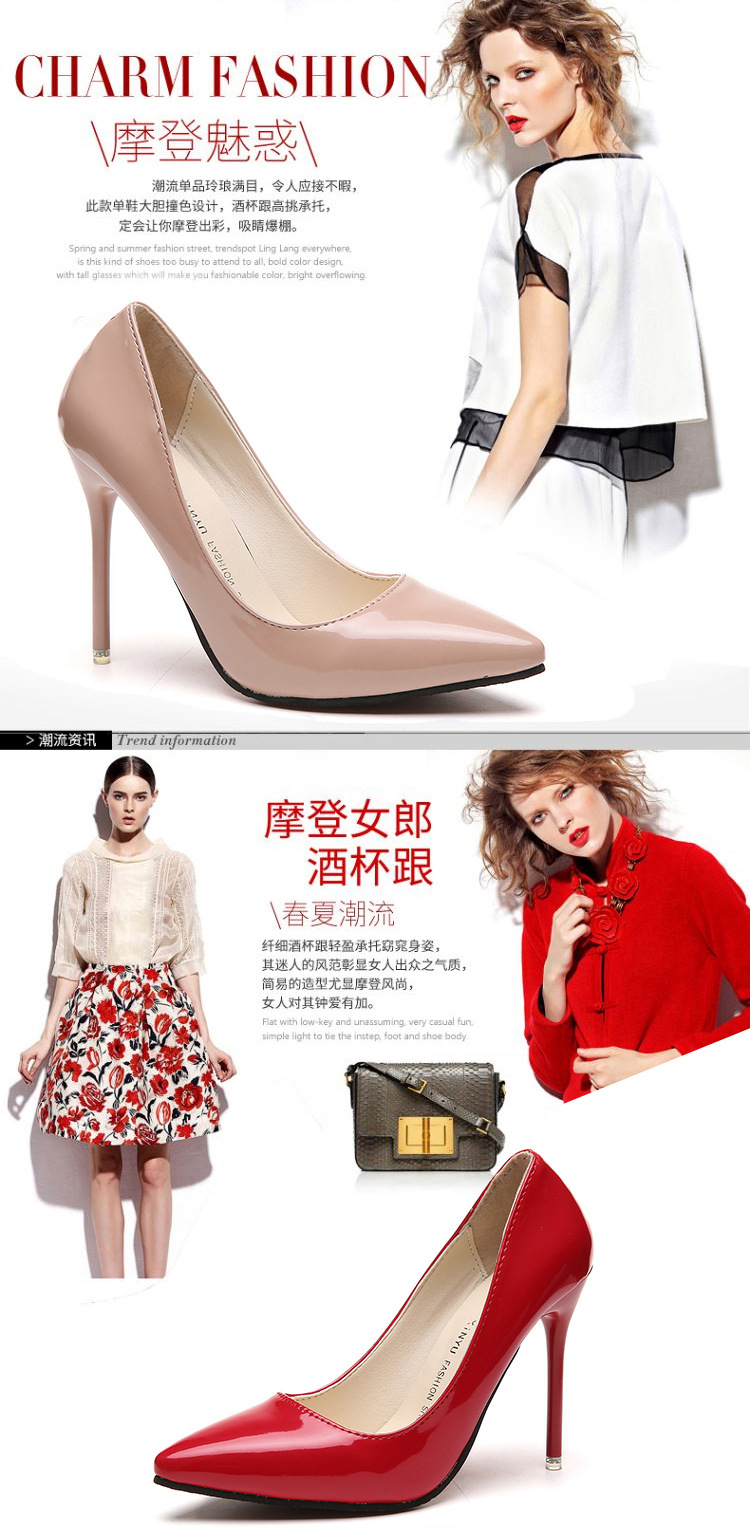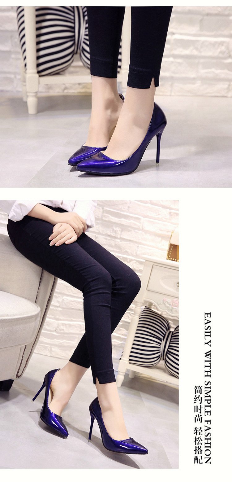 欧洲站裸色细跟高跟鞋尖头黑色工作单鞋女漆皮蓝色大码鞋红色婚鞋