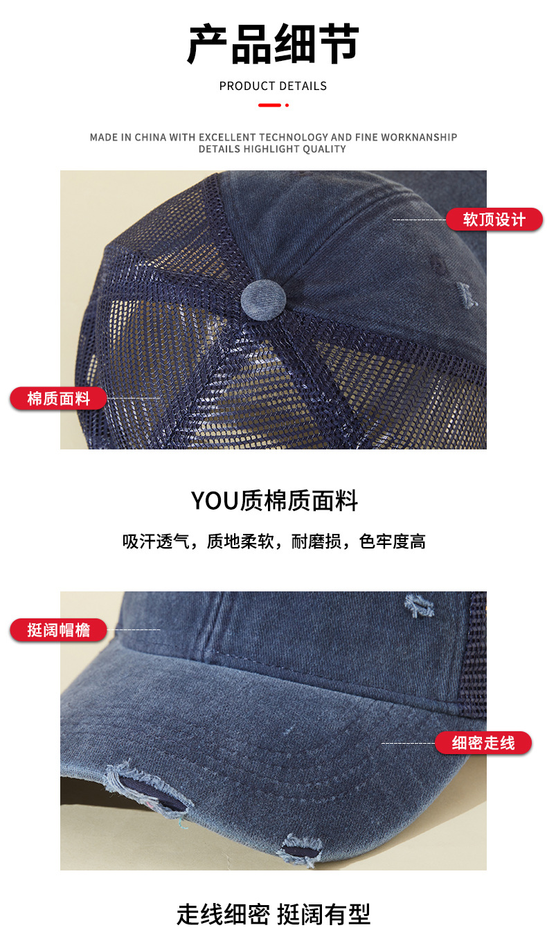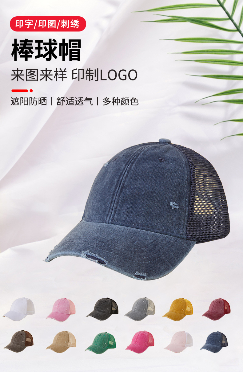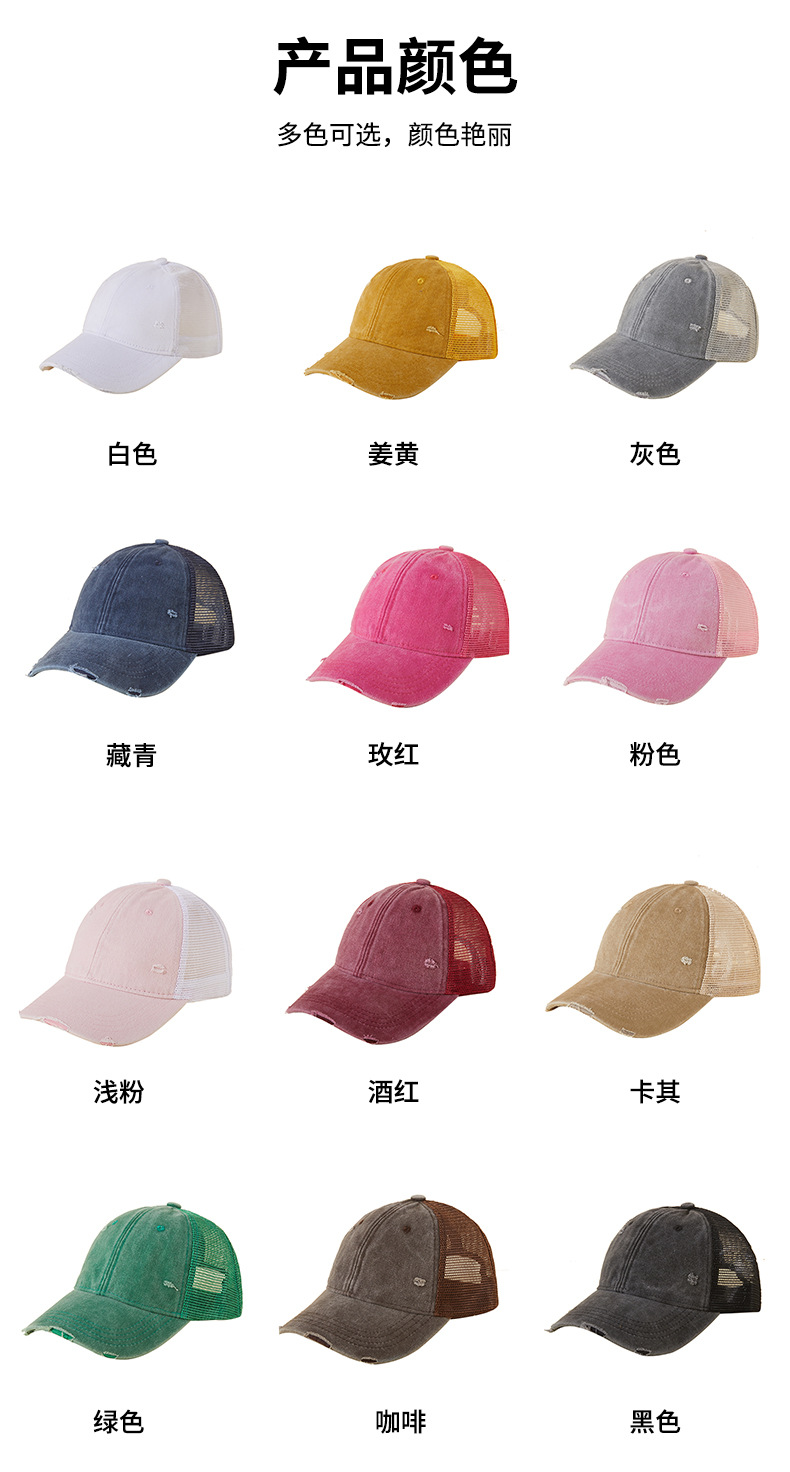 新款水洗网帽破洞 刺绣DIY鸭舌帽防晒帽女款户外遮阳帽批发