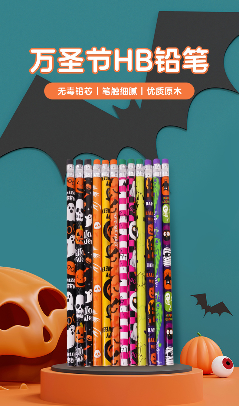 卡通高颜值带橡皮头铅笔儿童省力可爱圆形杆铅笔万圣节袋装HB铅笔