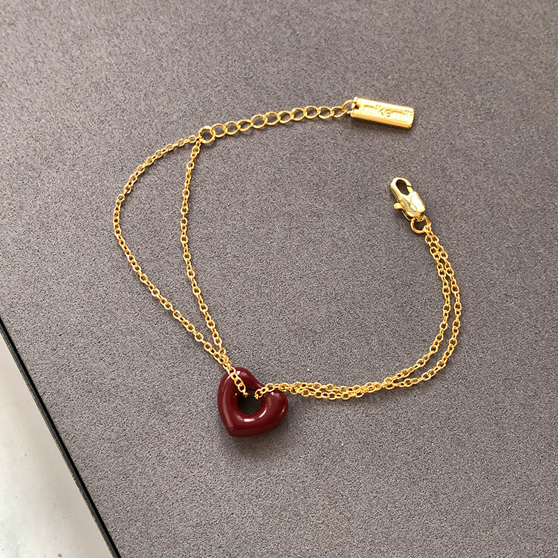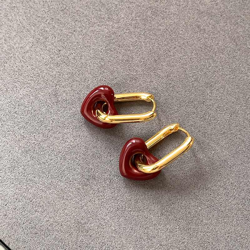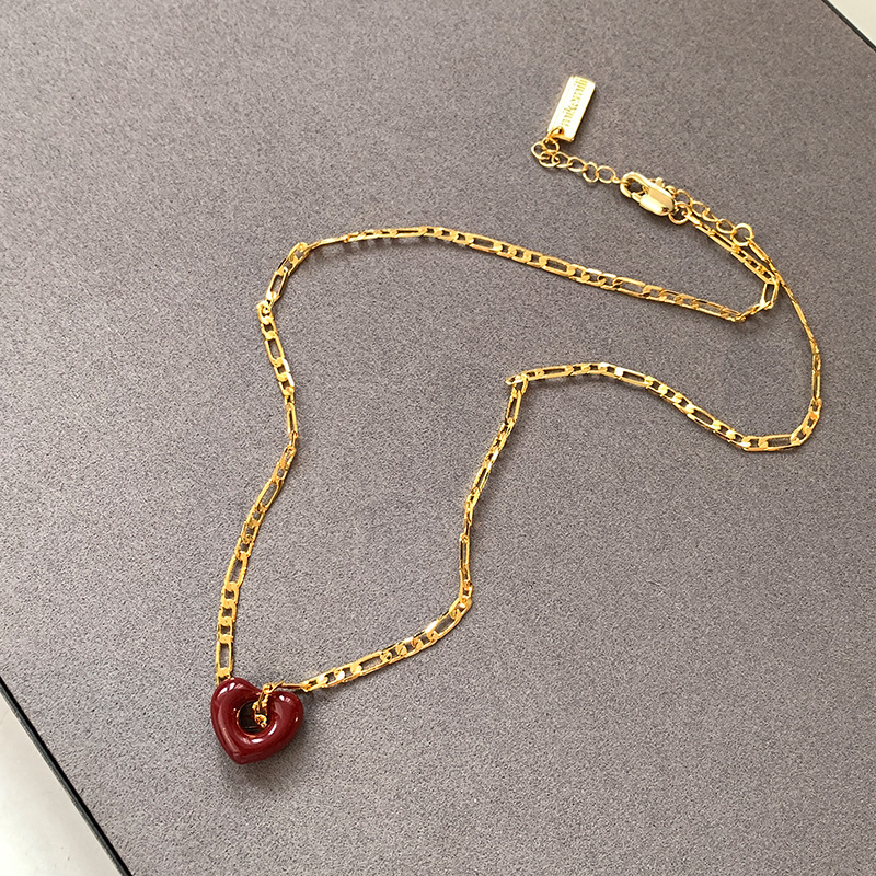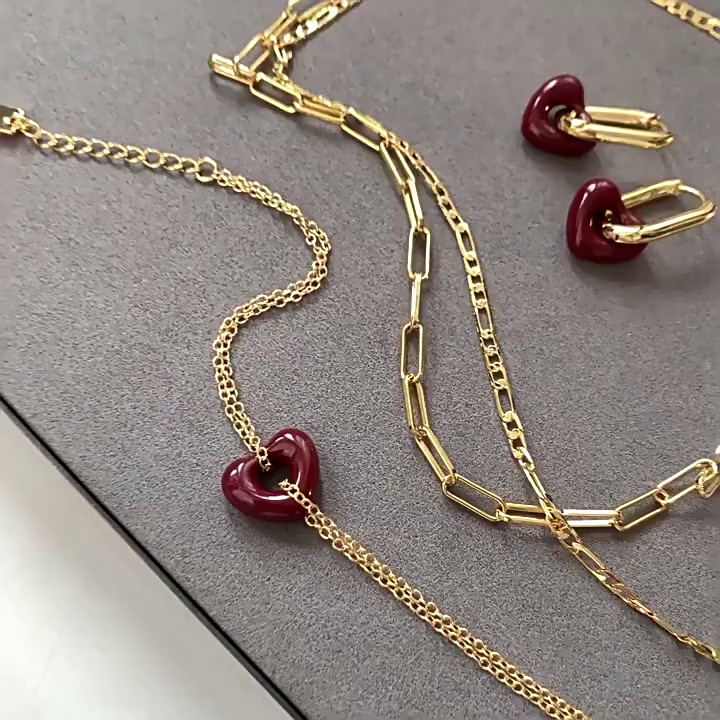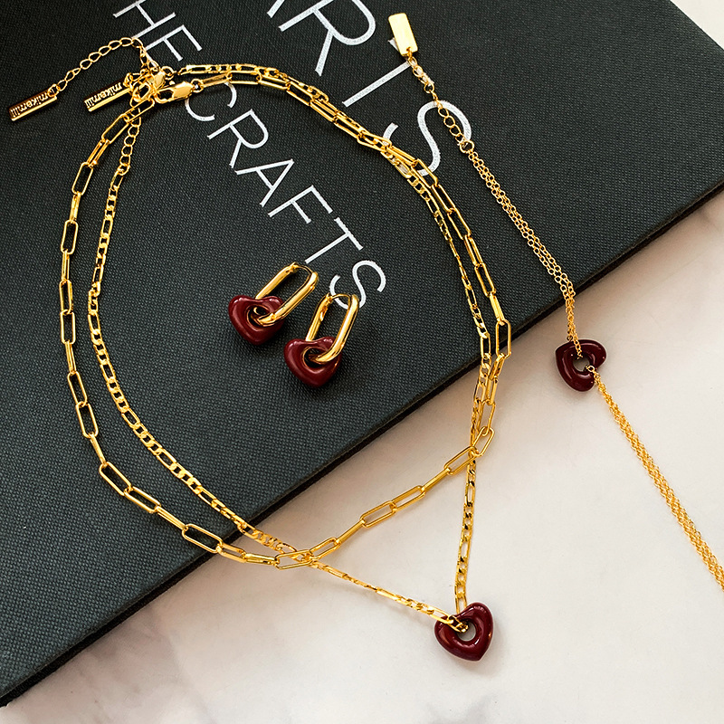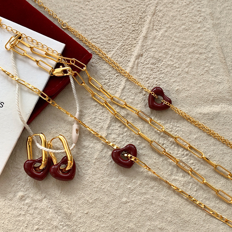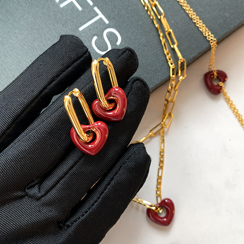 时尚百搭气质爱心耳环高级感锁骨链真金电镀红色滴釉桃心项链女