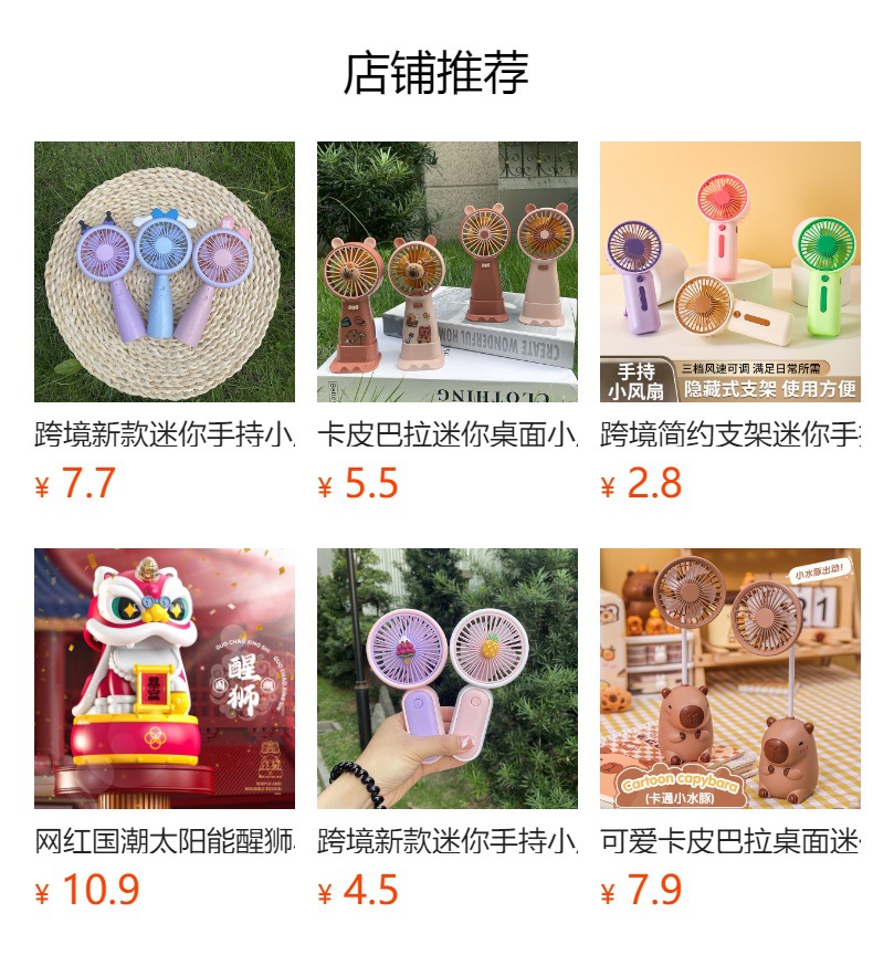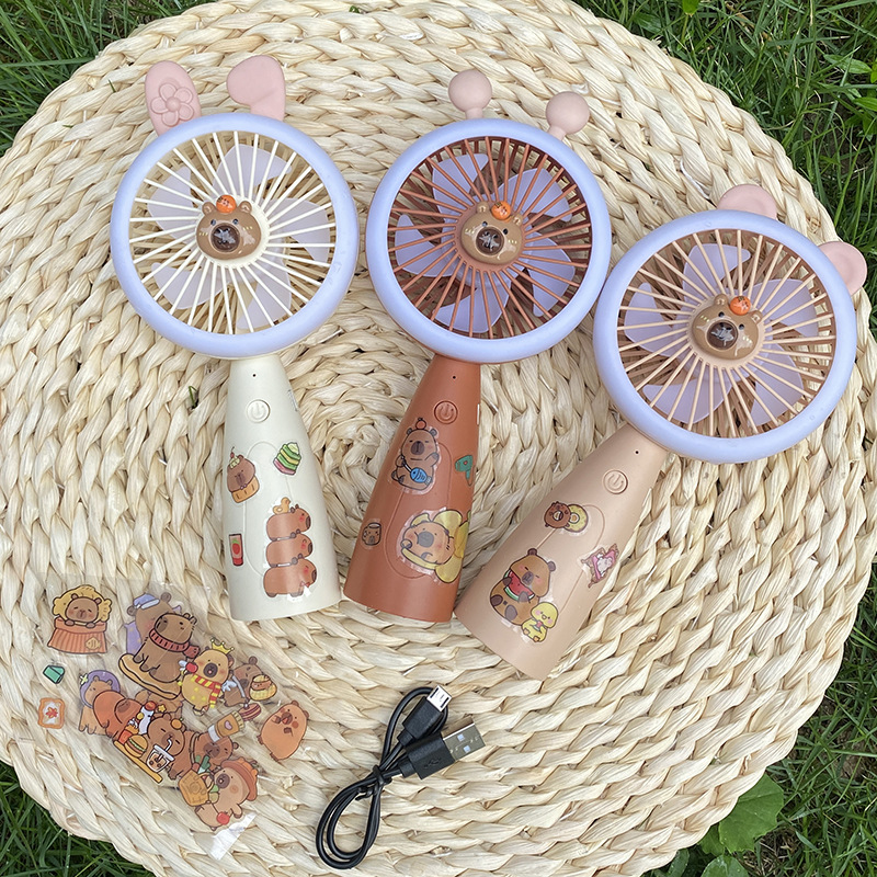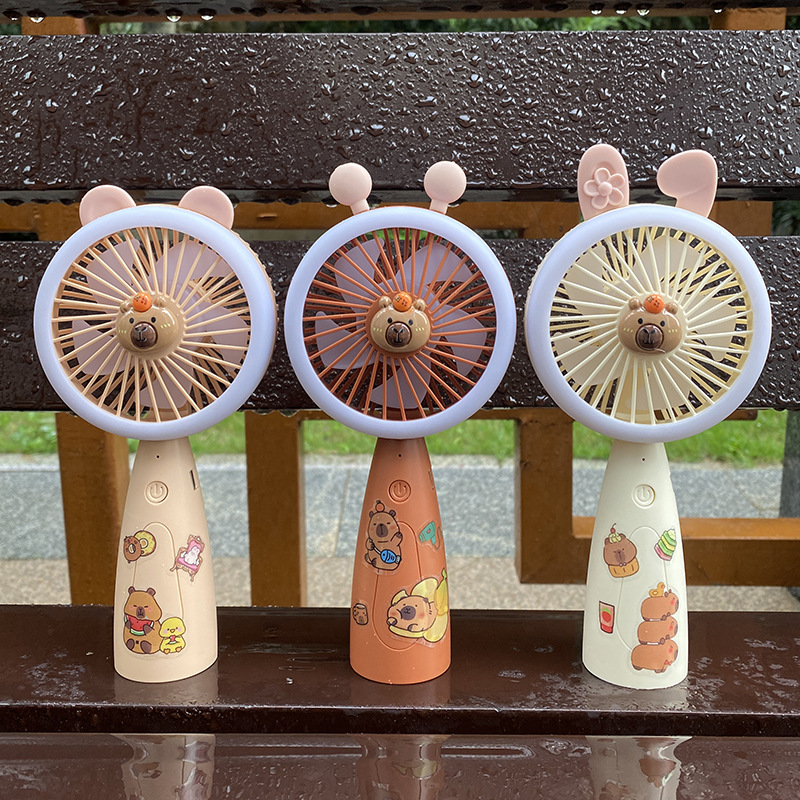 跨境新款卡通卡皮巴拉带灯光手持风扇三档大风USB充电迷你电风扇