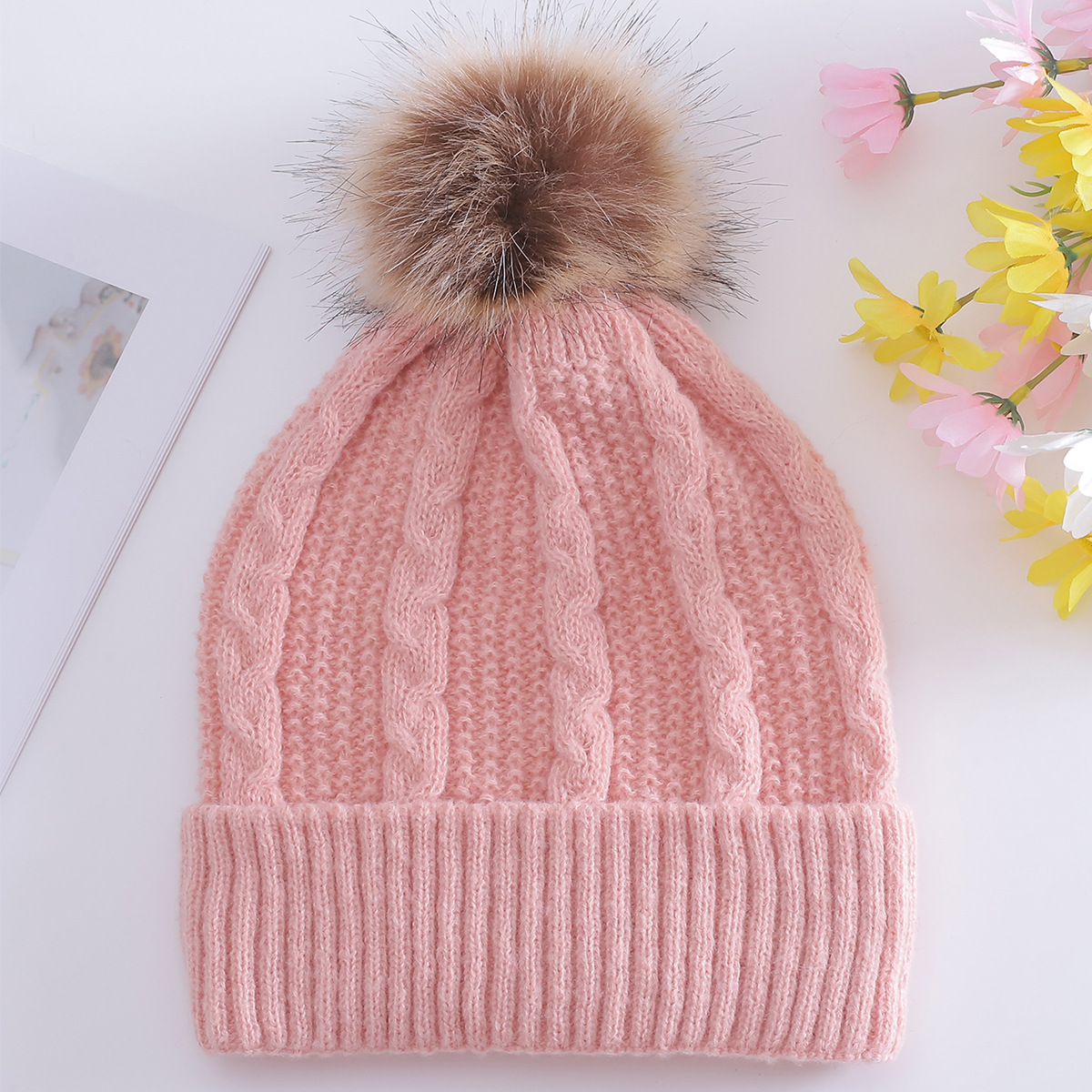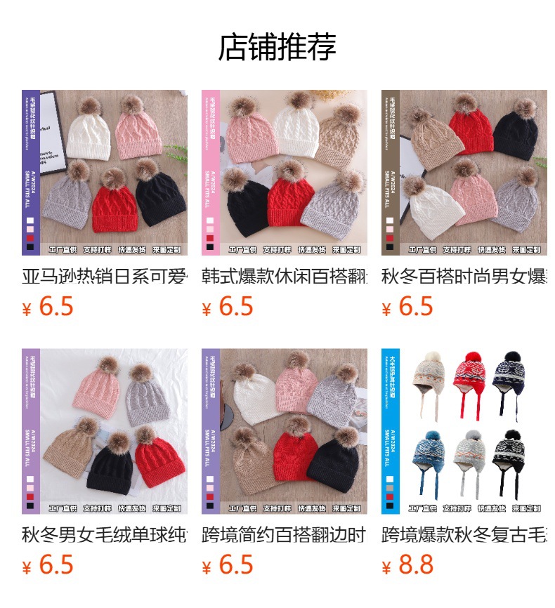 亚马逊秋冬热销翻边纯色毛球针织帽男女百搭流行韩版简约设计保暖