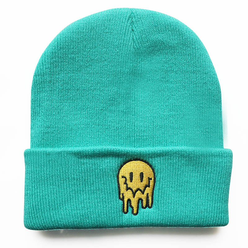 欧美男女流行melting smiley face笑脸刺绣针织帽套头保暖毛线帽