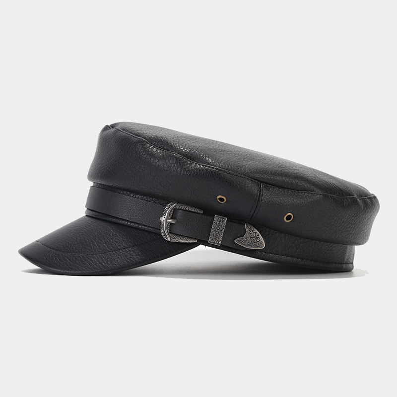 英伦复古皮带扣装饰皮质海军帽日系文艺街拍时尚军帽黑色鸭舌帽子