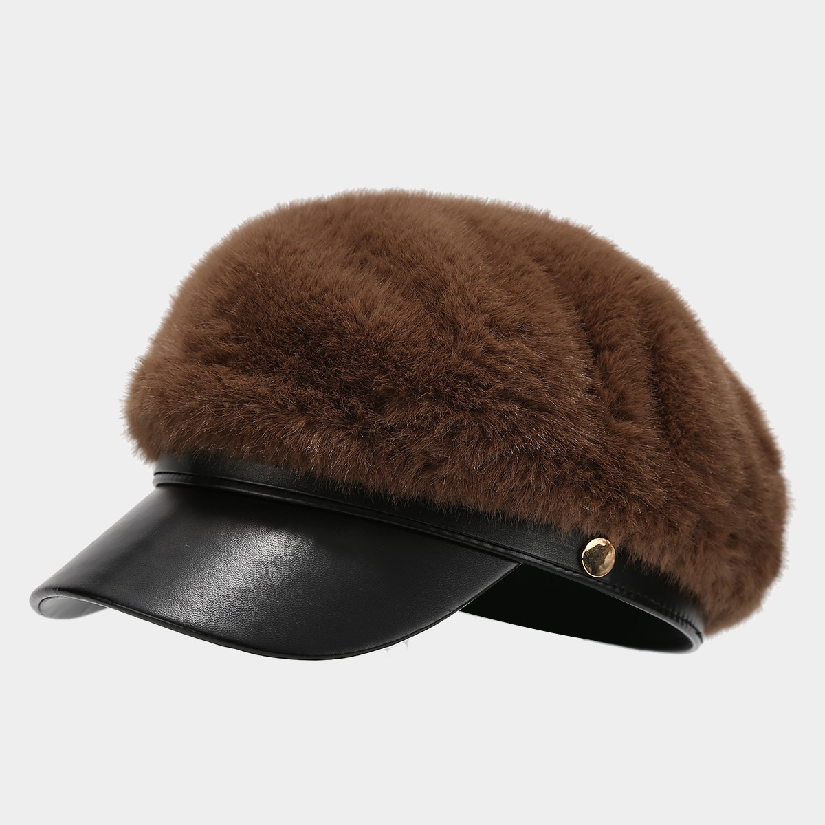 小香风文艺复古仿貂绒八角帽子女士冬季加厚保暖PU沿鸭舌帽报童帽