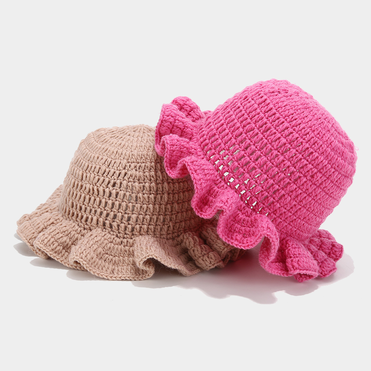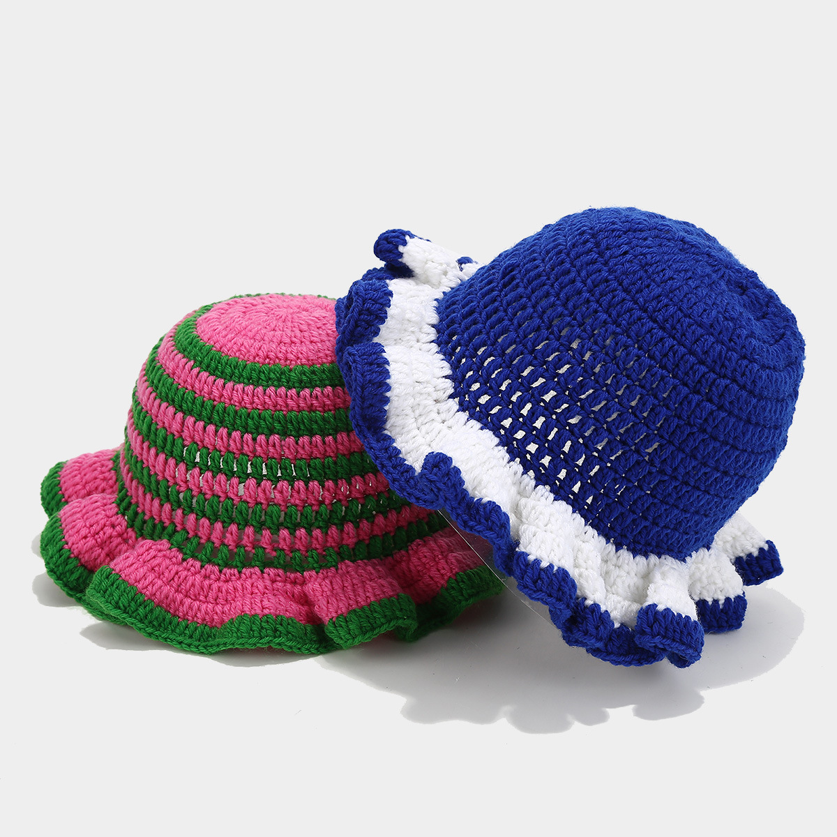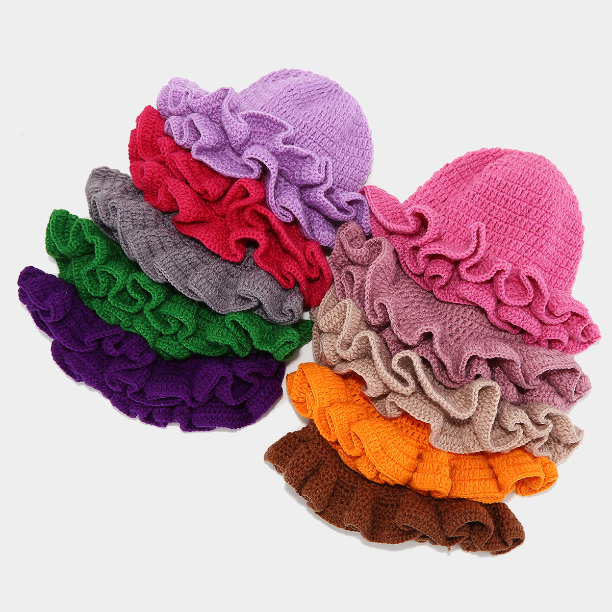 亚马逊手工钩针褶边毛线帽时尚彩色斗笠帽跨境电商男女荷叶边帽子
