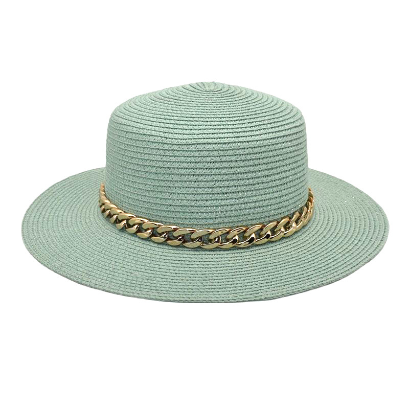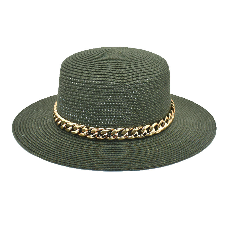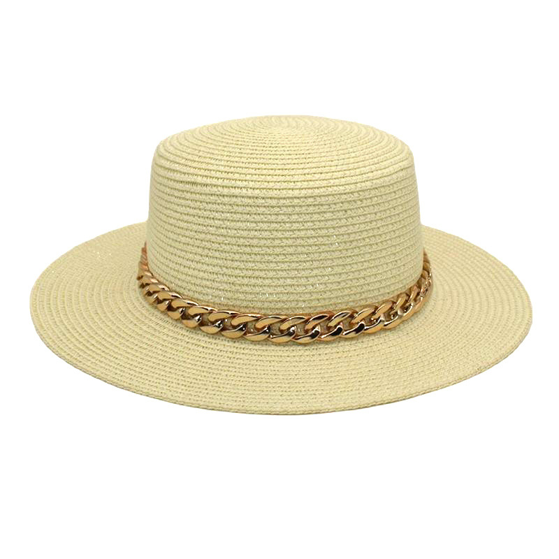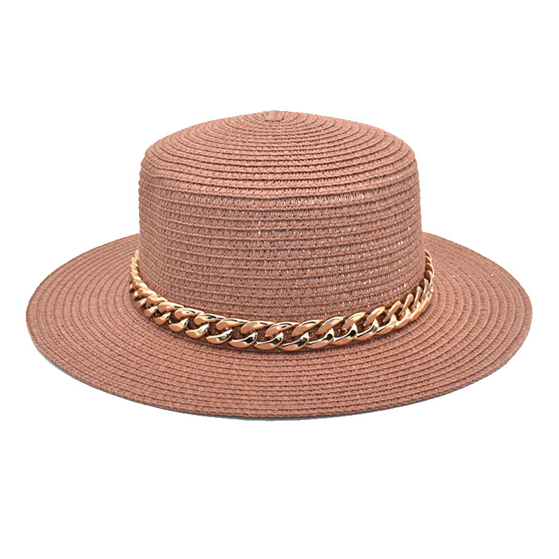 亚克力链条草编平顶帽休闲复古遮阳帽出游度假草帽女遮阳防晒