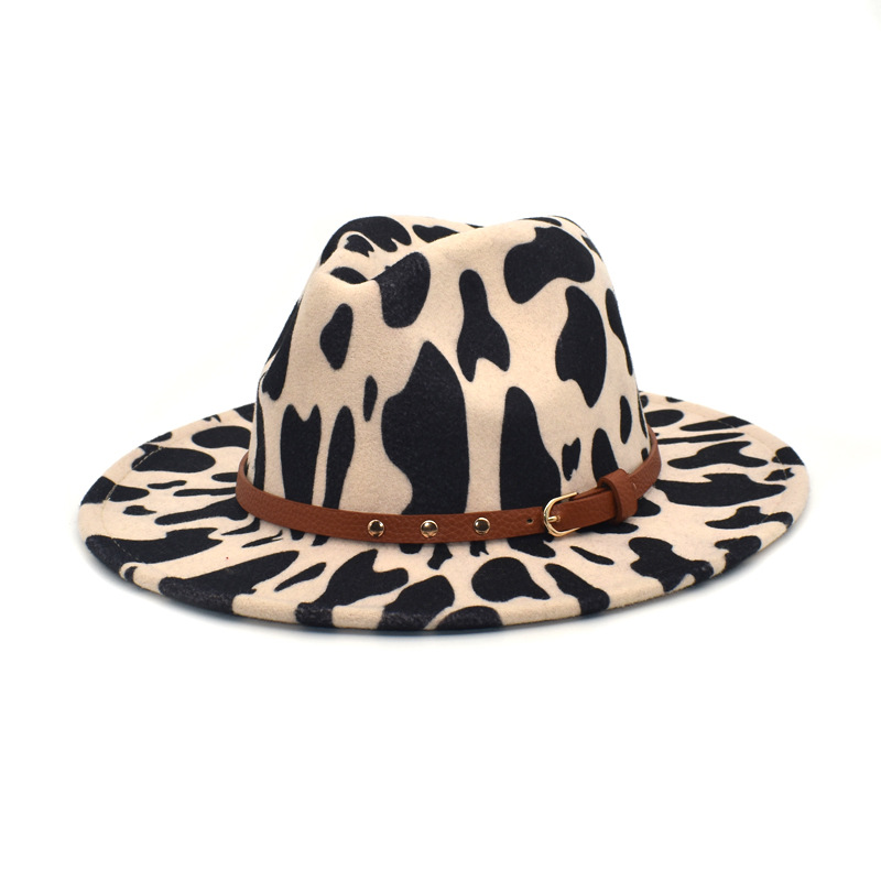 奶牛纹毛呢帽 新款女士软呢帽 男士户外爵士帽 大沿毡帽 平沿礼帽