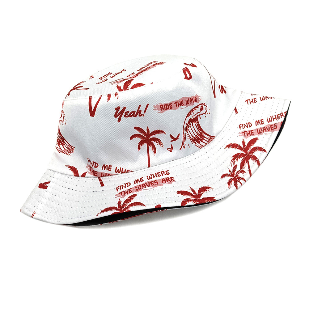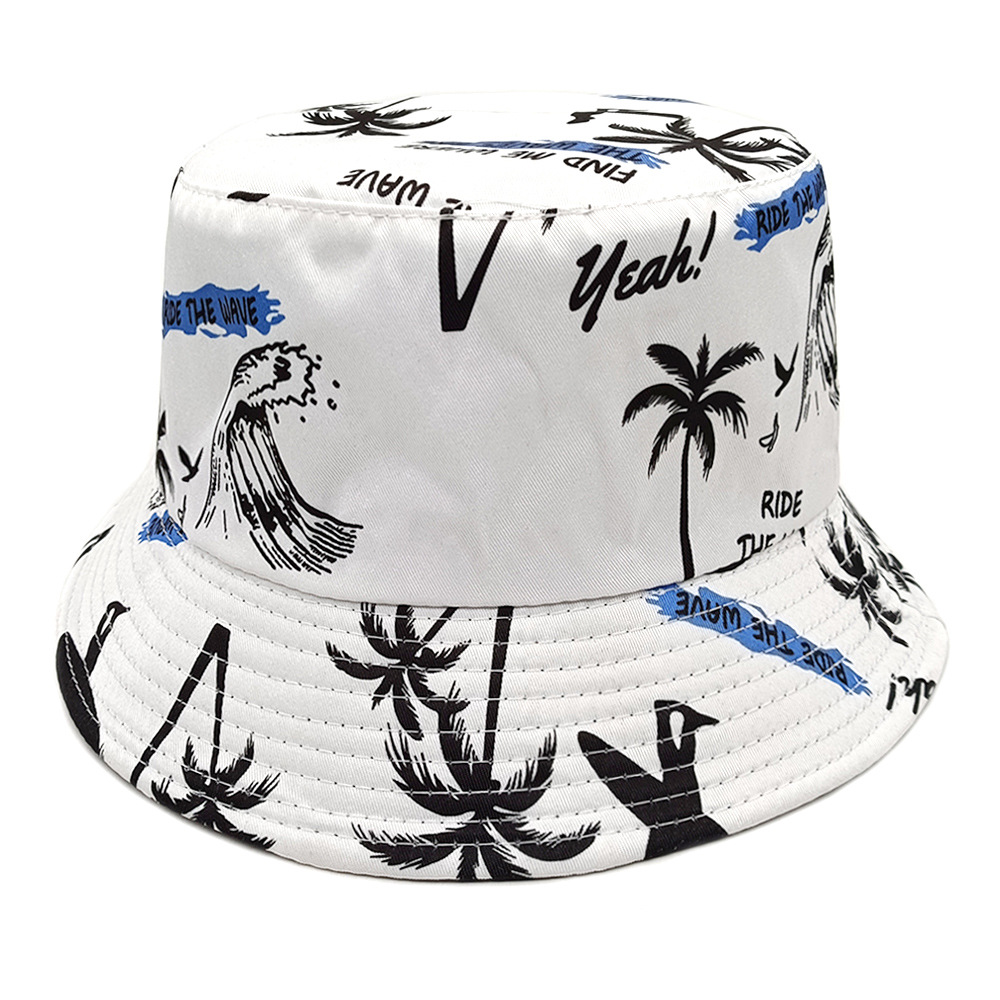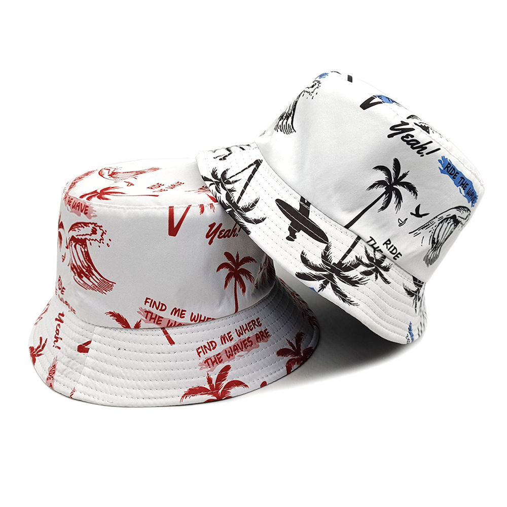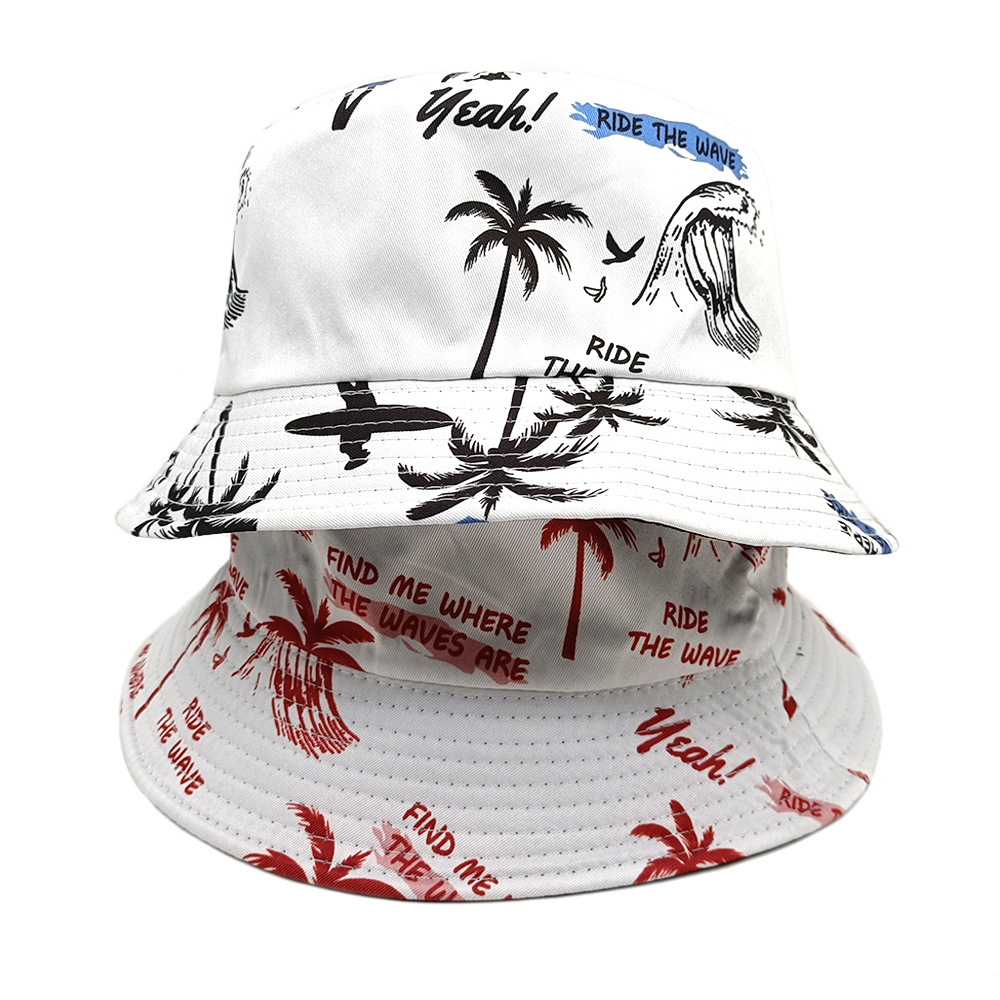 春夏出游沙滩度假风椰树图案双面戴渔夫帽男女休闲防晒太阳帽盆帽