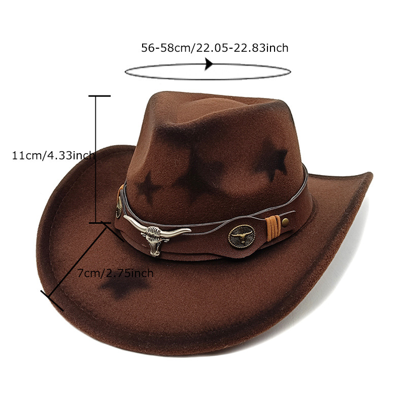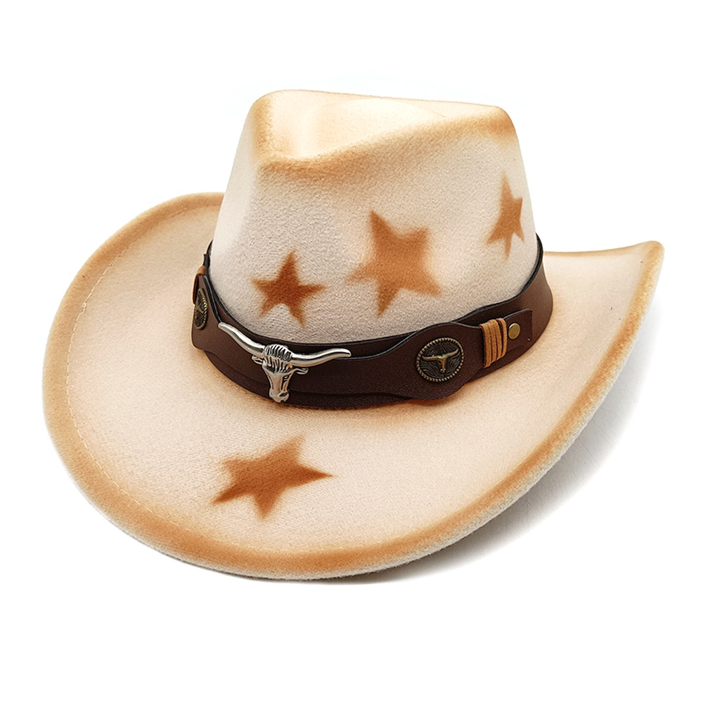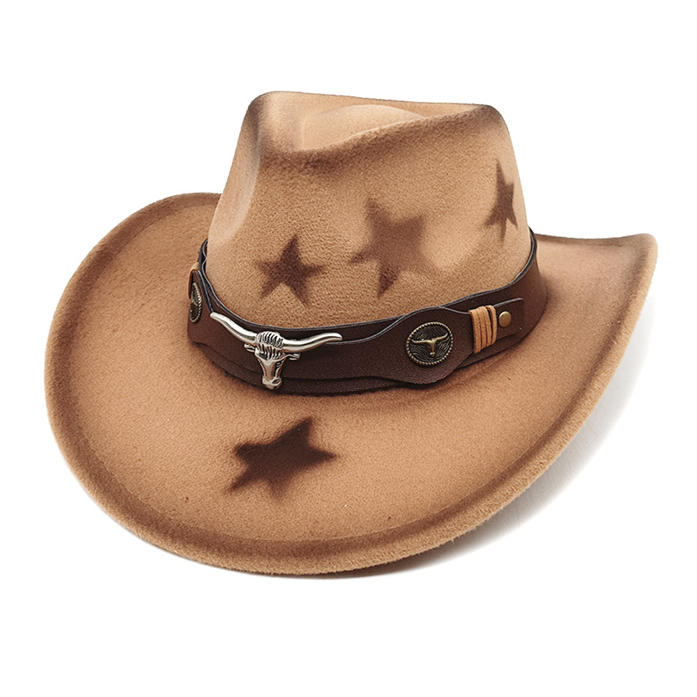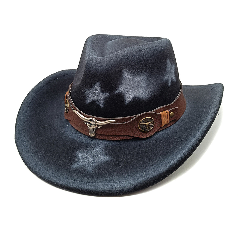 亚马逊热卖礼帽民族风牛标西部牛仔礼帽卷檐复古骑马帽子毛呢毡帽