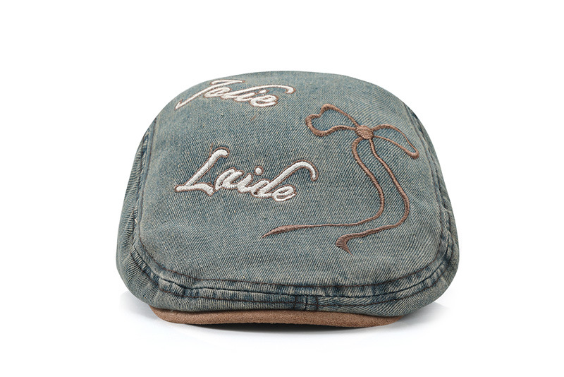 春秋季水洗做旧牛仔贝雷帽逛街百搭蝴蝶结刺绣画家帽女遮阳前进帽