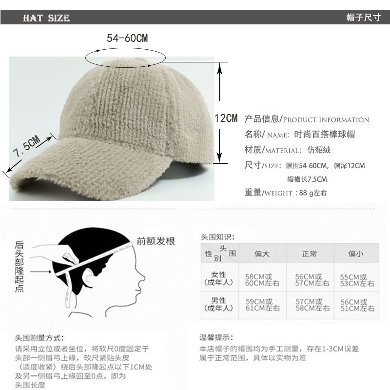 秋冬季帽子女韩版显脸小纯色仿貂绒棒球帽户外休闲保暖鸭舌帽批发
