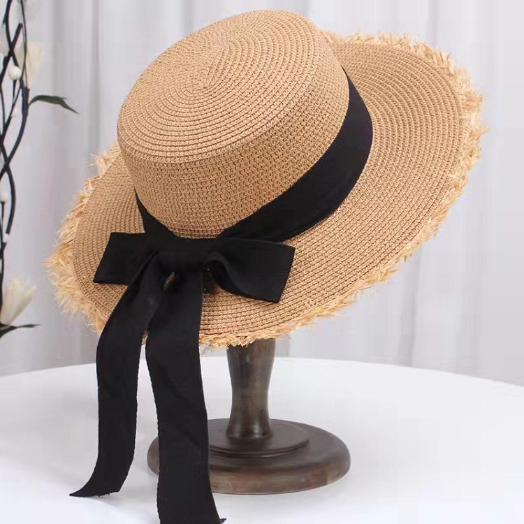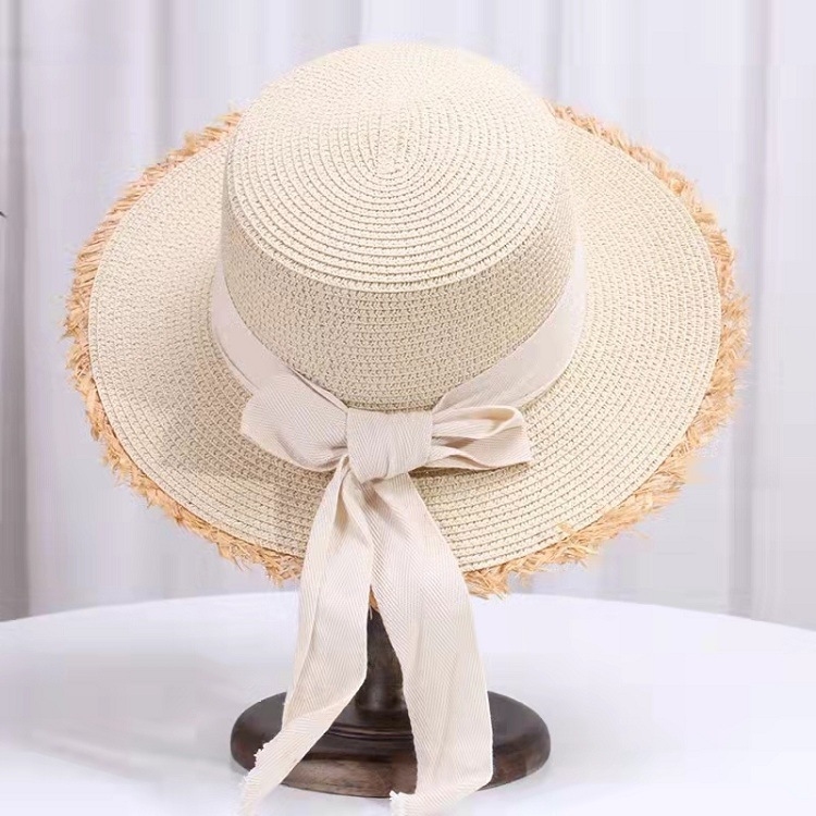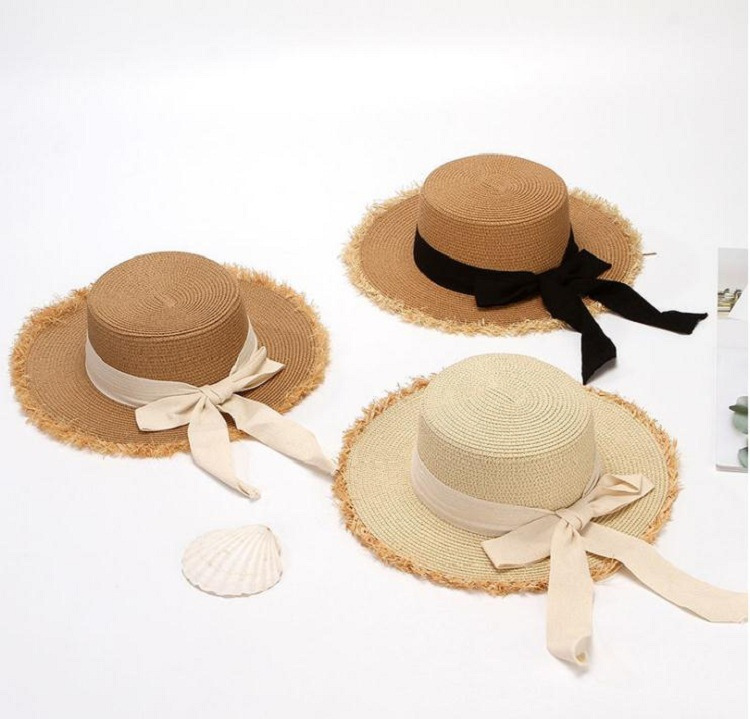 外贸夏季防晒沙滩帽平顶草帽女士蝴蝶结毛边帽旅游度假遮阳帽草帽