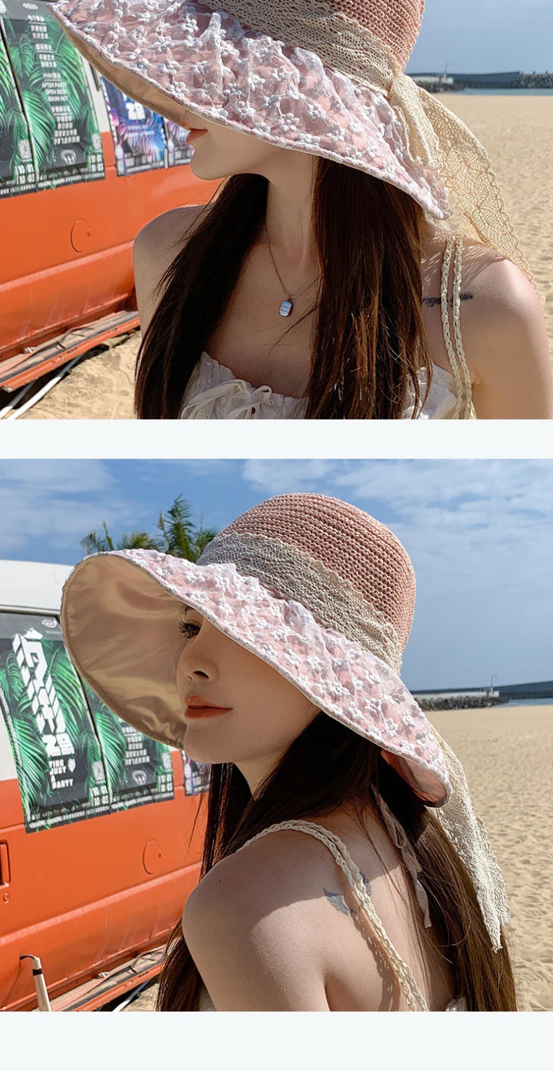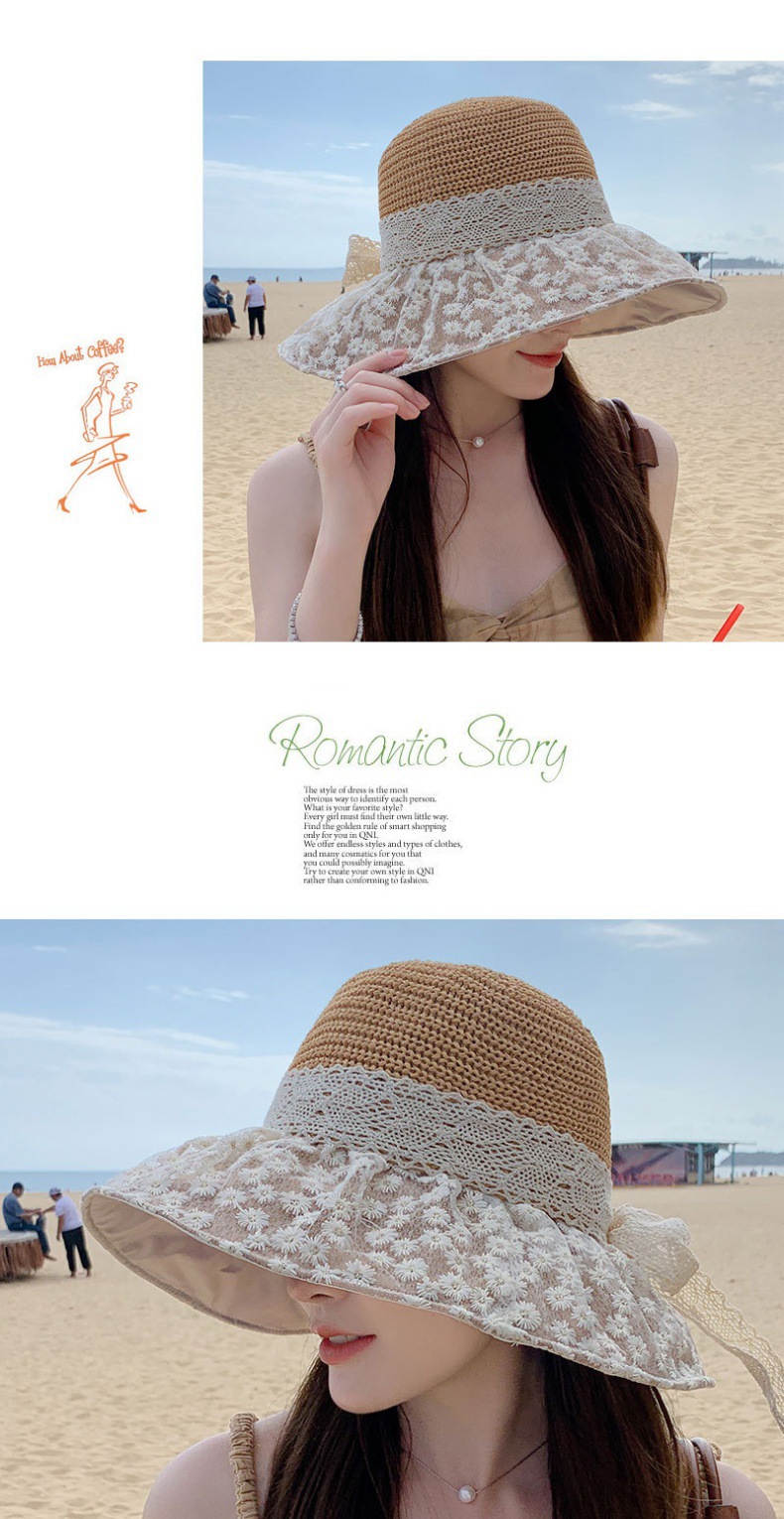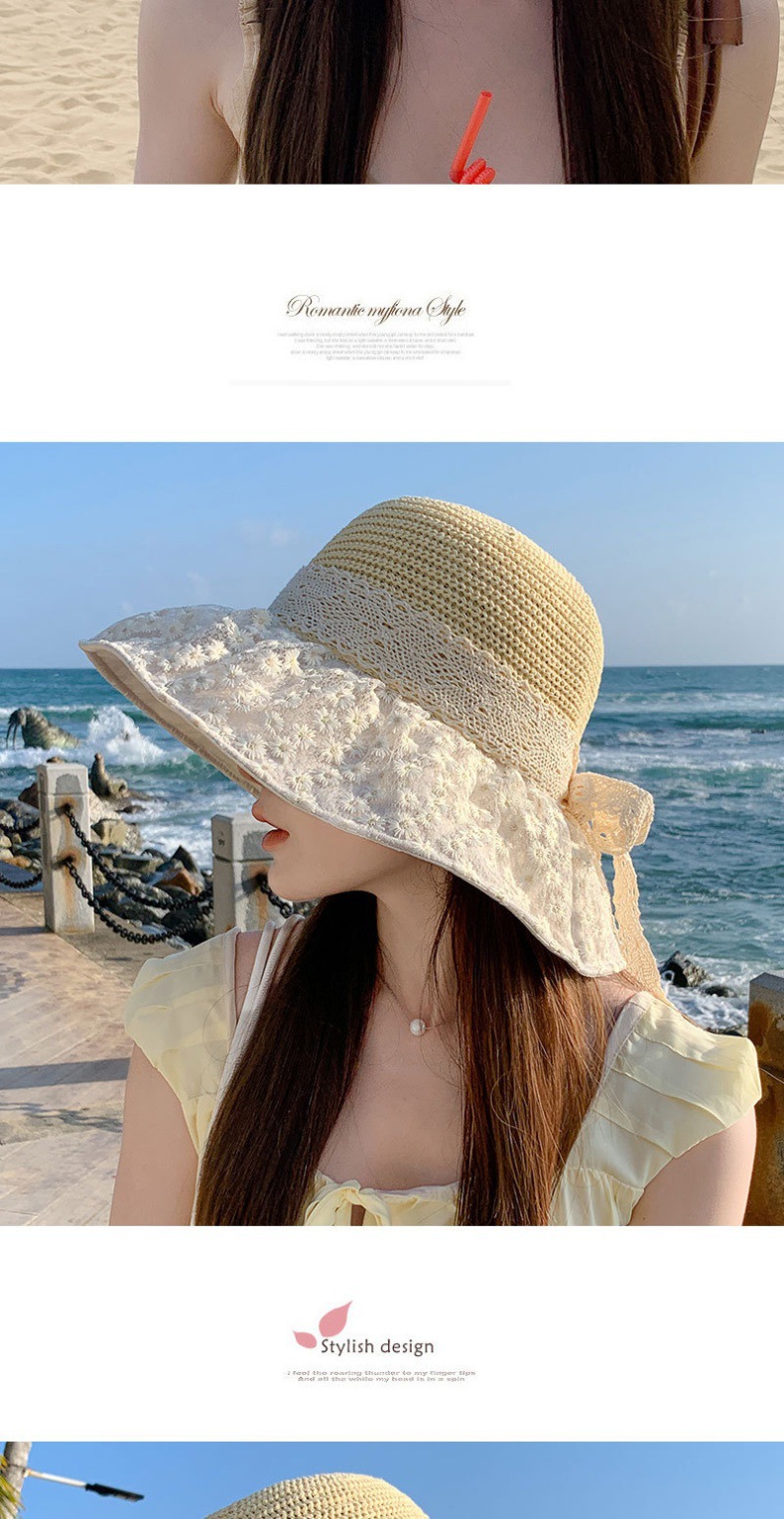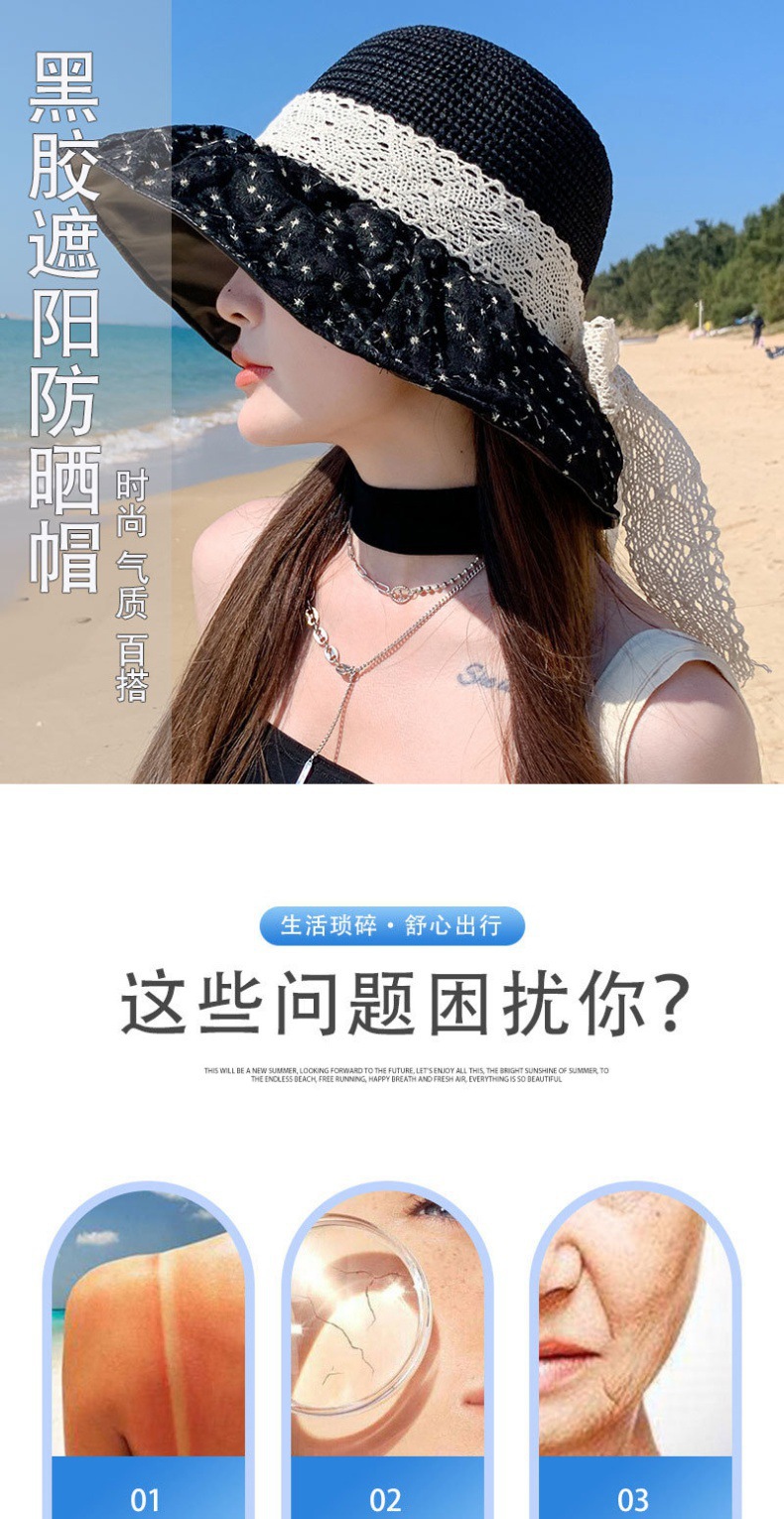 2024款夏季海边度假防晒遮阳草帽时尚可折叠大帽檐蕾丝雏菊黑胶帽