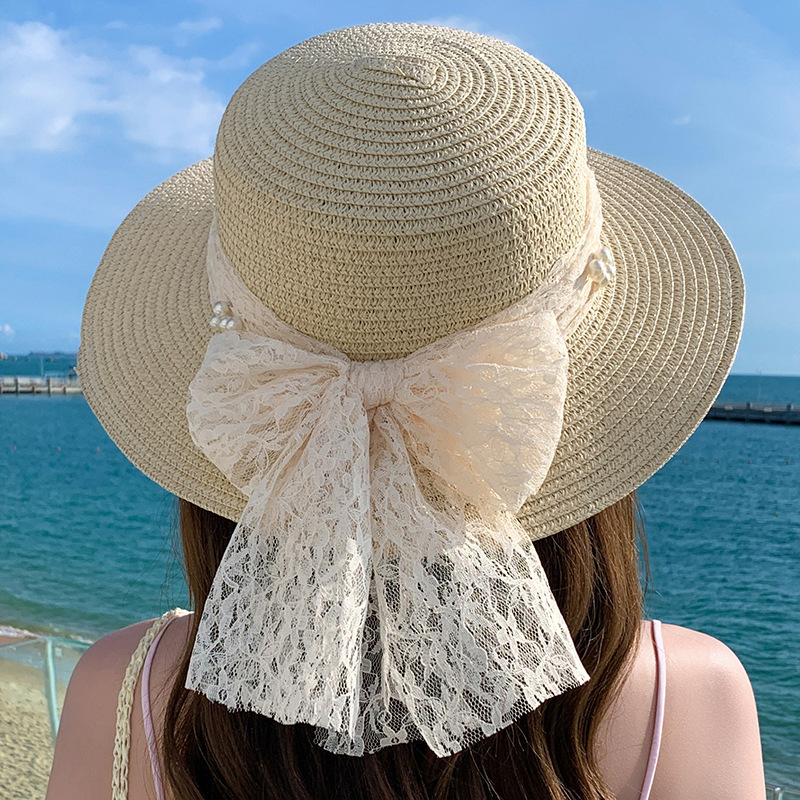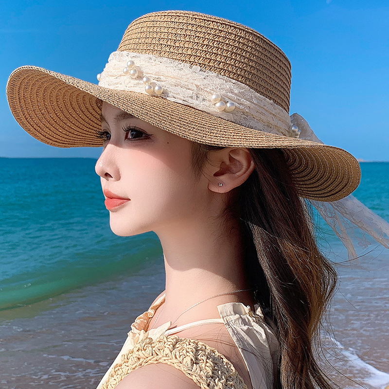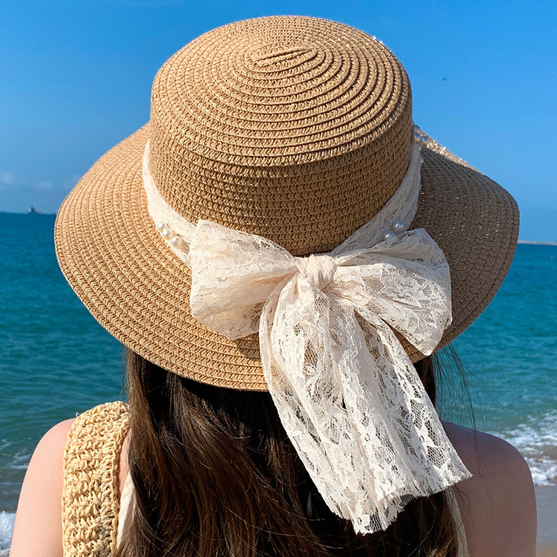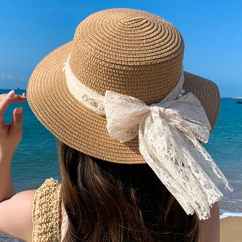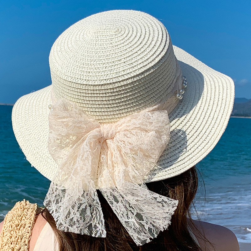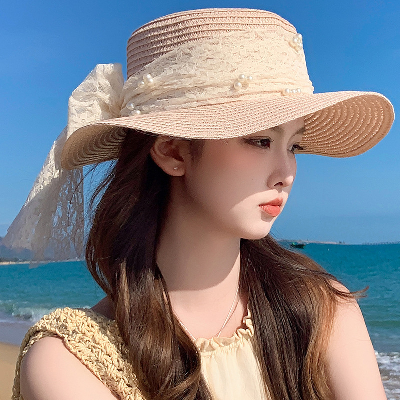 夏季新款草帽女时尚气质高级感珍珠飘带遮阳帽平顶蕾丝太阳帽现货