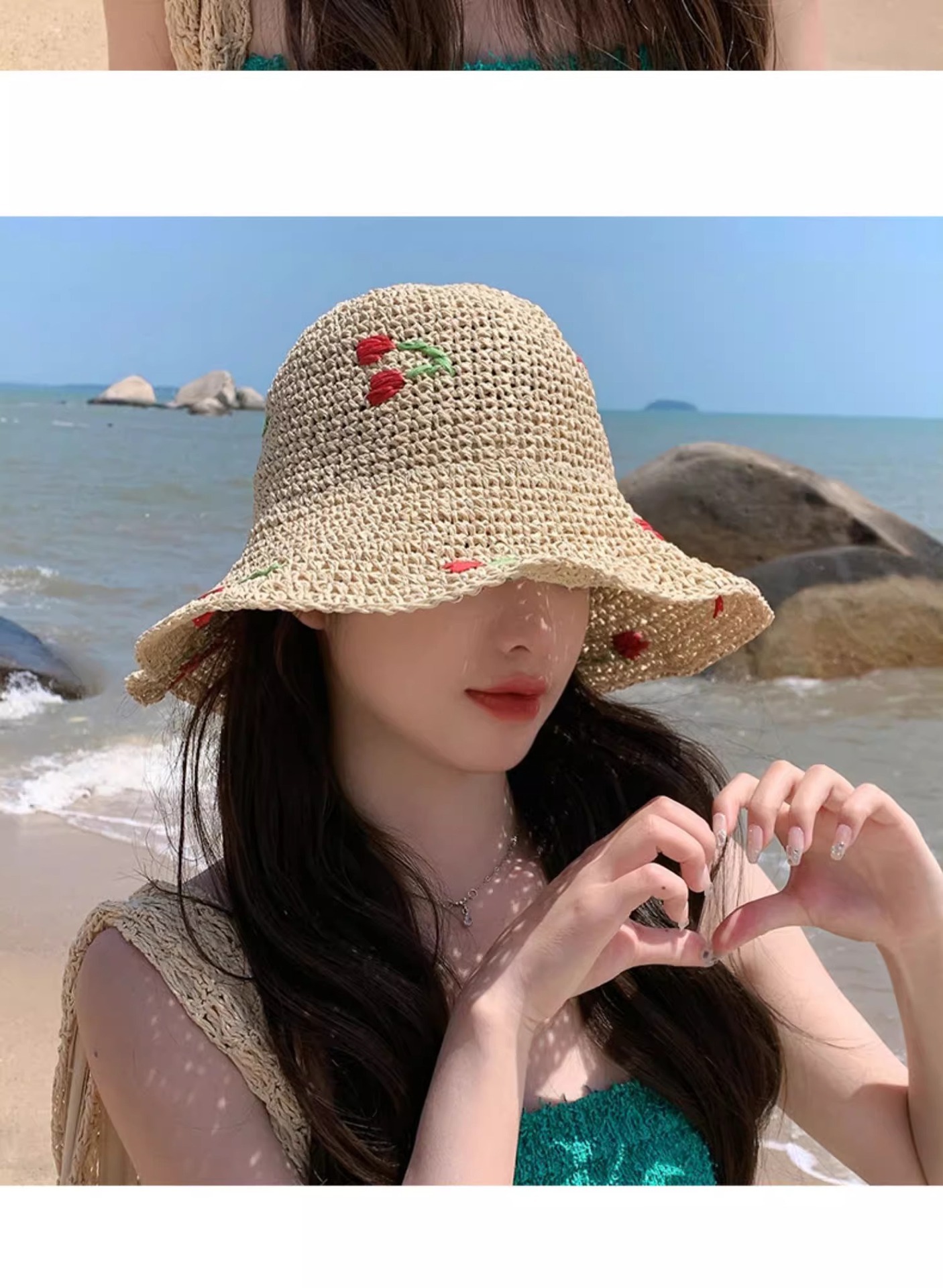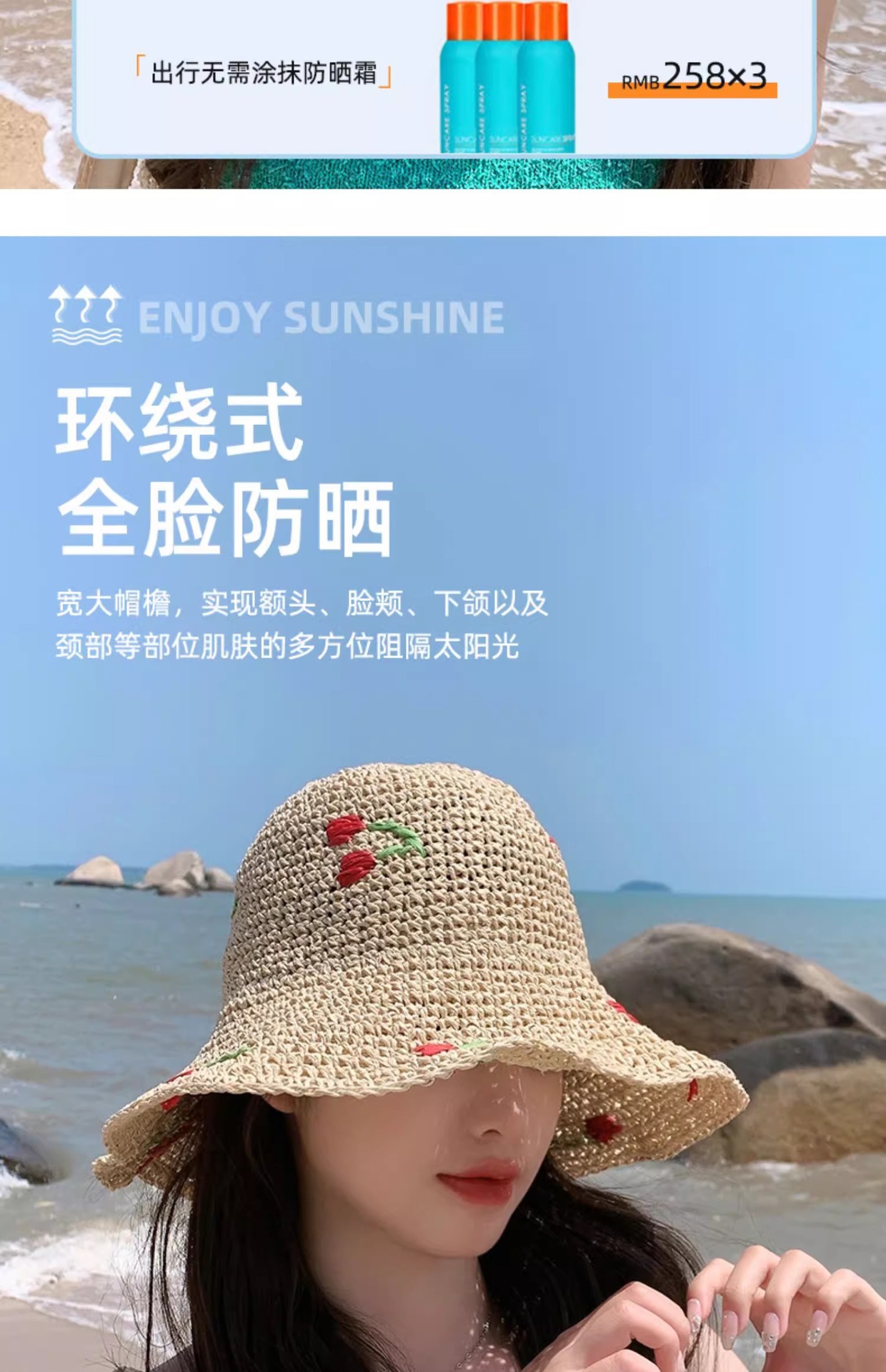 韩版可爱樱桃草编渔夫帽子女夏季防晒海边度假沙滩大檐遮太阳草帽