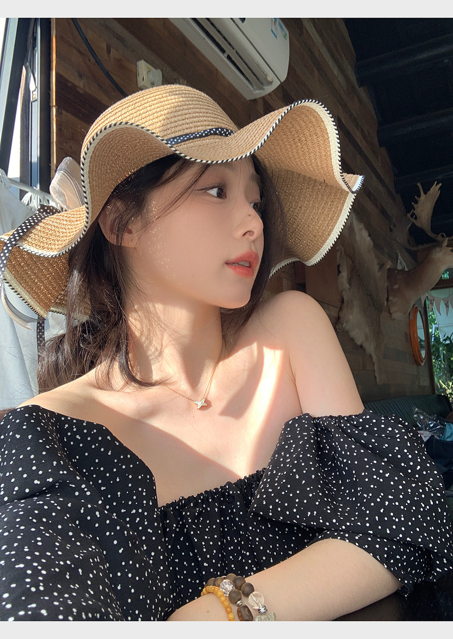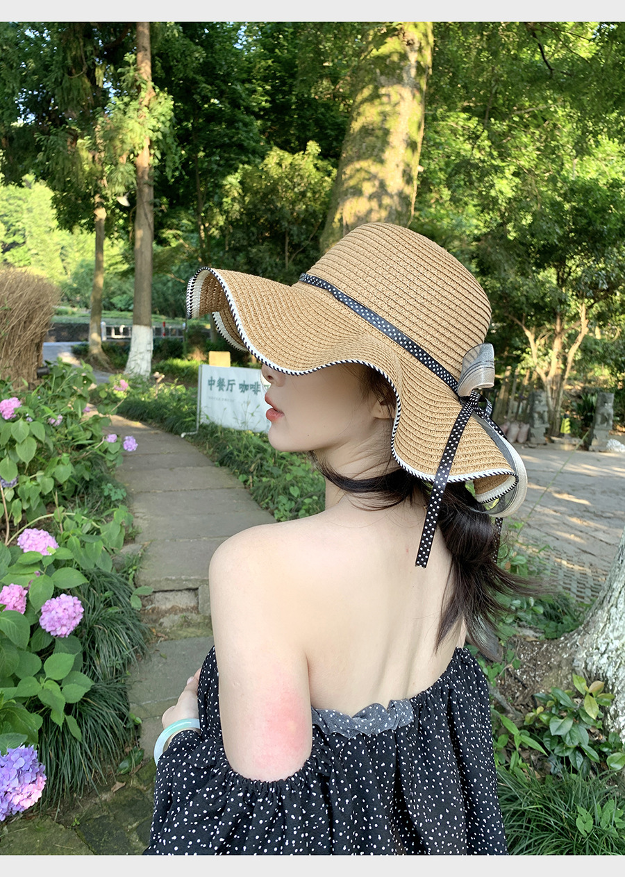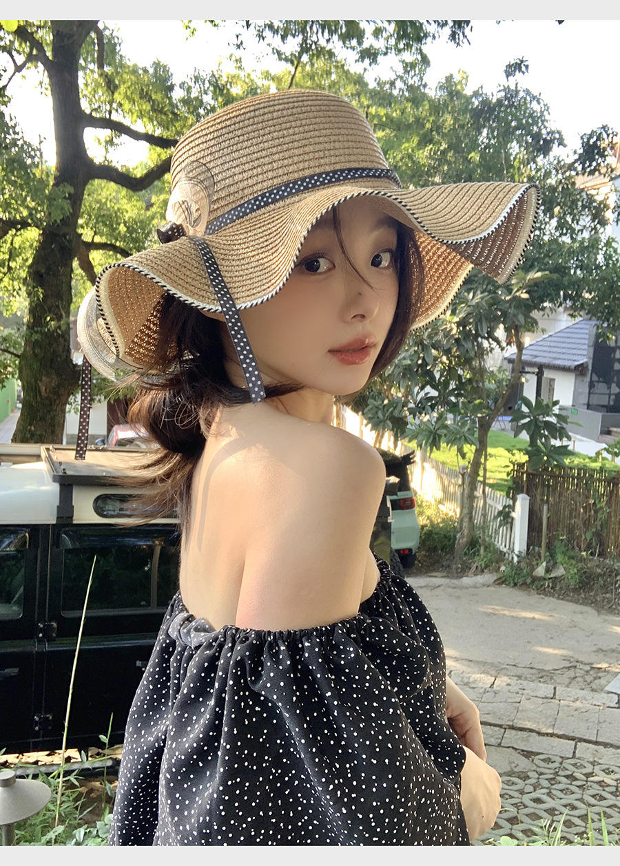 草帽女蕾丝蝴蝶结拉菲草帽女2024新款夏季海边沙滩度假大檐可折叠