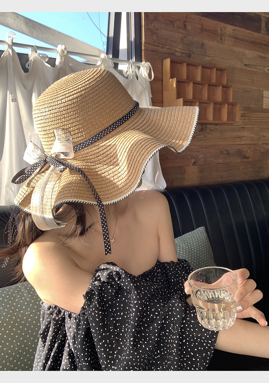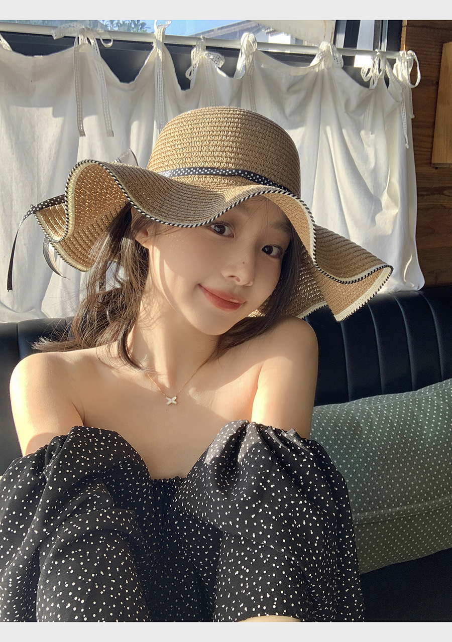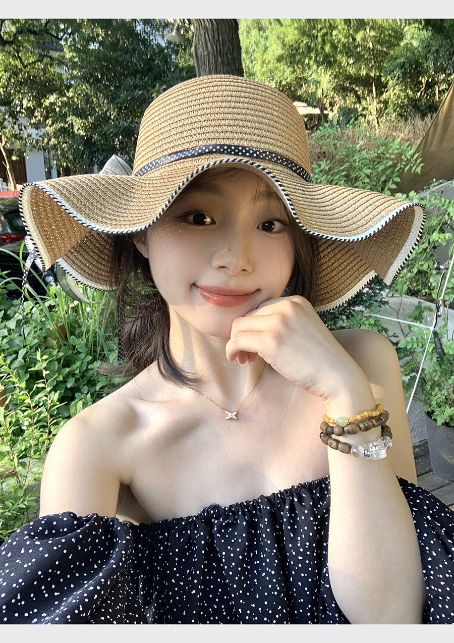 草帽女蕾丝蝴蝶结拉菲草帽女2024新款夏季海边沙滩度假大檐可折叠