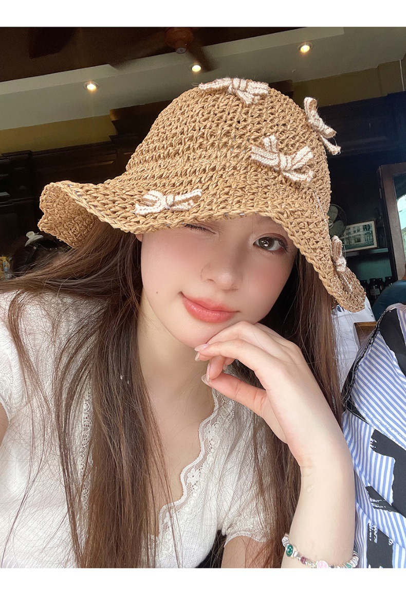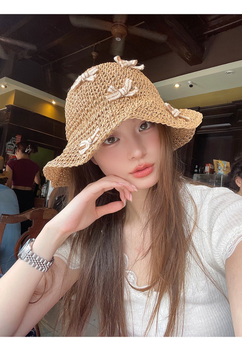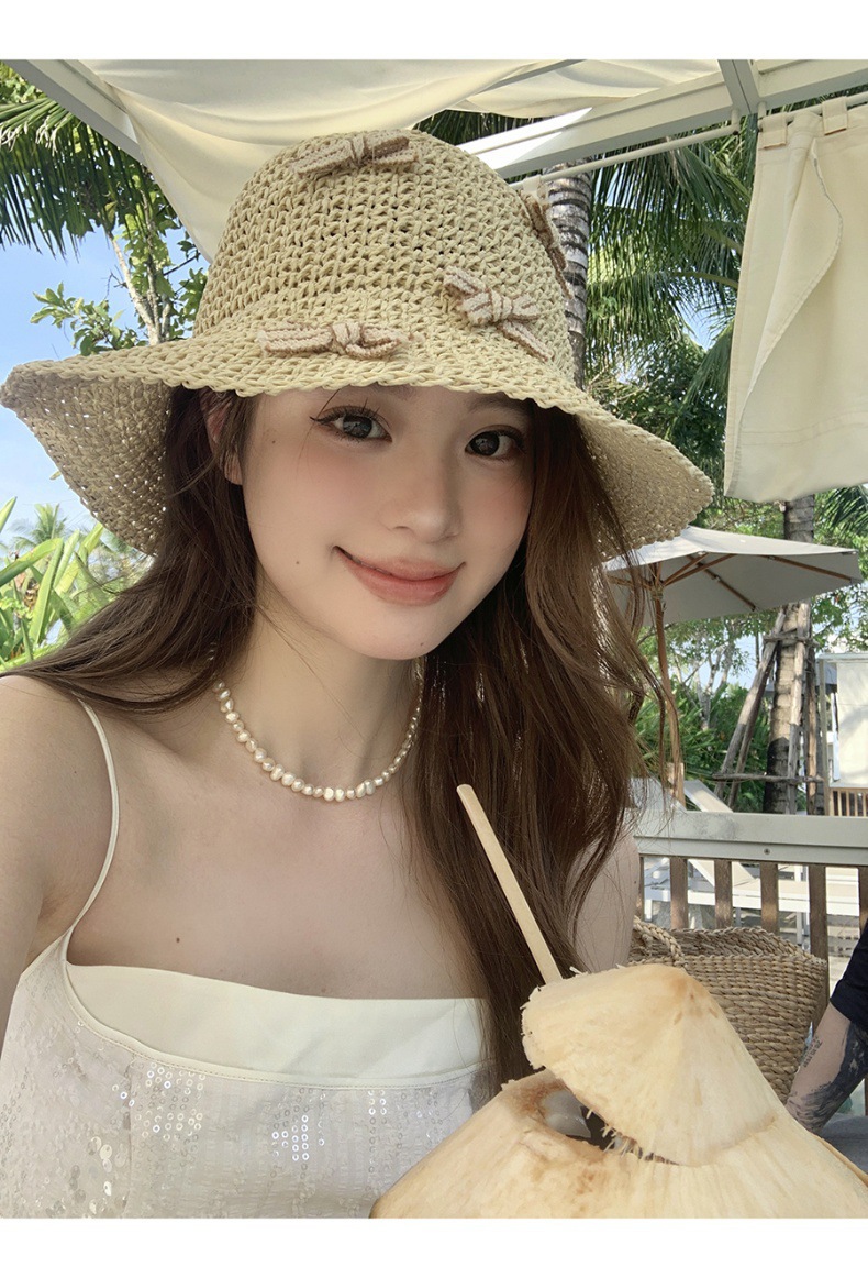 韩版遮阳草帽女甜美蝴蝶结渔夫帽草编帽海边度假防晒太阳帽