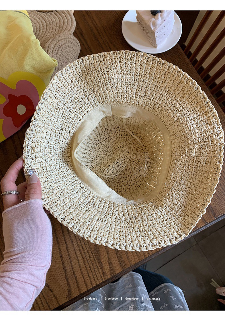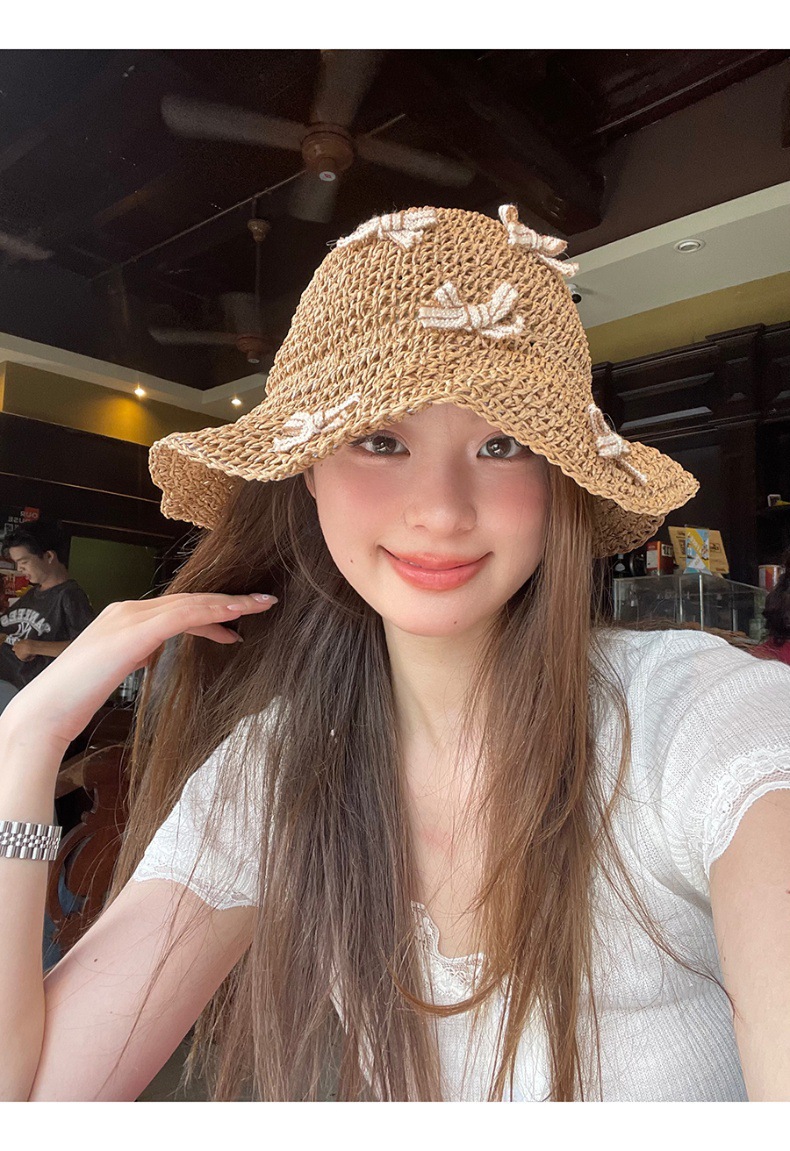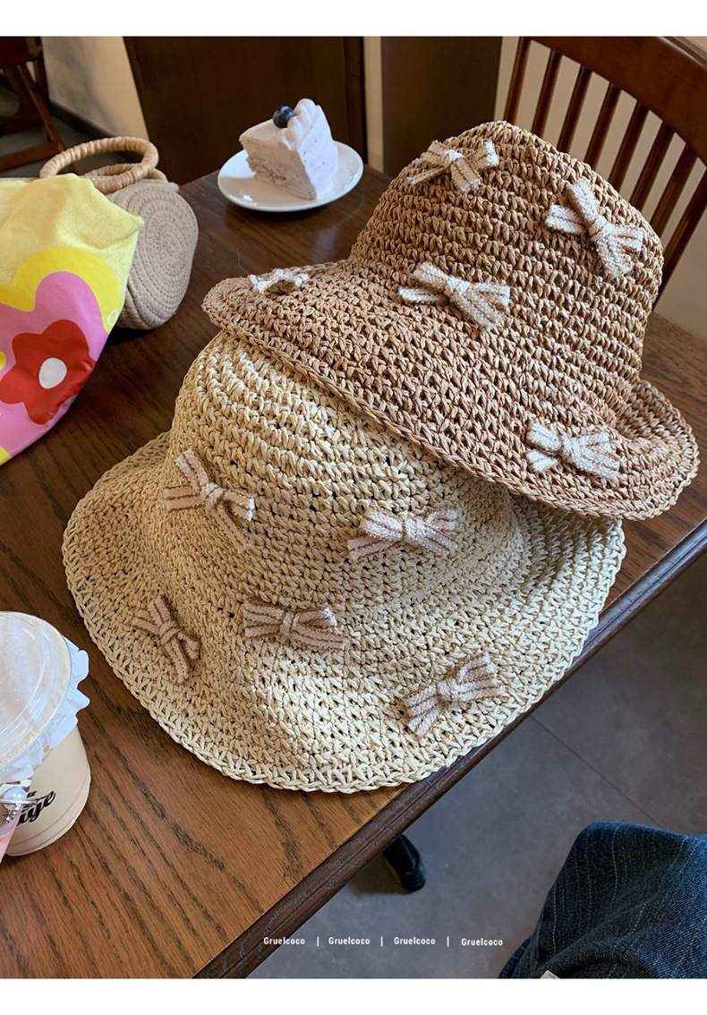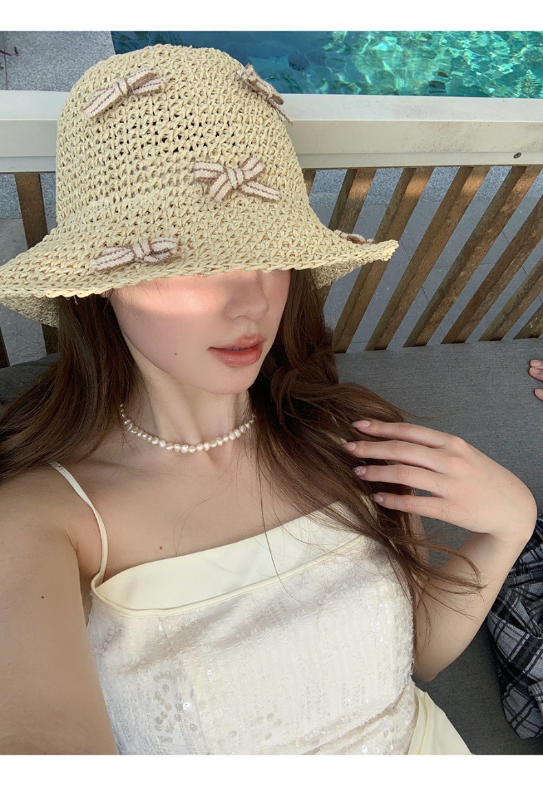韩版遮阳草帽女甜美蝴蝶结渔夫帽草编帽海边度假防晒太阳帽
