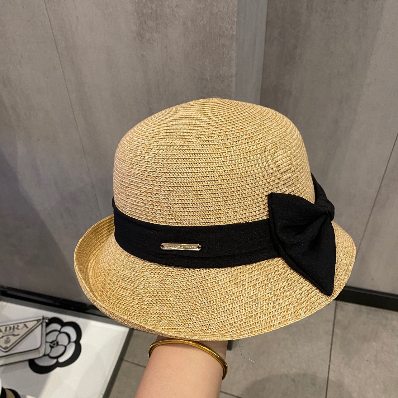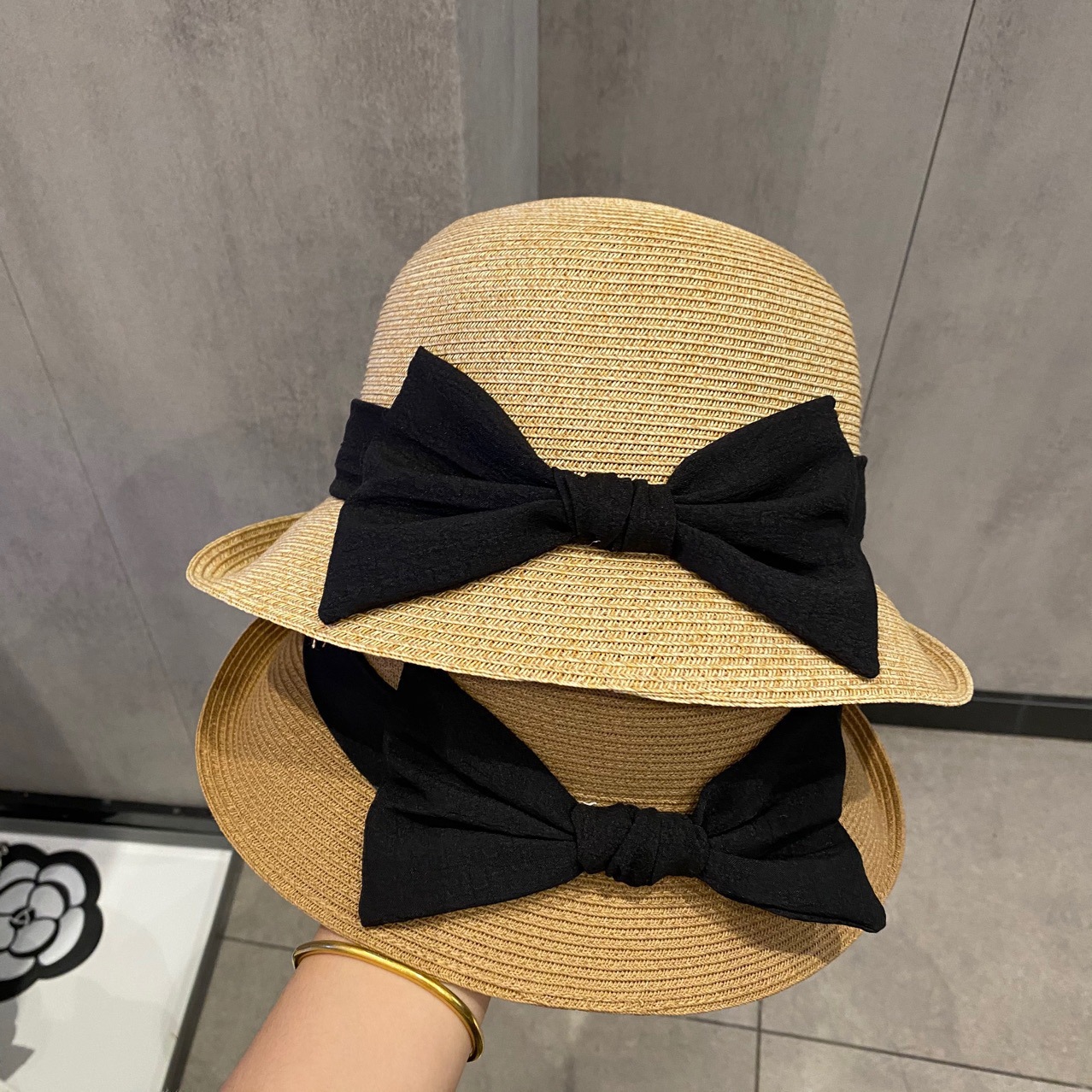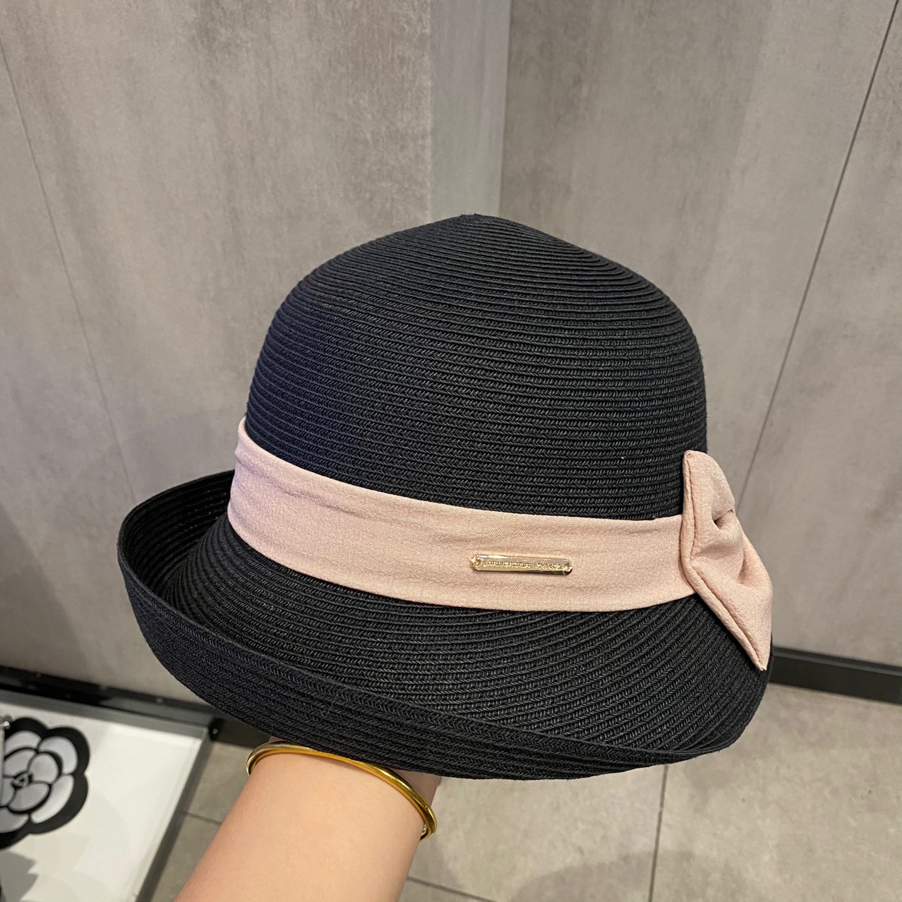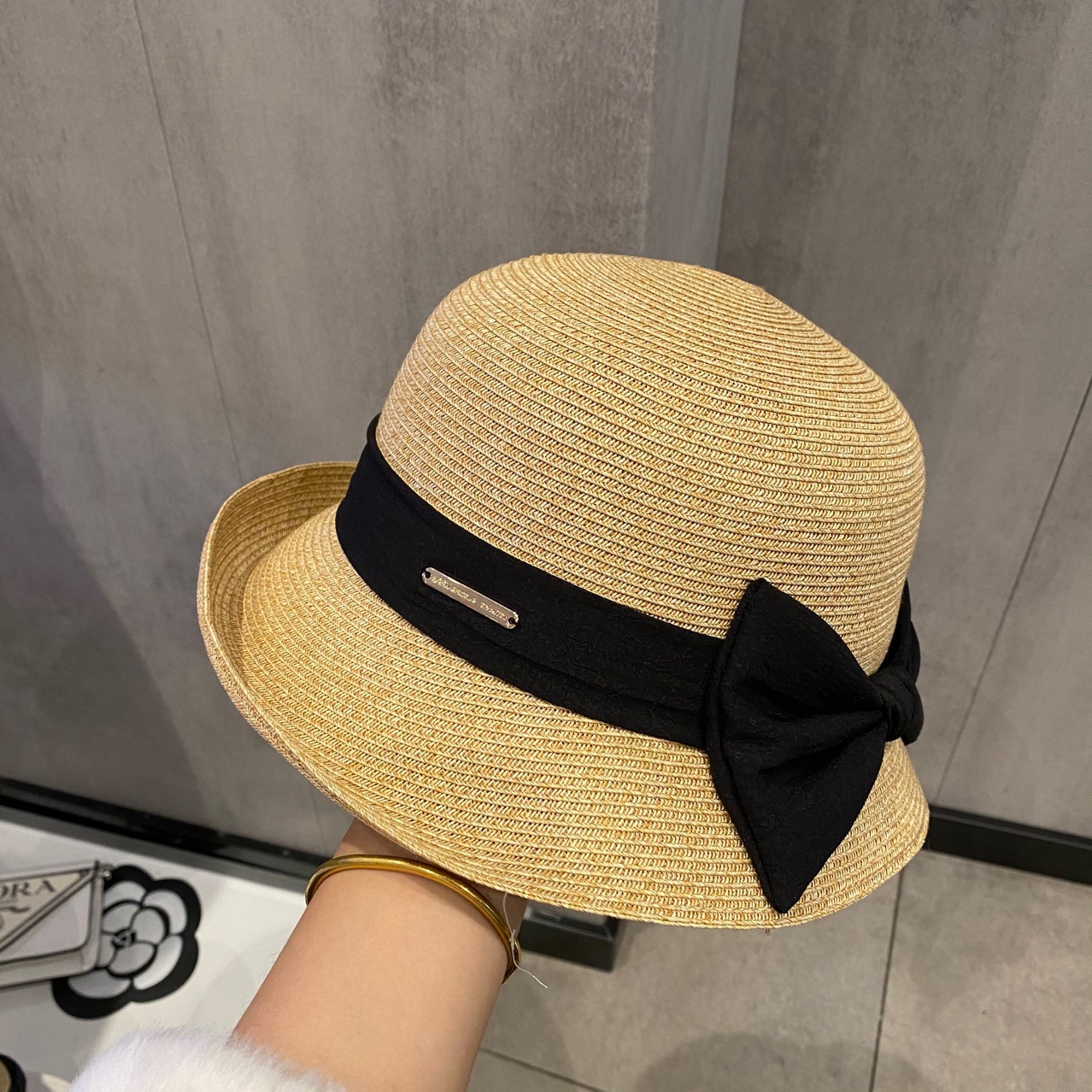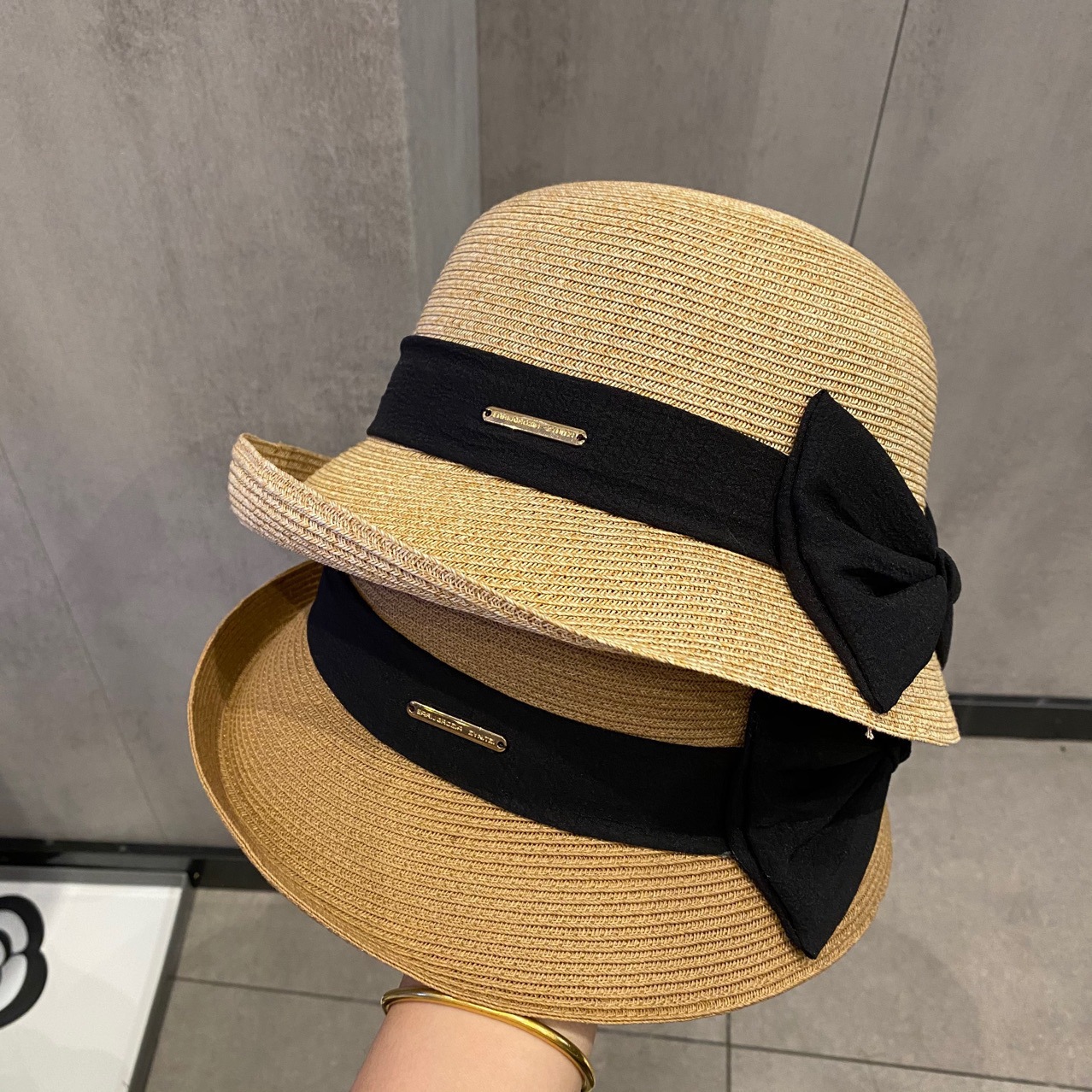 日系草帽高端细草翘边蝴蝶结女士小礼帽小沿草帽防晒遮阳盆帽渔夫