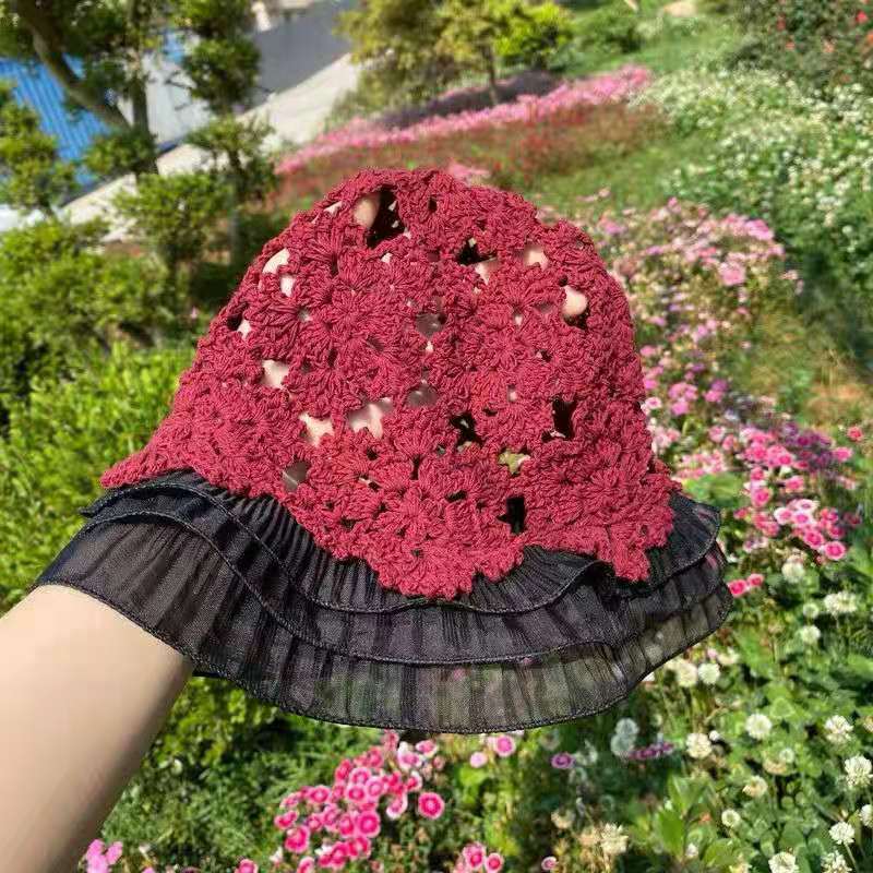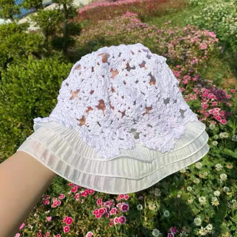 草帽夏季手工清新荷叶边蕾丝镂空渔夫帽子沙滩遮阳帽防晒花边帽潮