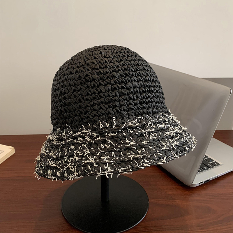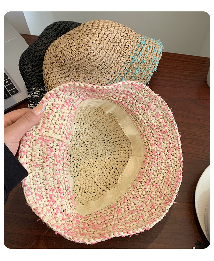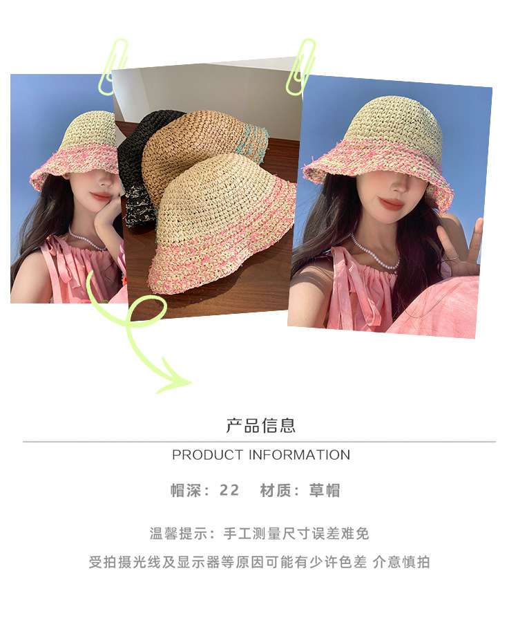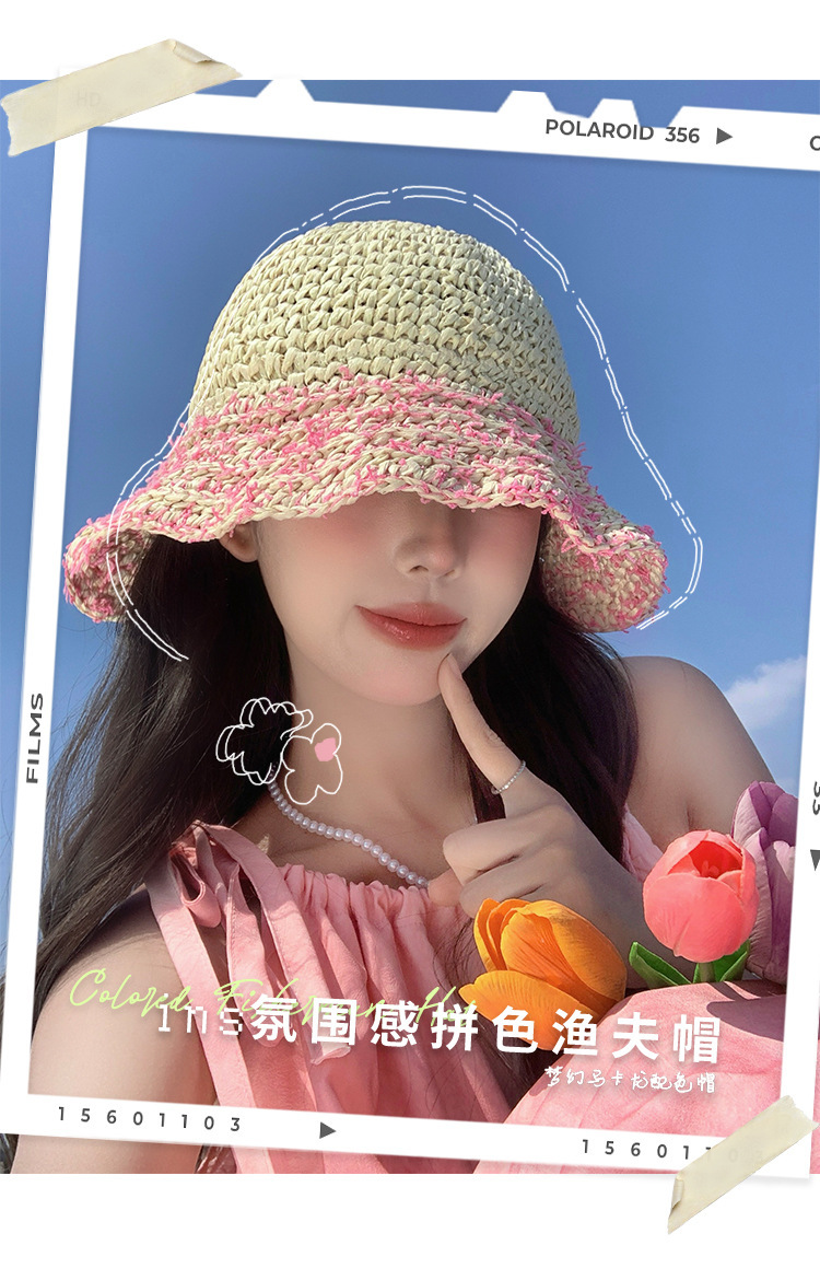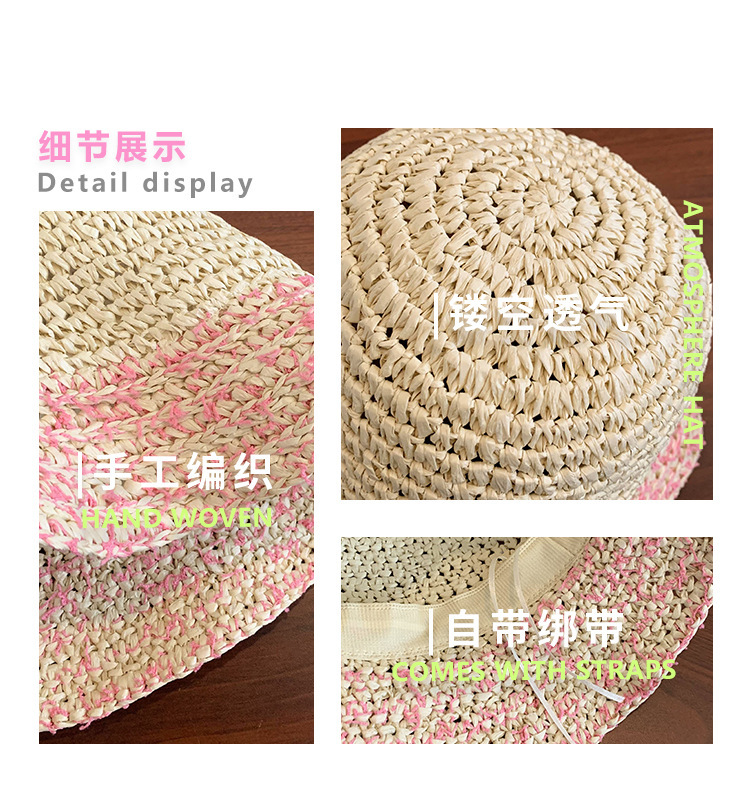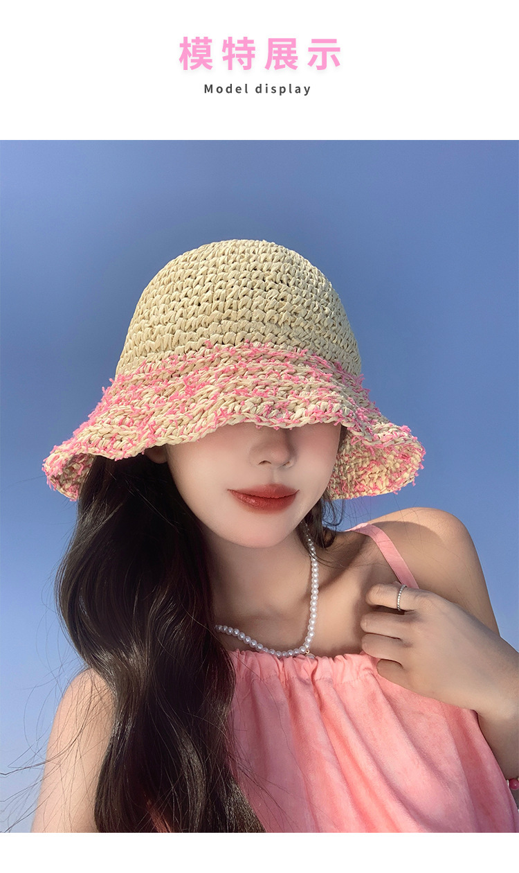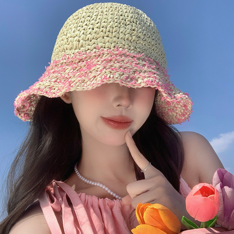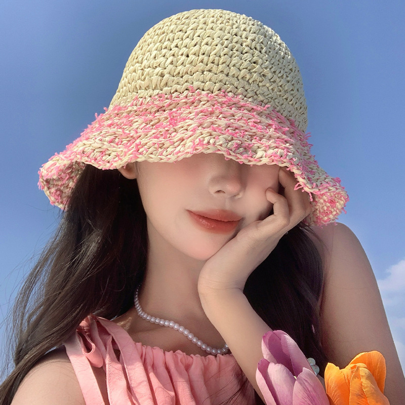 草帽女夏季法式粉色海边出游沙滩帽镂空草编遮阳帽可折叠防晒帽子