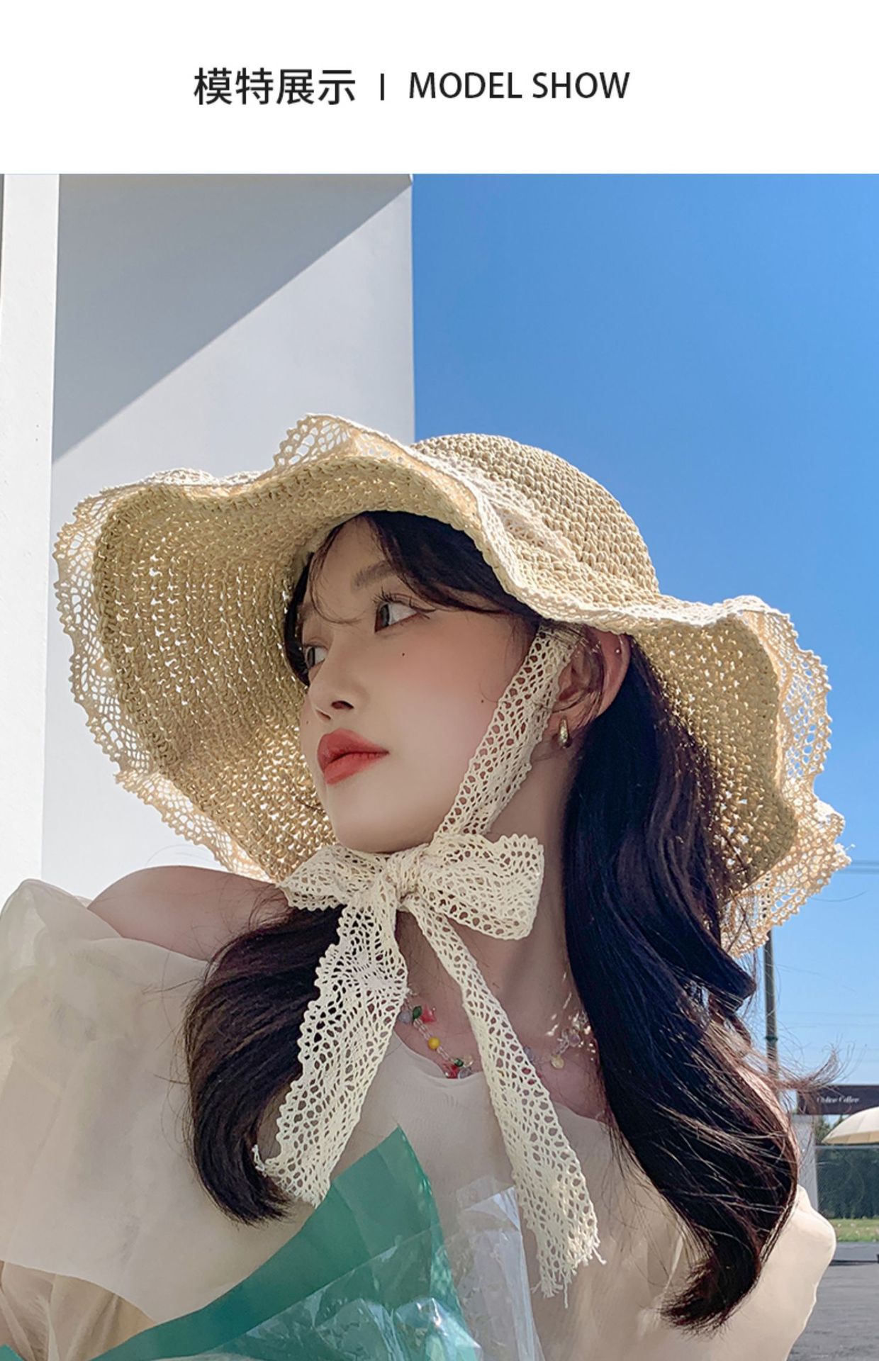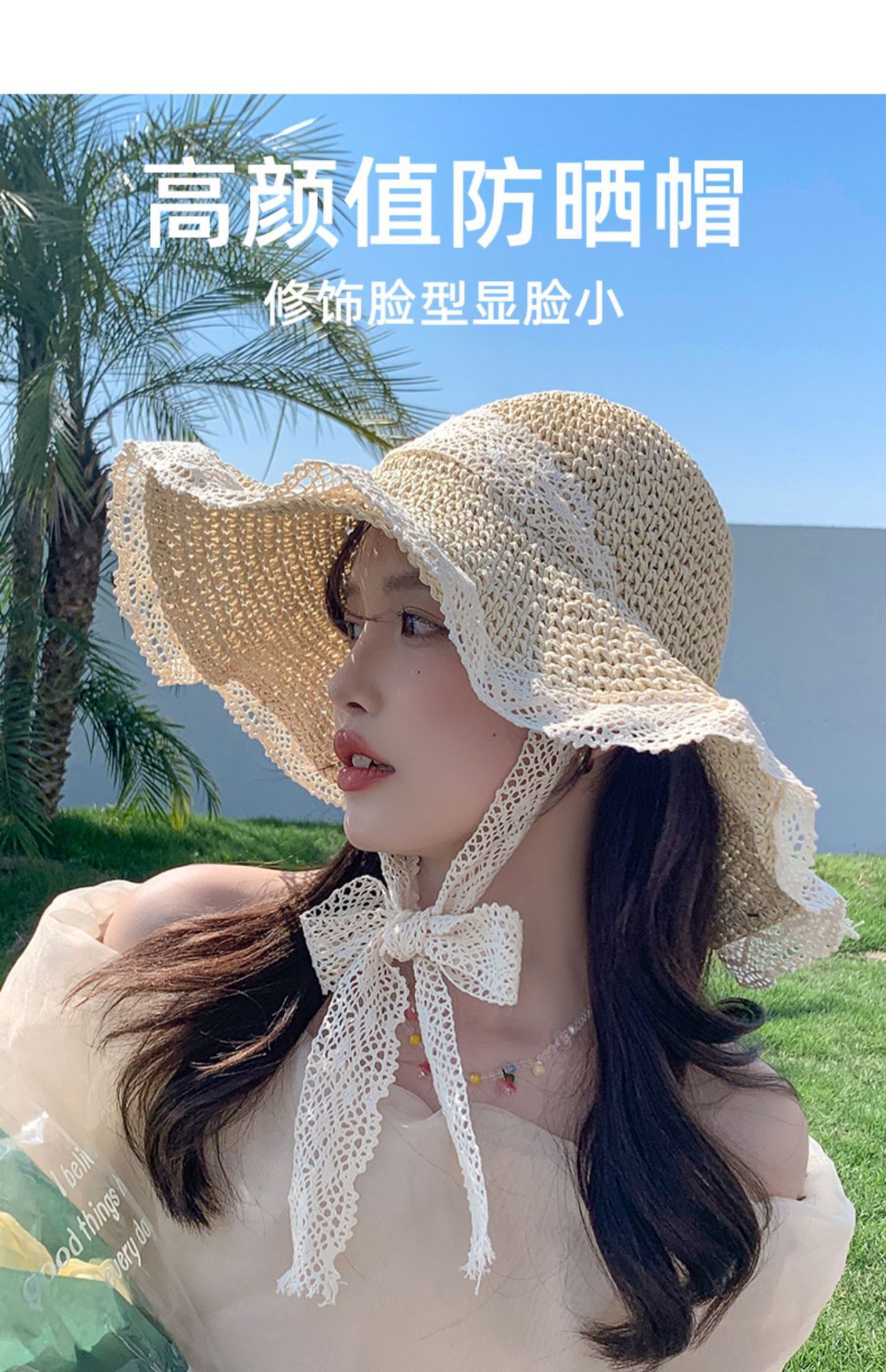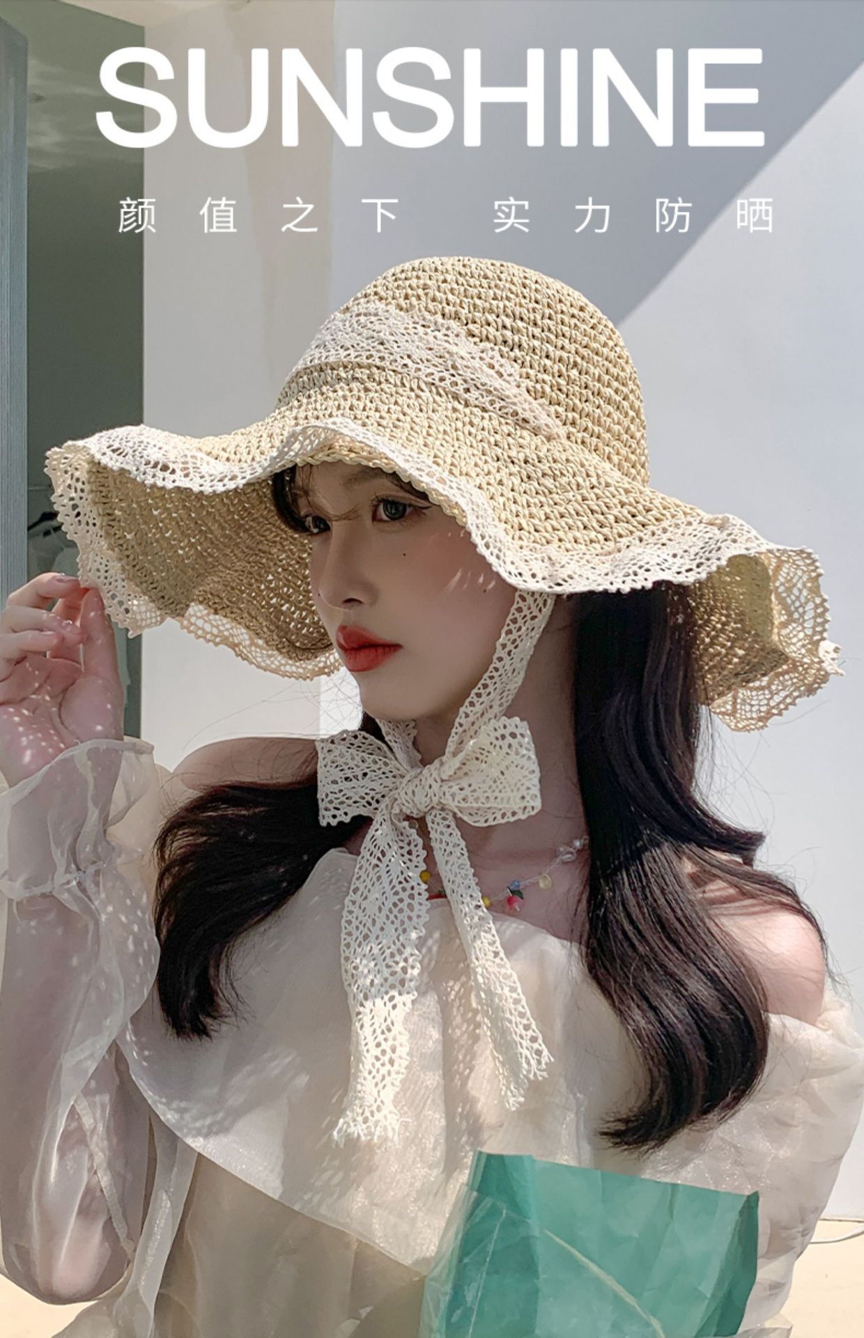 草帽女夏季度假海边沙滩防晒太阳帽日系ins风蕾丝边大帽檐显脸小