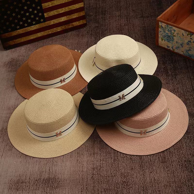草帽边遮阳防晒气质织带M标平顶草帽海休闲帽大众细带编织