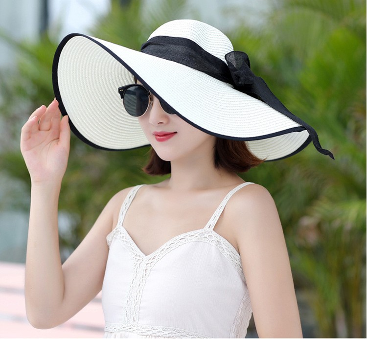 备用新款时尚夏天防晒大沿草帽包边飘带单色女士出游度假遮阳沙滩