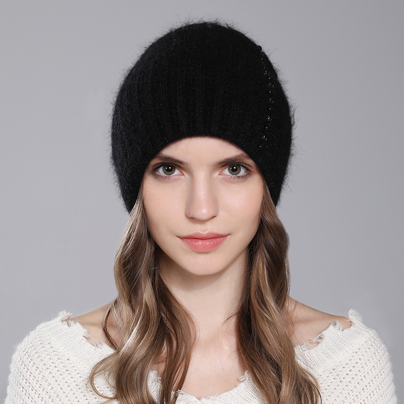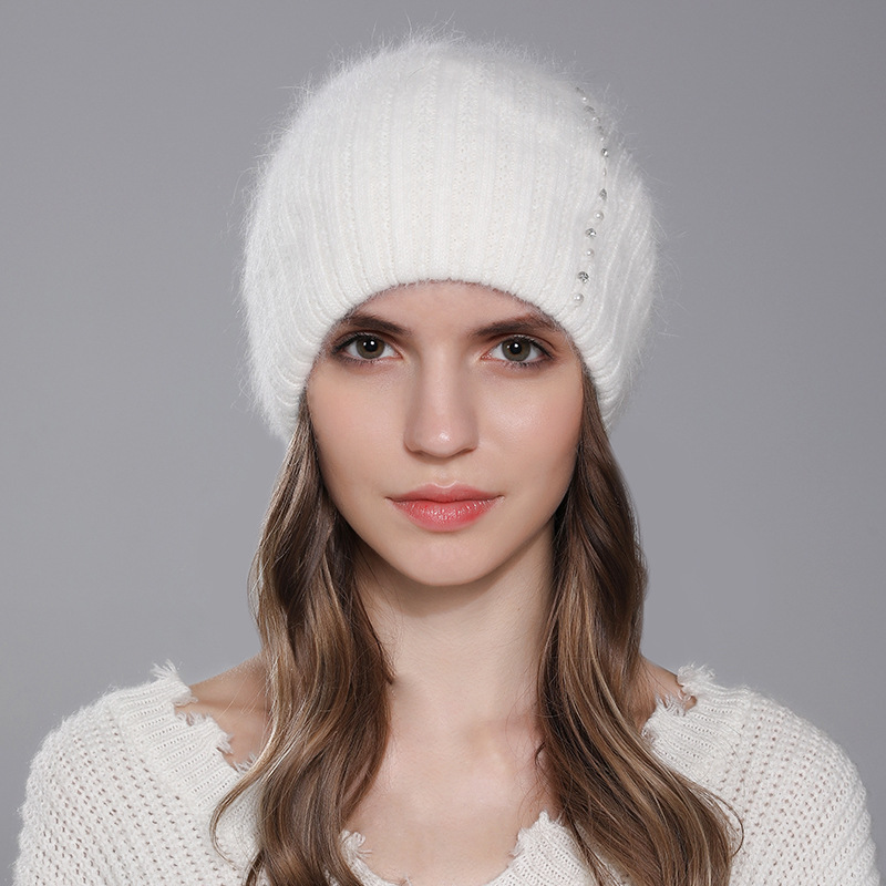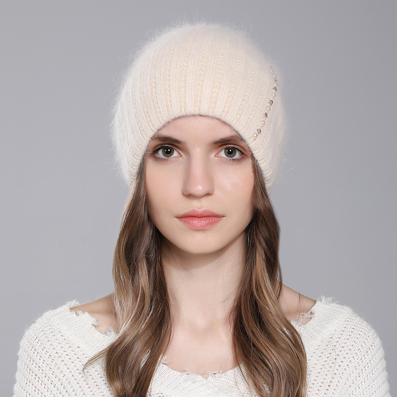 针织兔毛帽子女冬季保暖毛线帽时尚珍珠点缀女士百搭套头帽外贸款