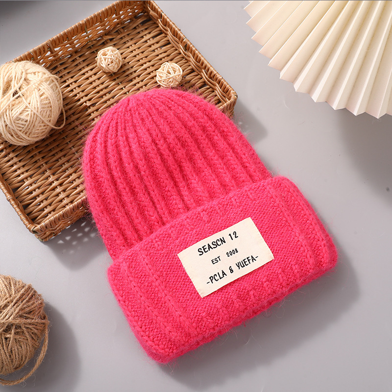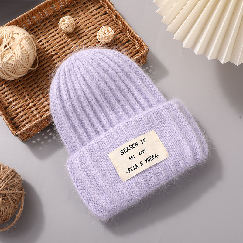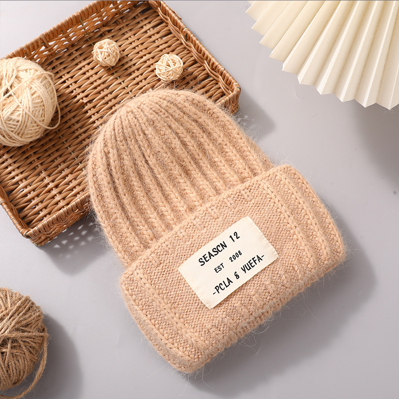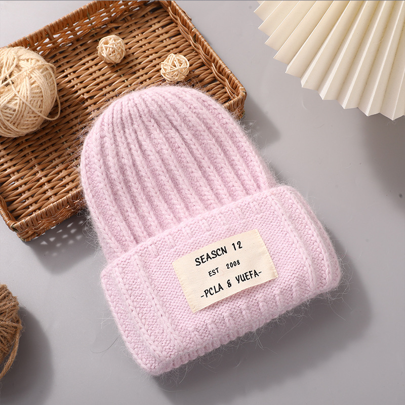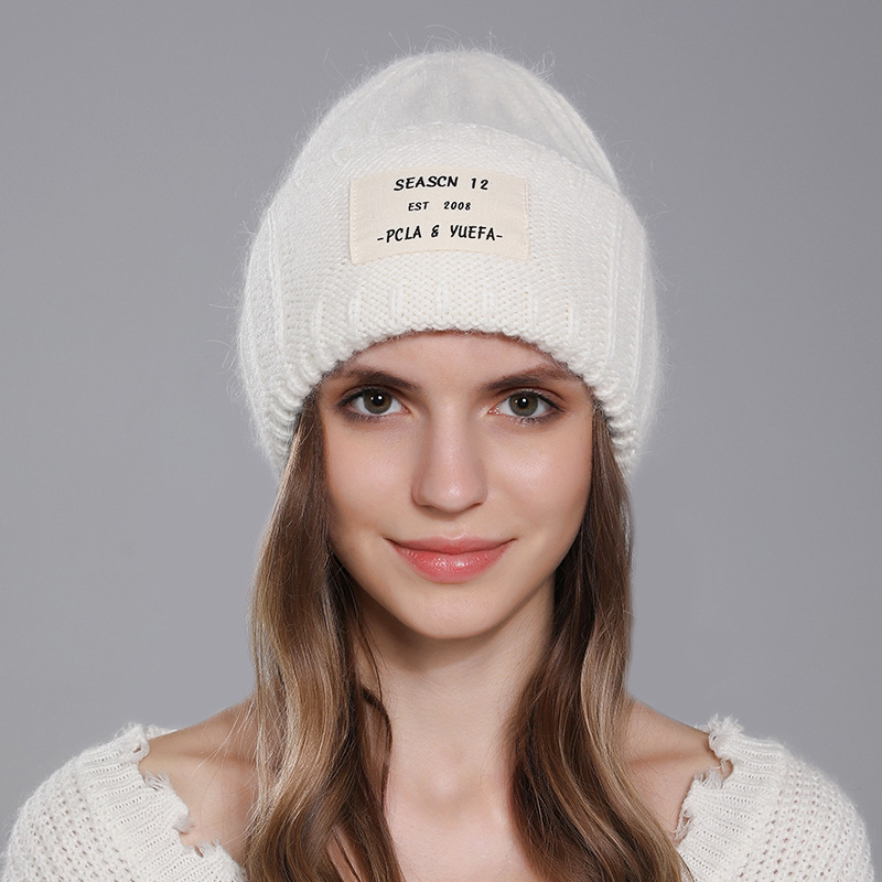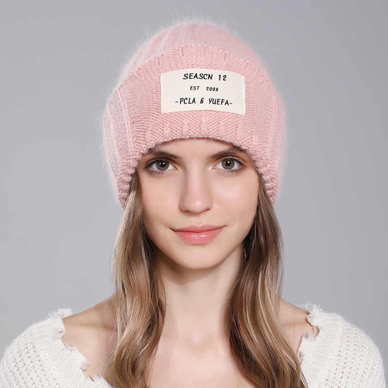 外贸新款冬季兔毛针织帽时尚女士贴布字母毛线帽百搭女套头帽跨境
