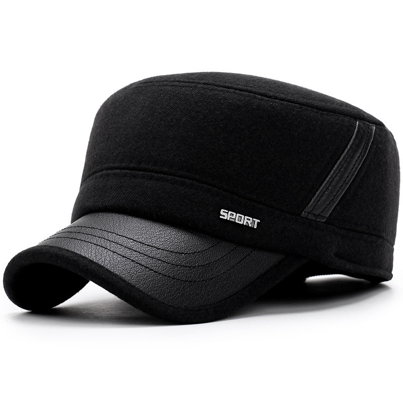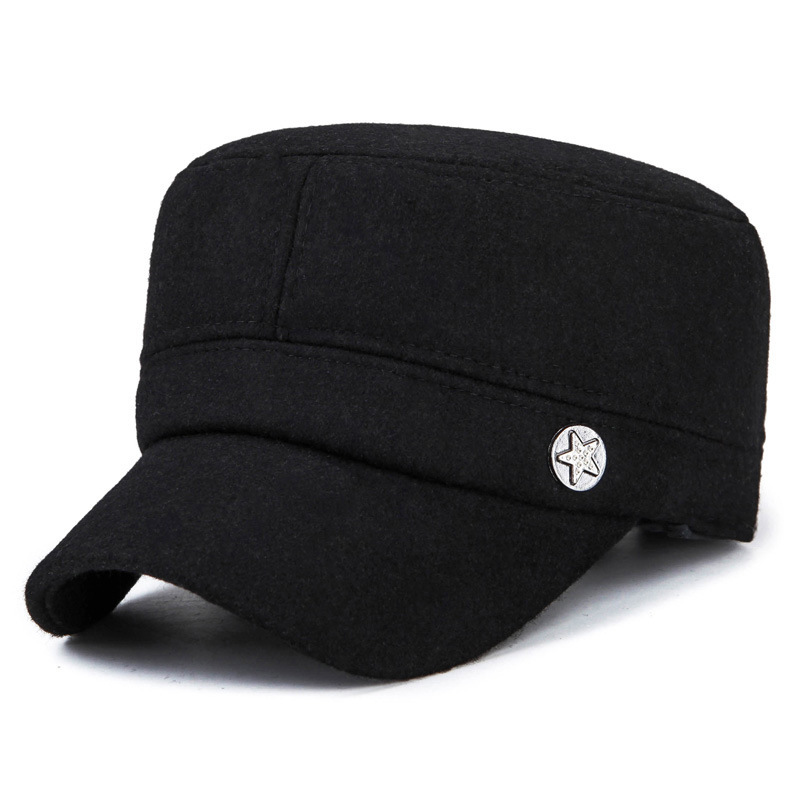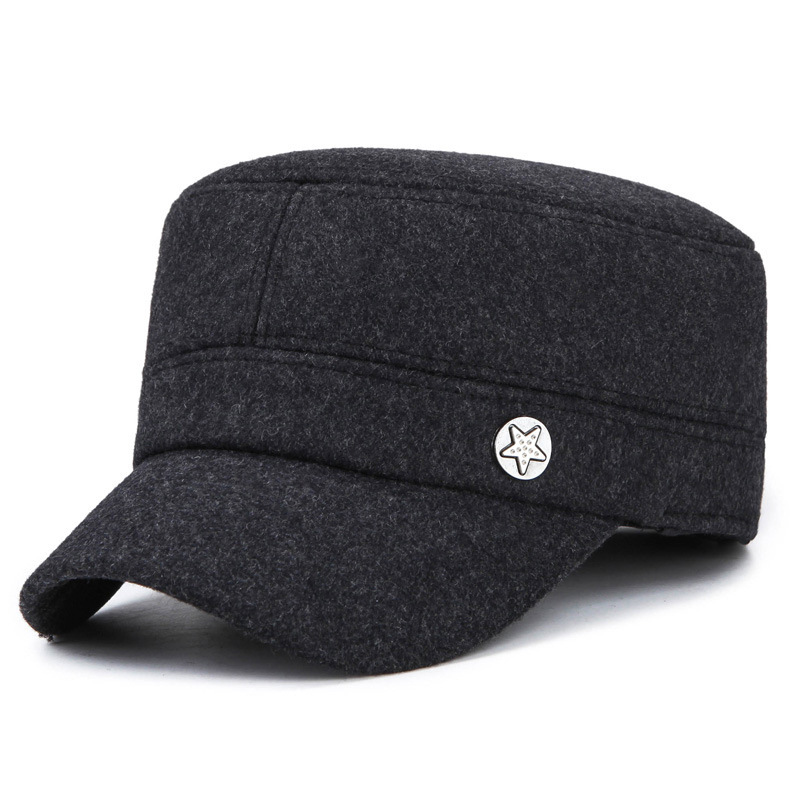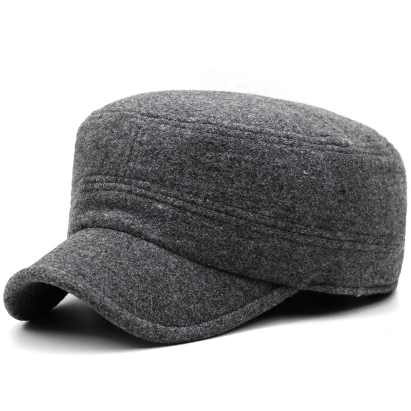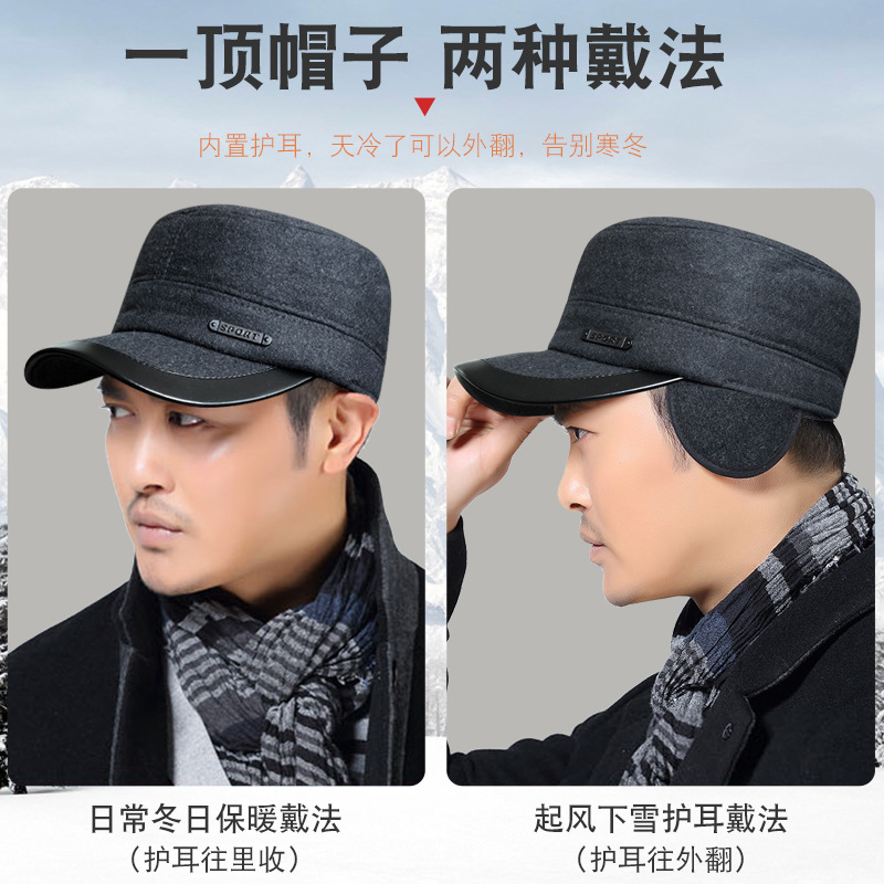 帽子男士秋冬中老年毛呢保暖军帽护耳加厚平顶帽老人棉帽子男冬季