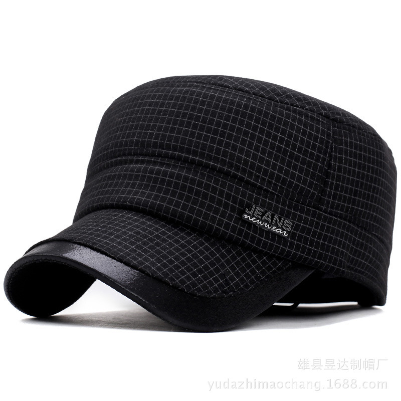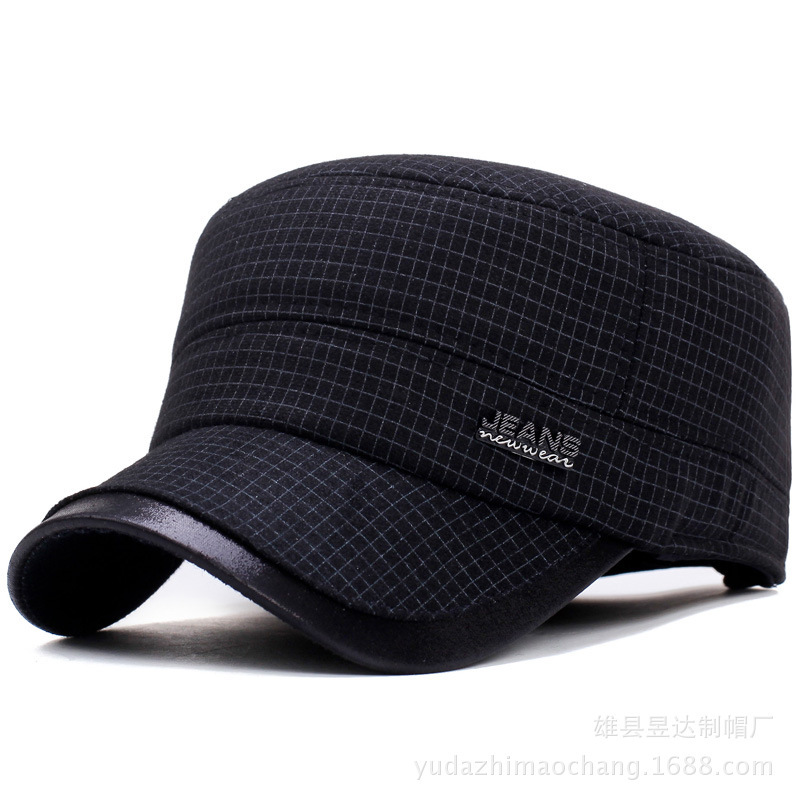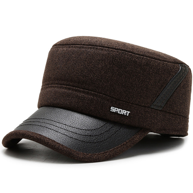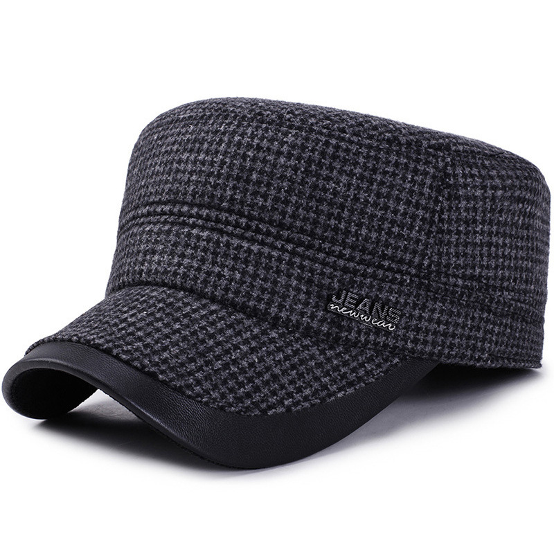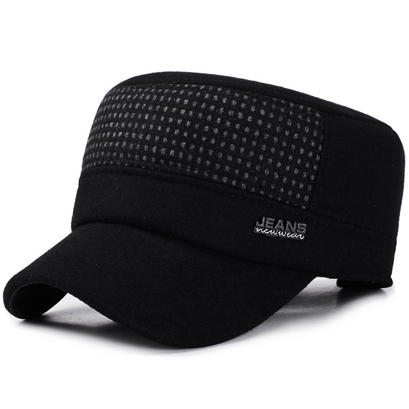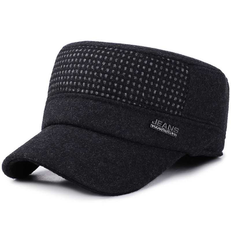 帽子男士秋冬中老年毛呢保暖军帽护耳加厚平顶帽老人棉帽子男冬季