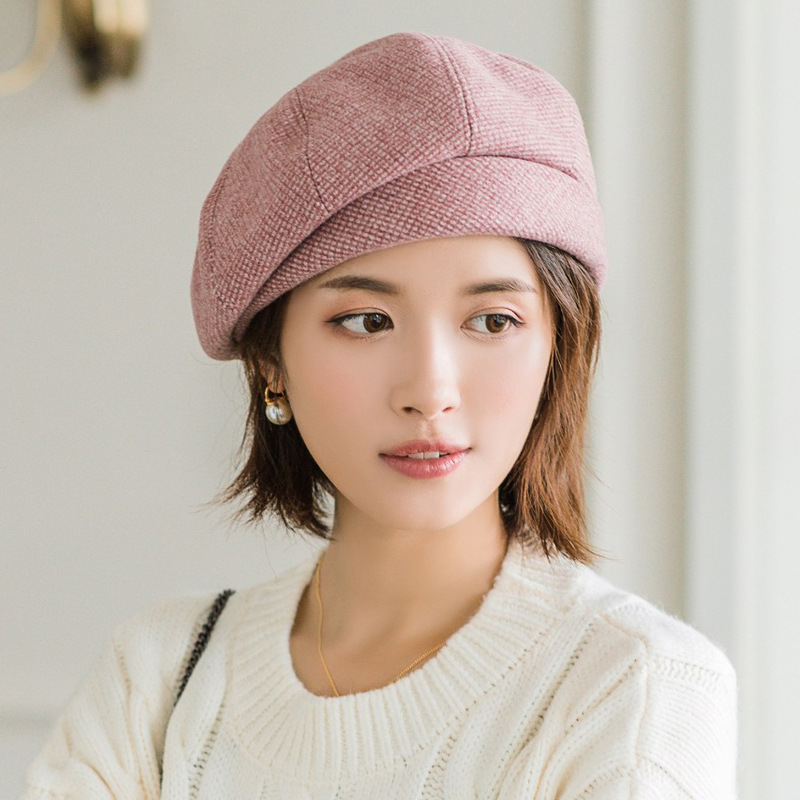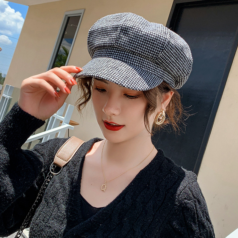 贝雷帽子女秋冬韩版百搭日系千鸟格贝蕾帽复古八角帽女英伦画家帽