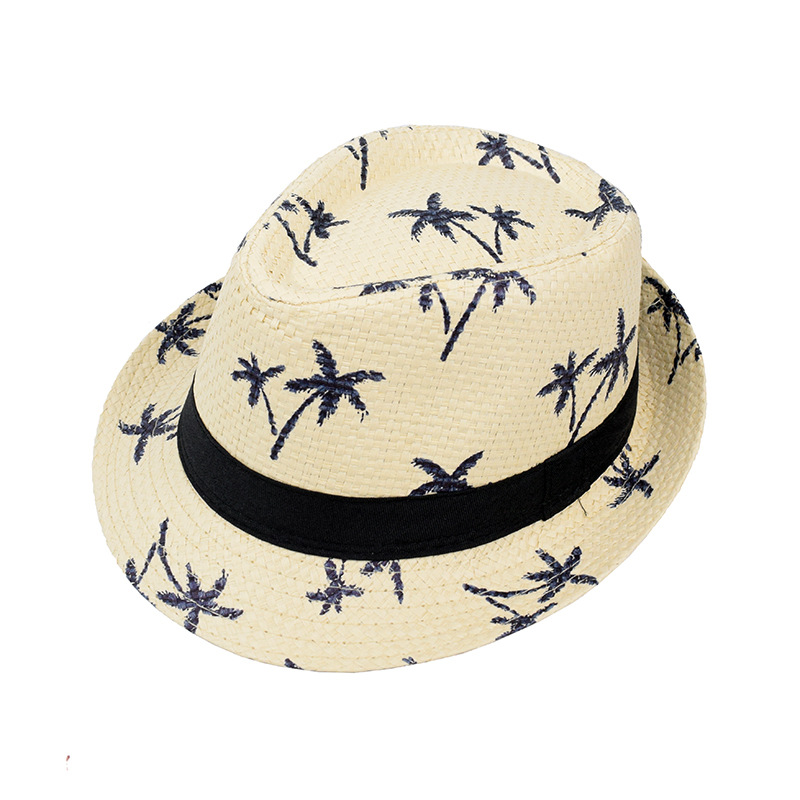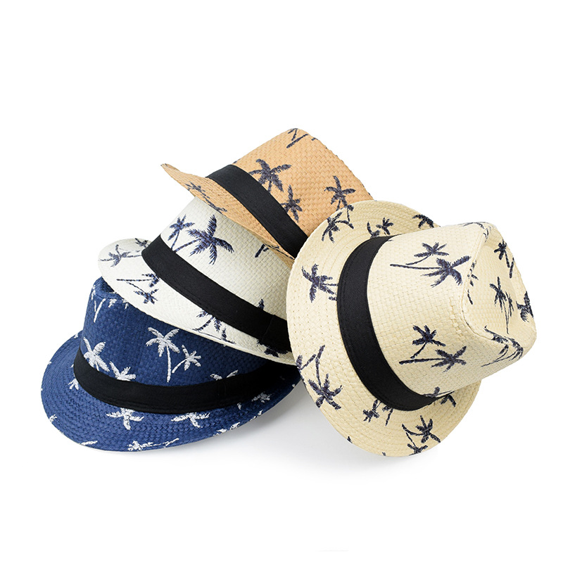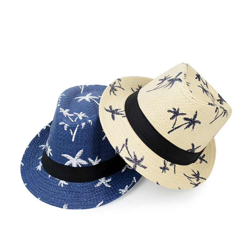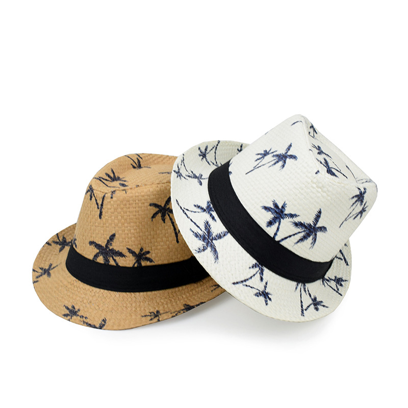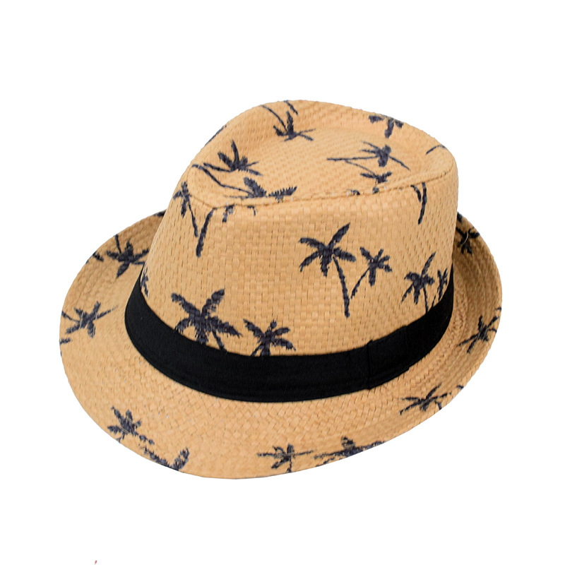 欧美热销礼帽男小檐纸草爵士帽夏季草编遮阳椰子树印刷沙滩防晒帽