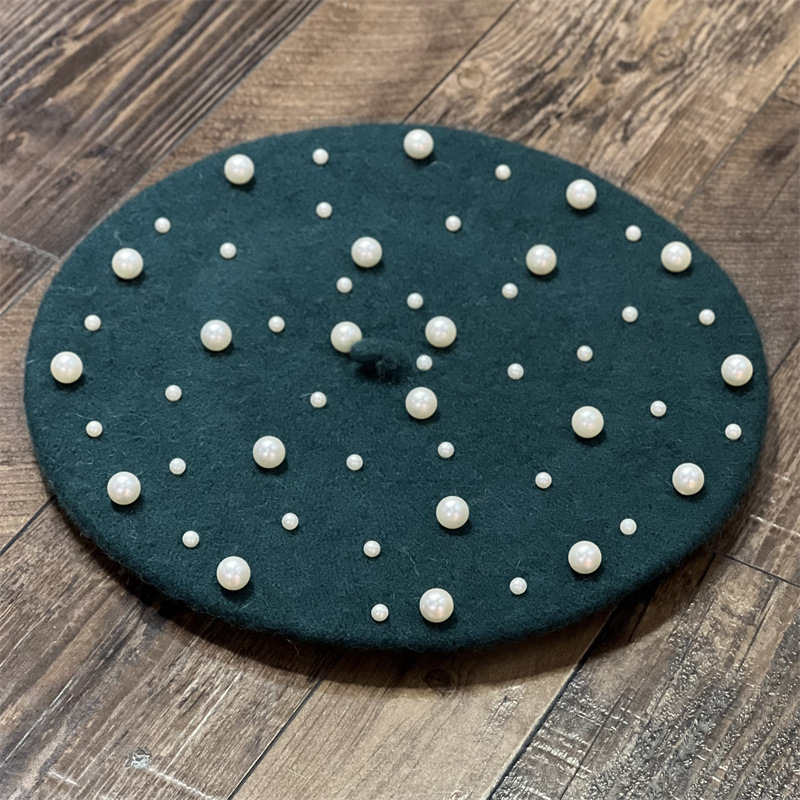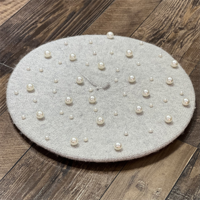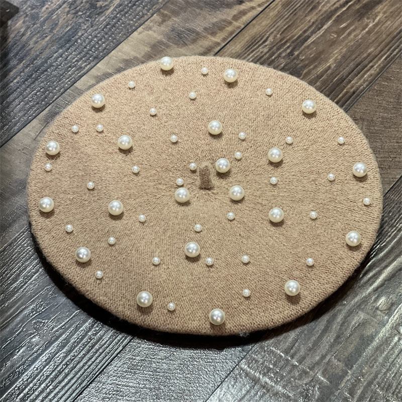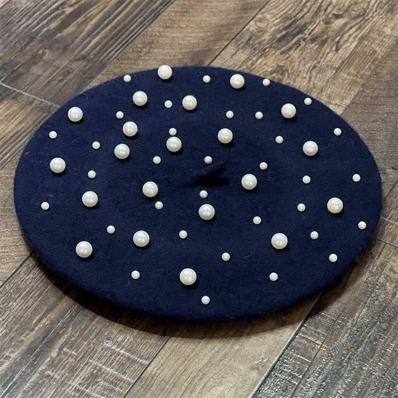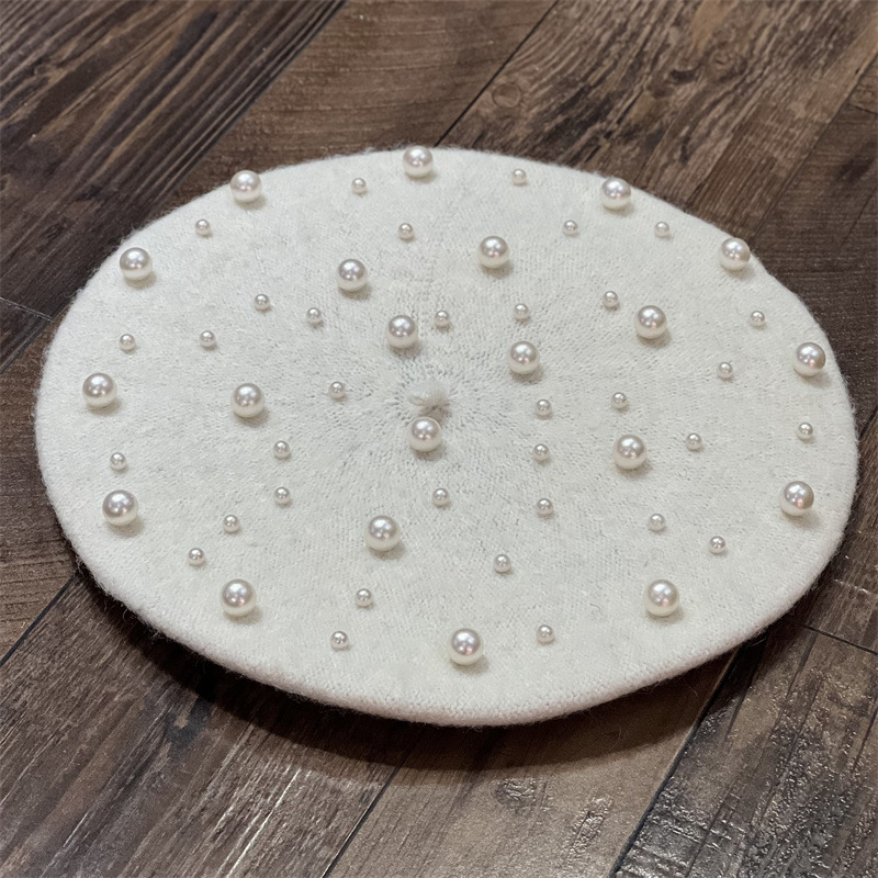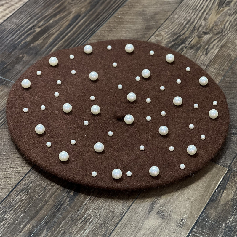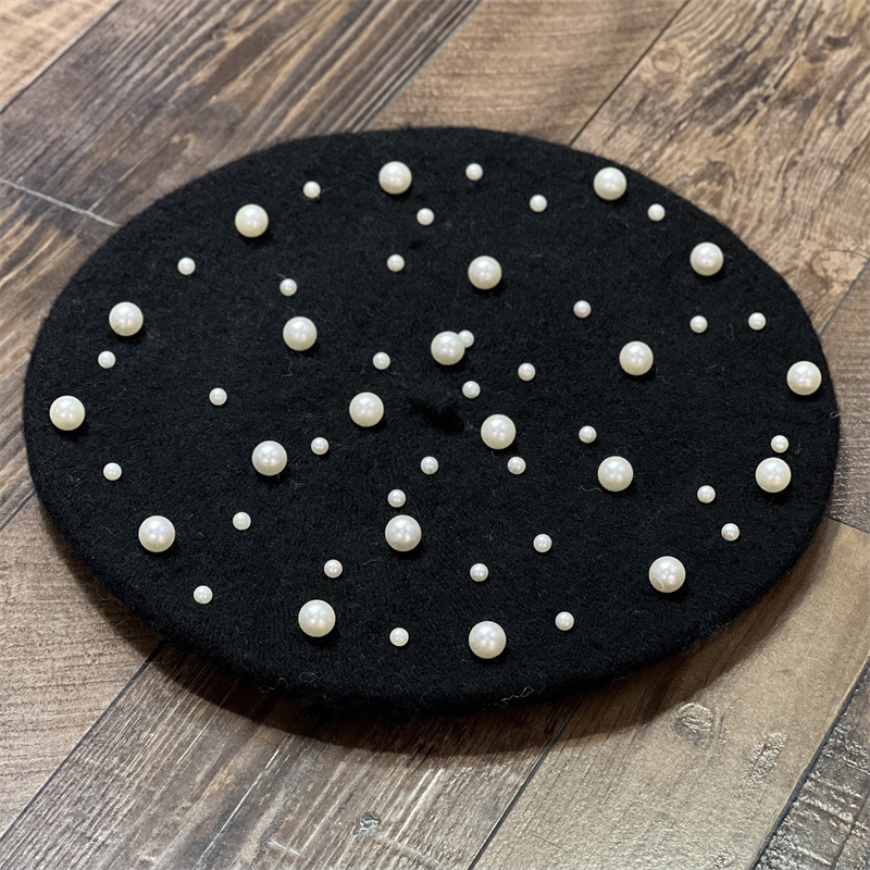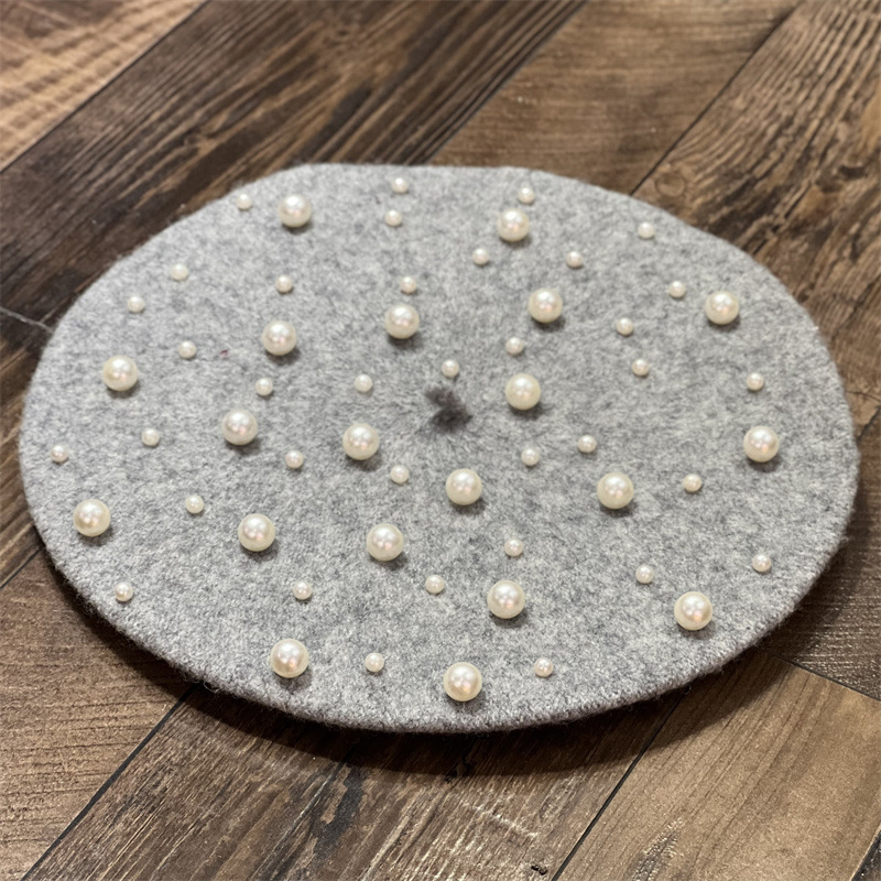 帽子跨境奢华超多珍珠贝雷帽女秋冬羊毛呢画家帽大头围时尚八角帽