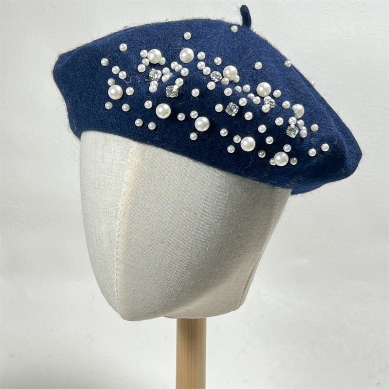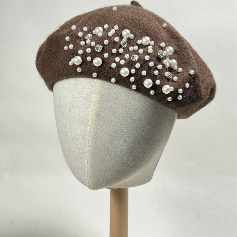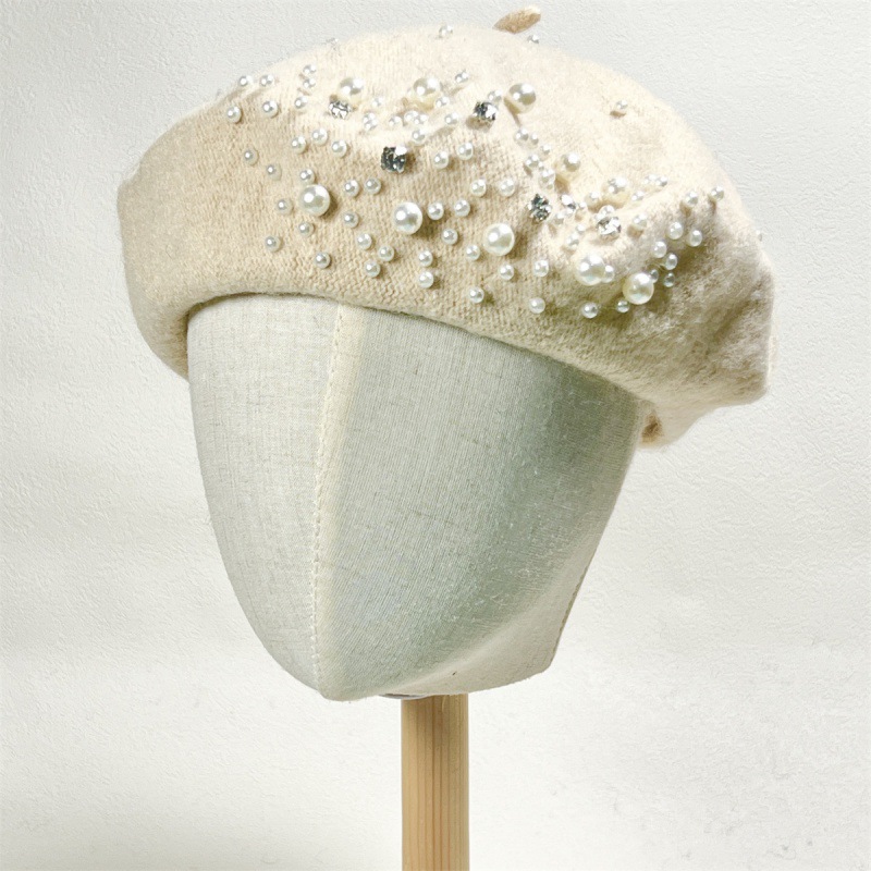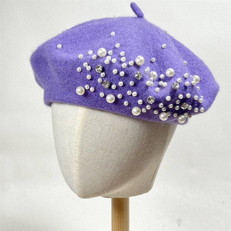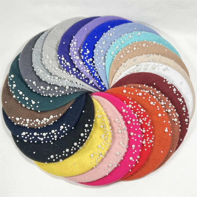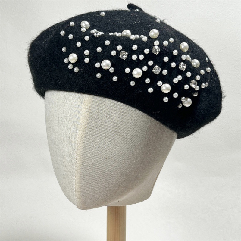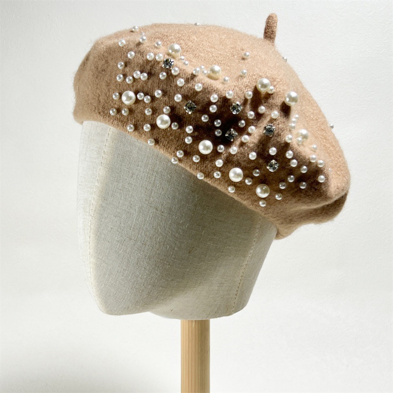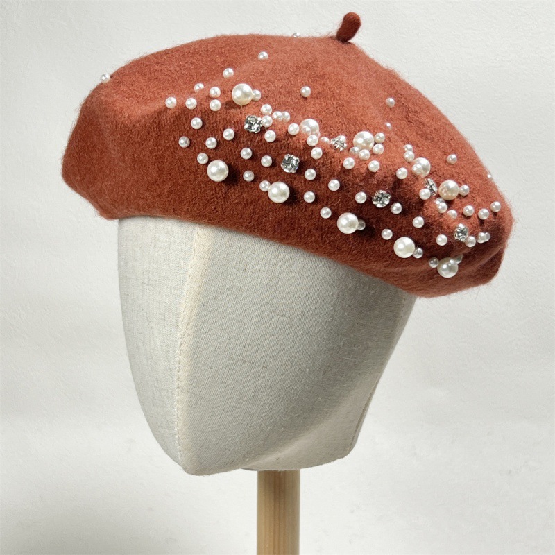 跨境热卖韩版羊毛呢珍珠水钻贝雷帽子女秋冬南瓜帽英伦复古画家帽