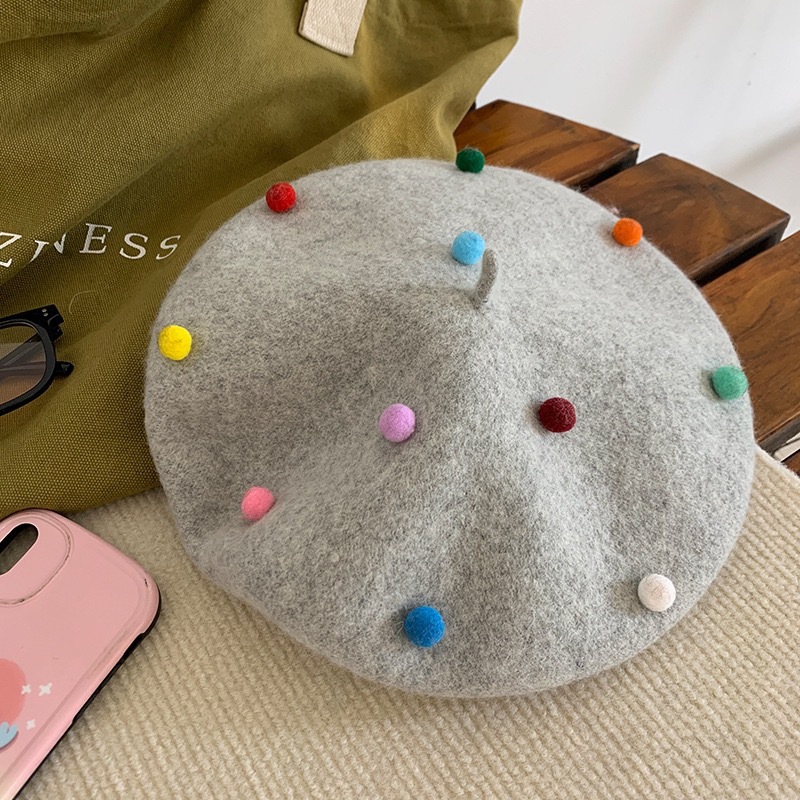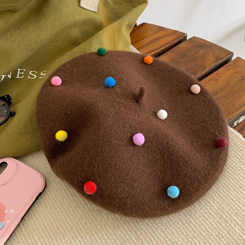 韩版秋冬保暖羊毛呢画家帽女可爱彩球点点贝雷帽保暖日系蓓蕾帽子