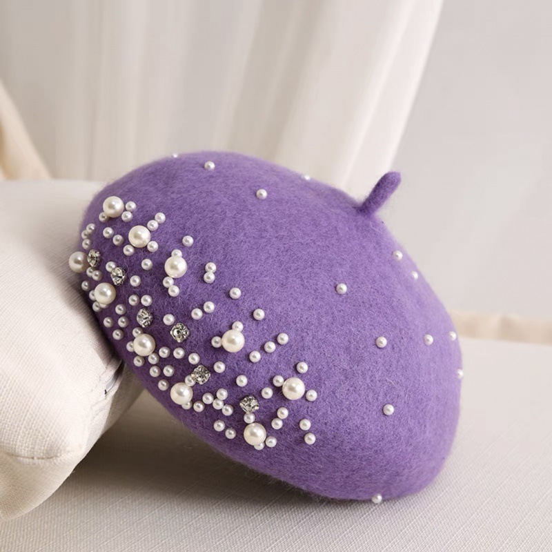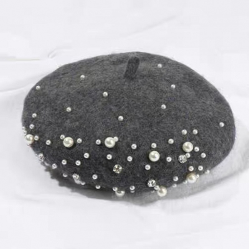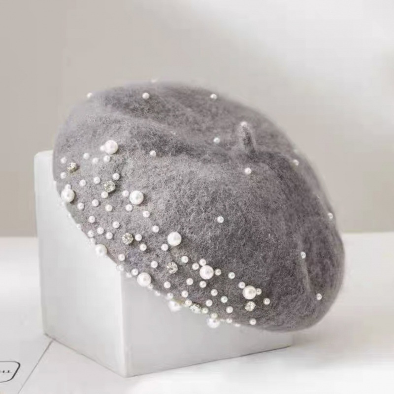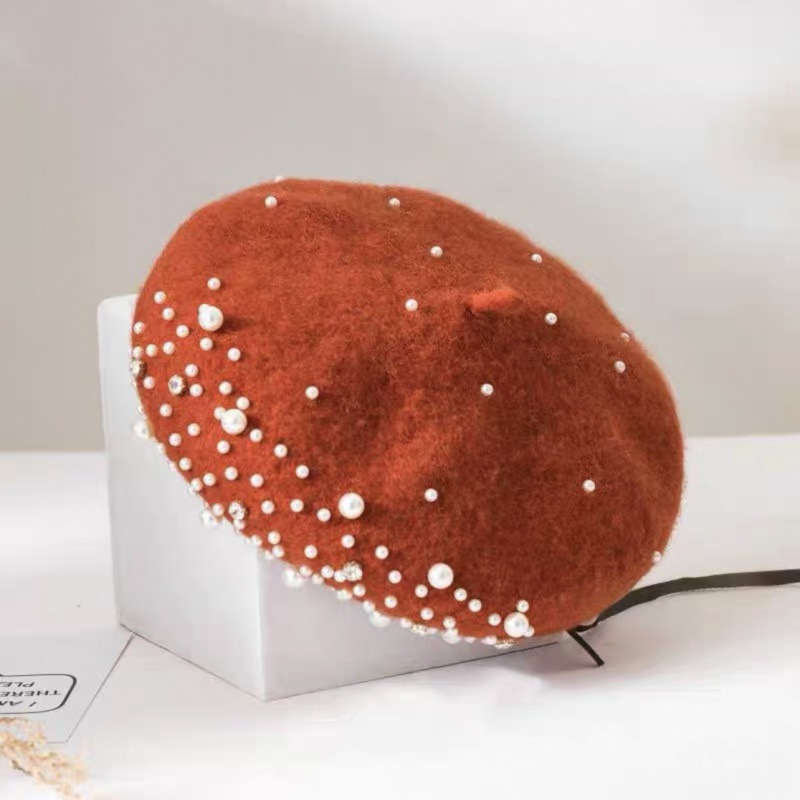 亲子款帽子女奢华手工珍珠羊毛呢子贝雷帽复古英伦秋冬百搭画家帽