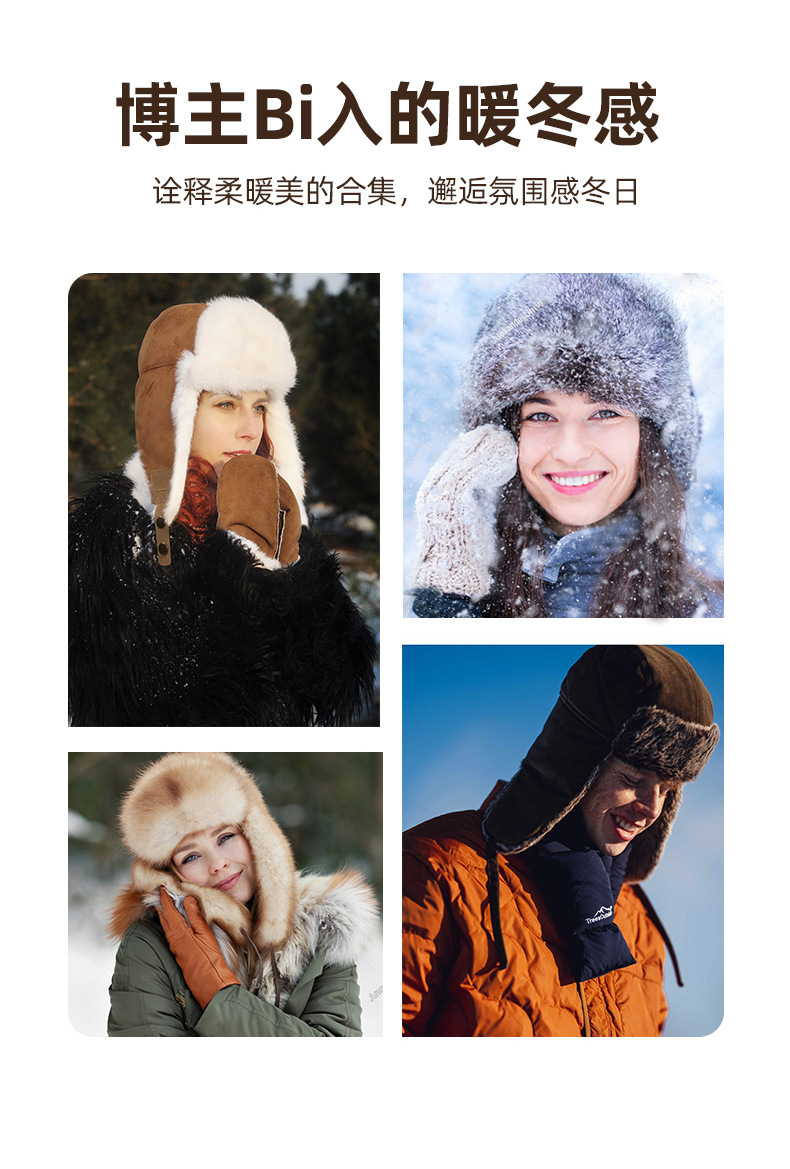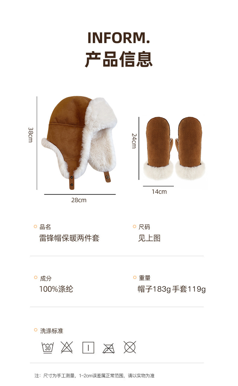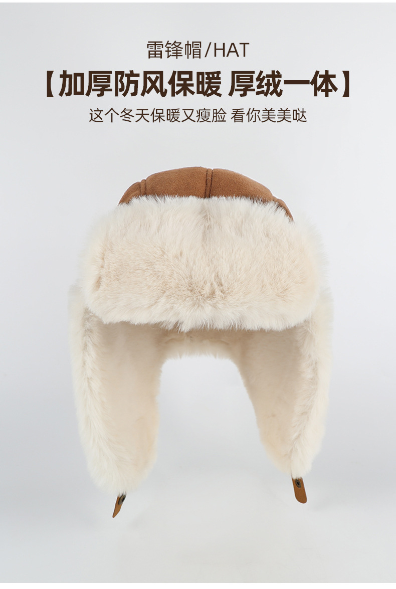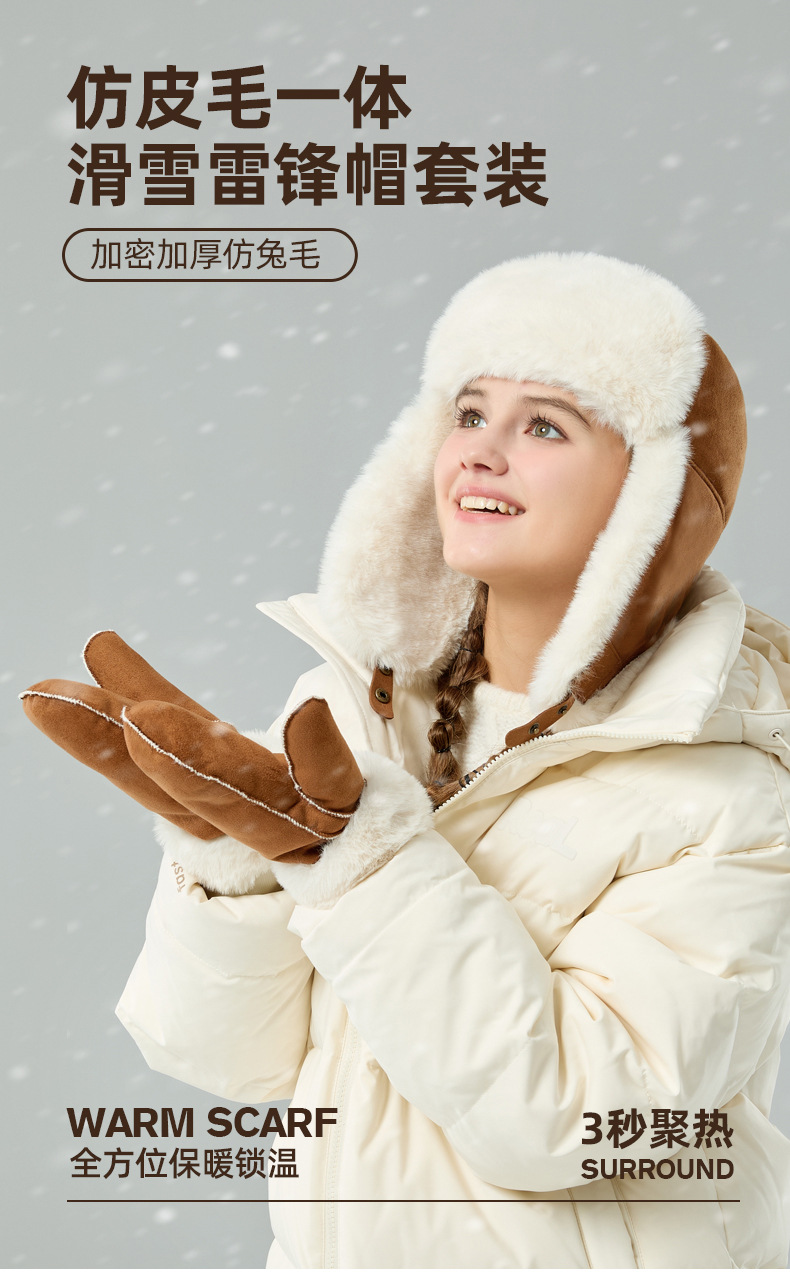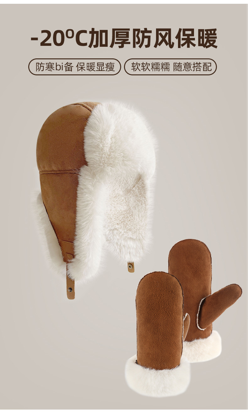 秋冬麂皮绒雷锋帽毛绒加厚护耳帽保暖滑雪帽兔毛手套户外防寒套装
