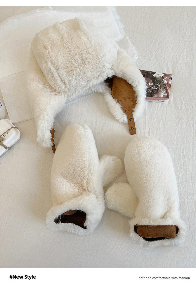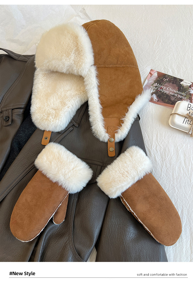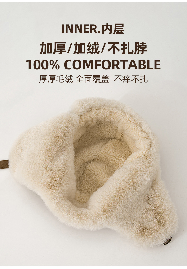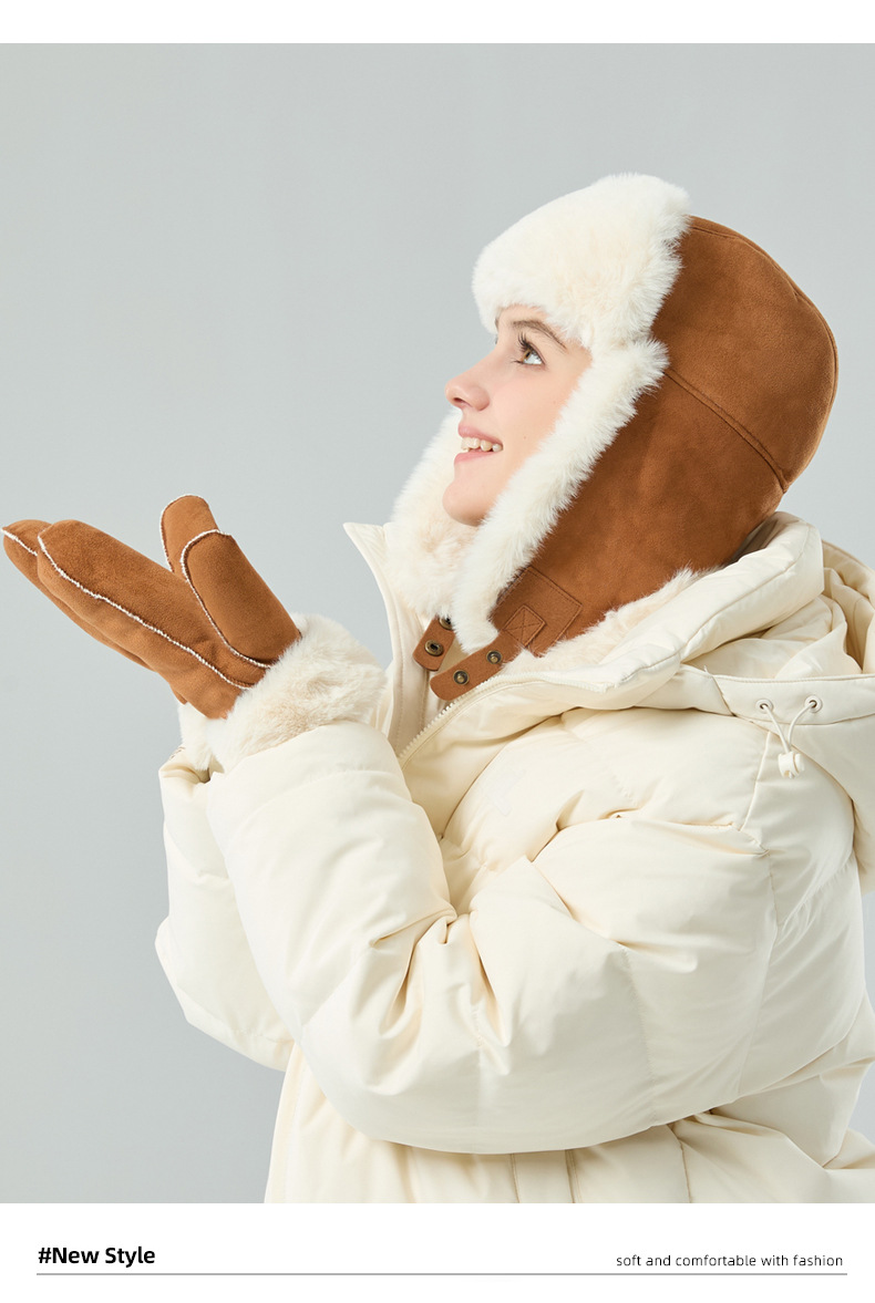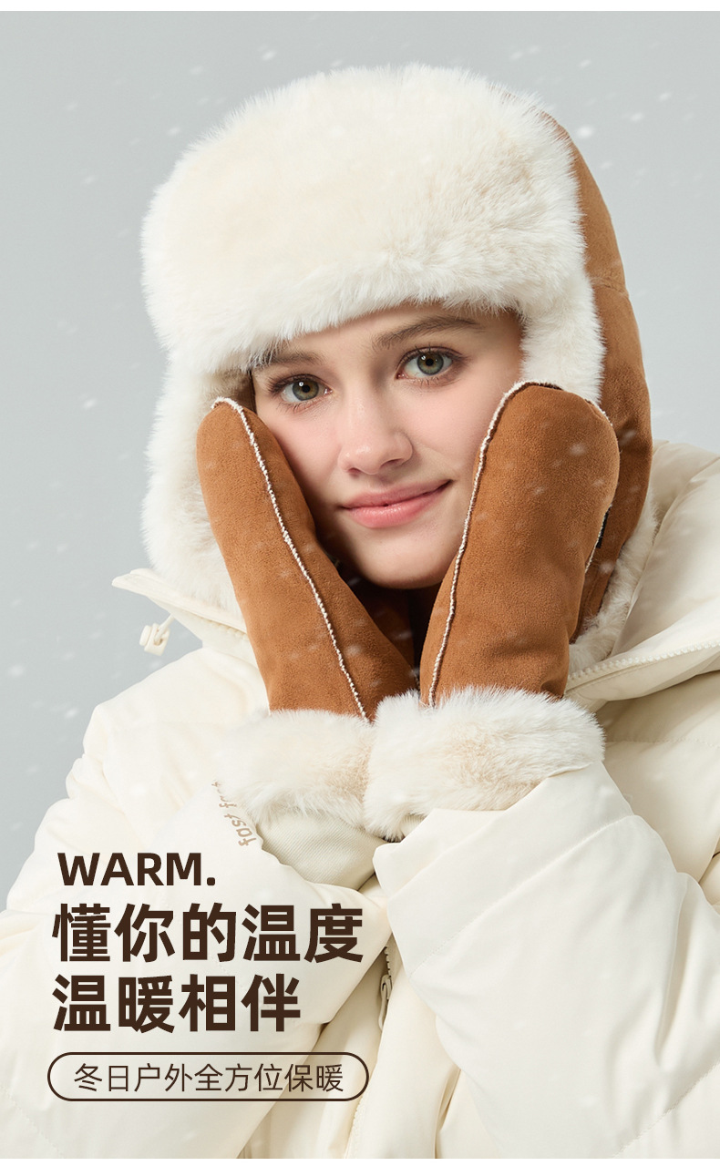 秋冬麂皮绒雷锋帽毛绒加厚护耳帽保暖滑雪帽兔毛手套户外防寒套装