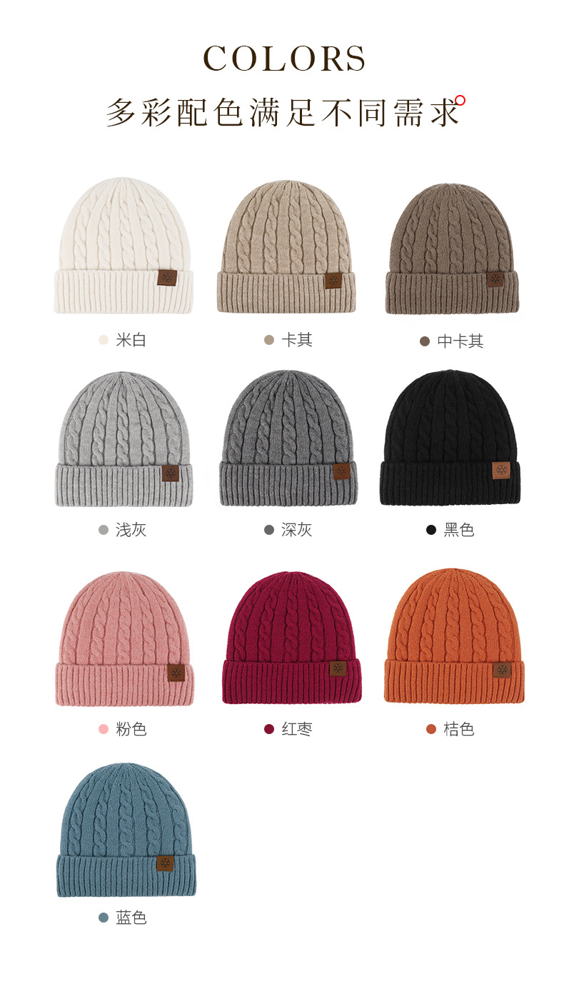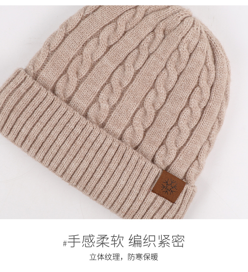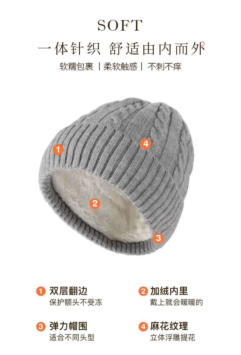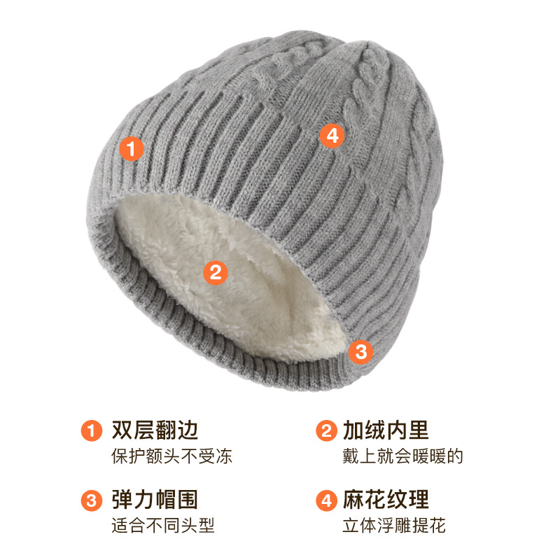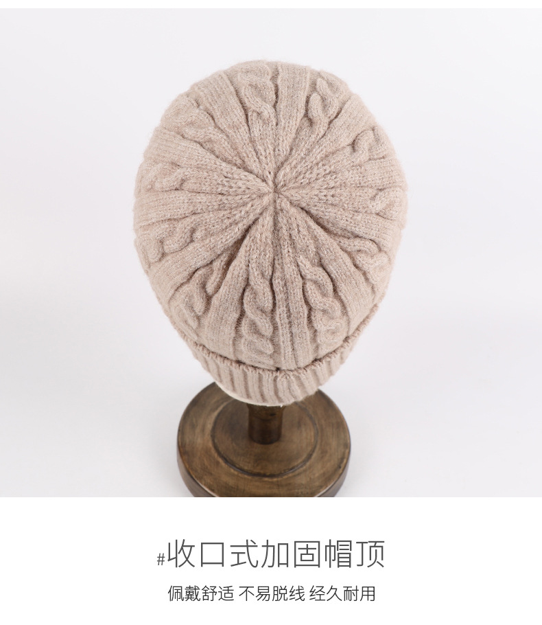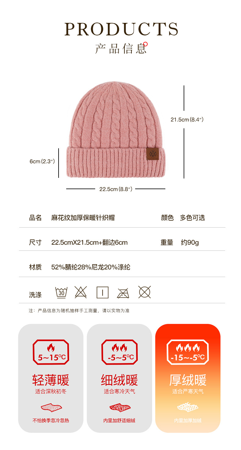 冬季帽子女麻花纹针织帽保暖纯色百搭防寒护耳加绒加厚翻边毛线帽
