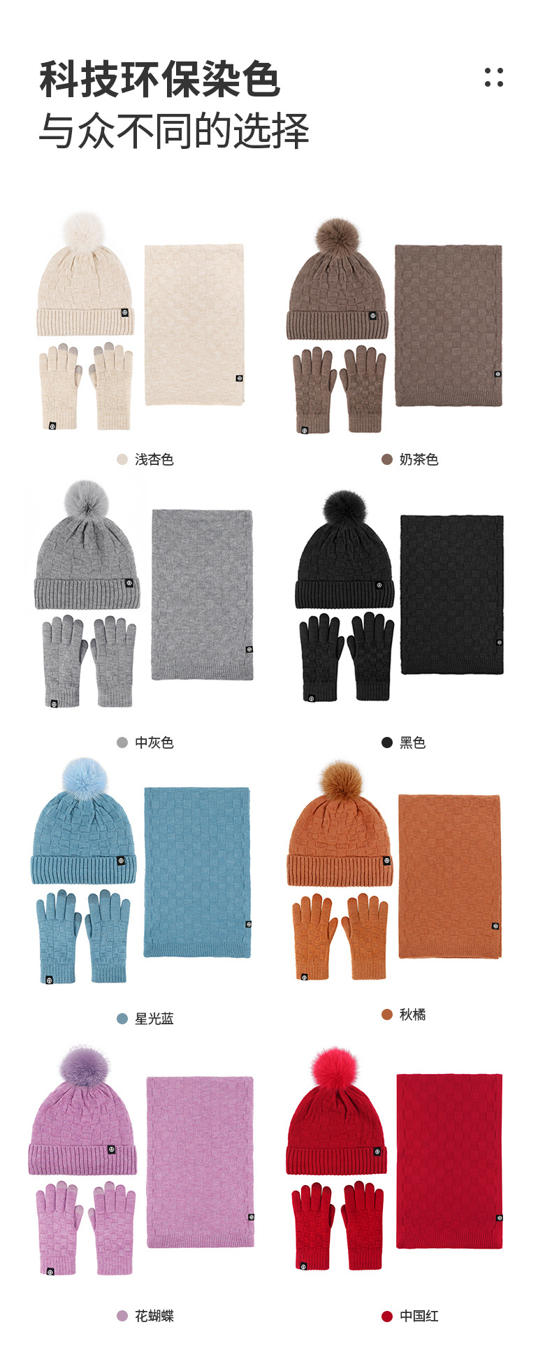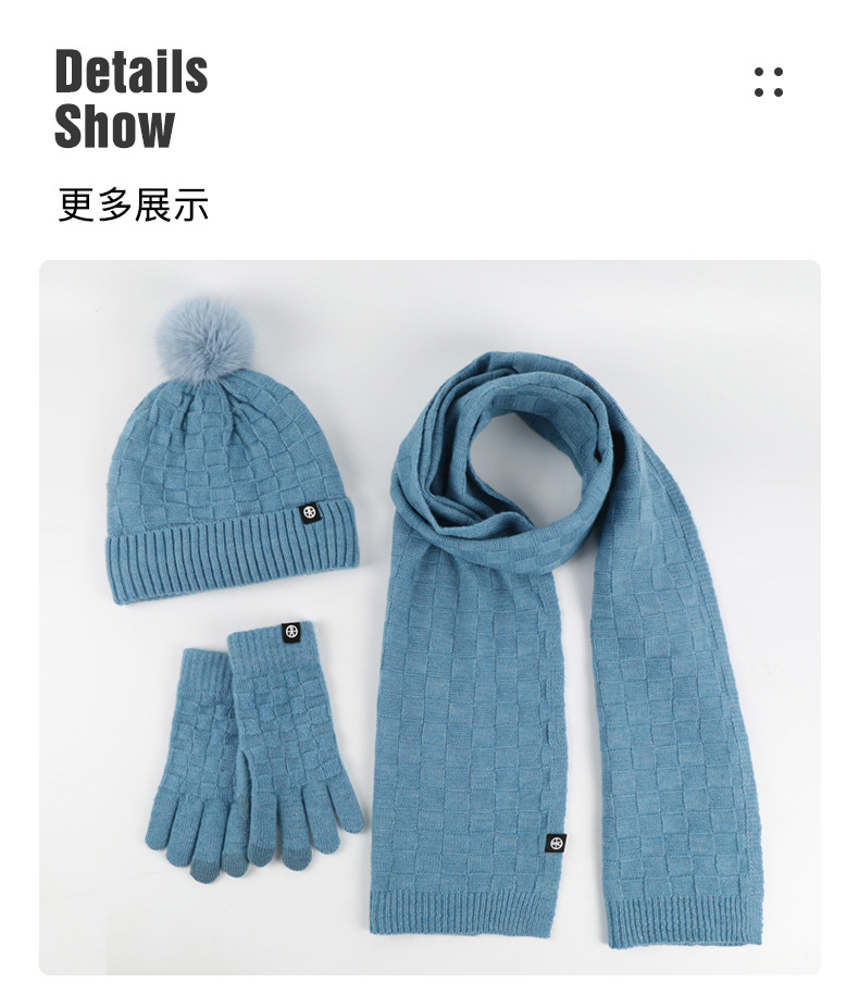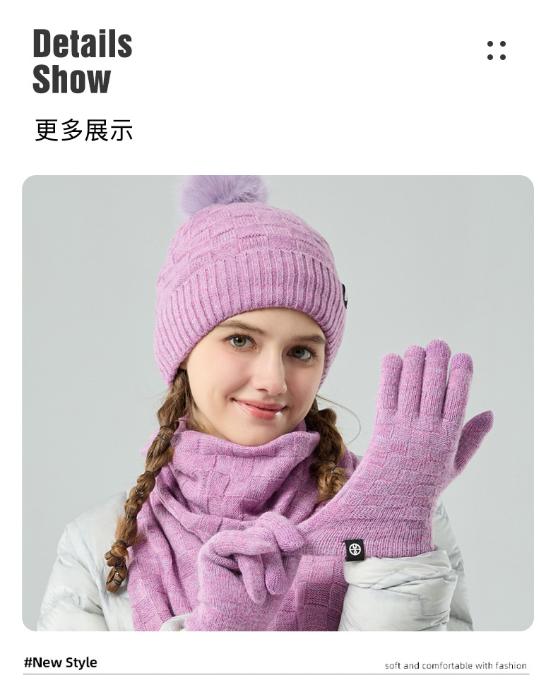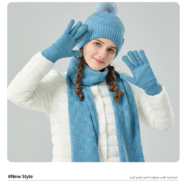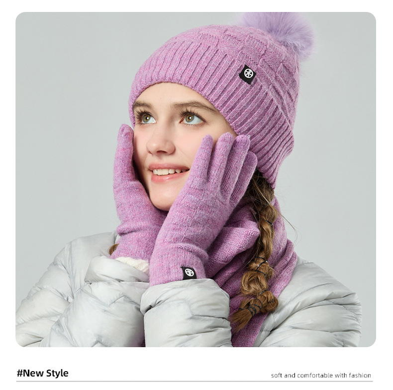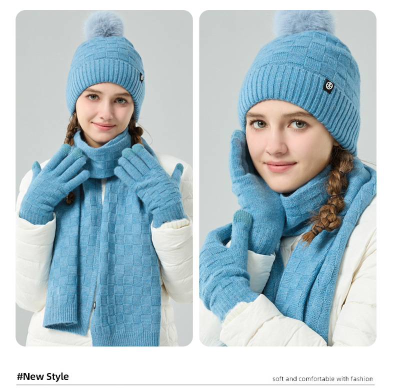 欧美冬季围巾三件套加绒户外保暖毛球针织帽子围巾手套三件套装