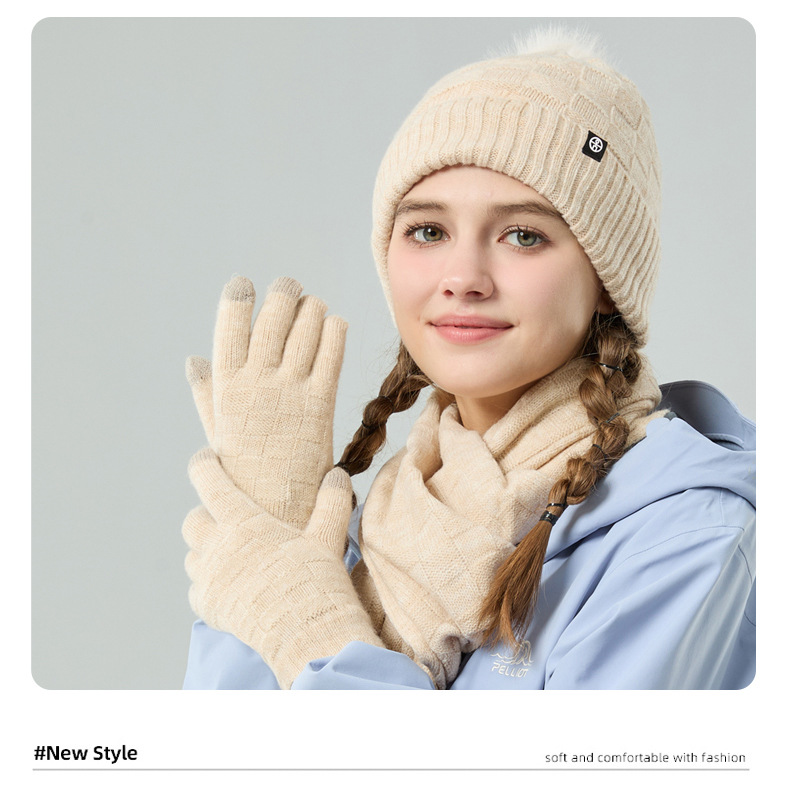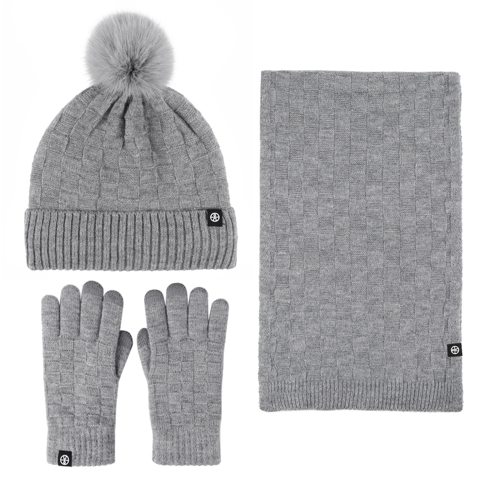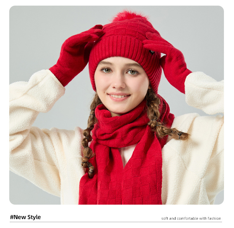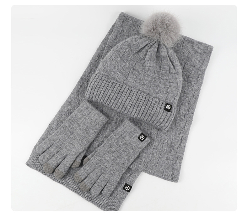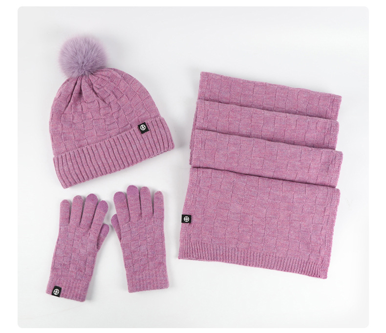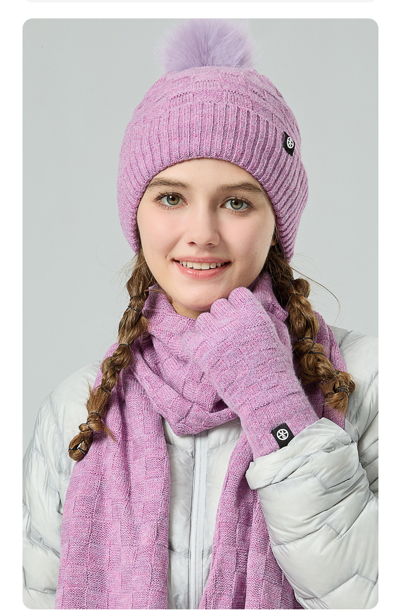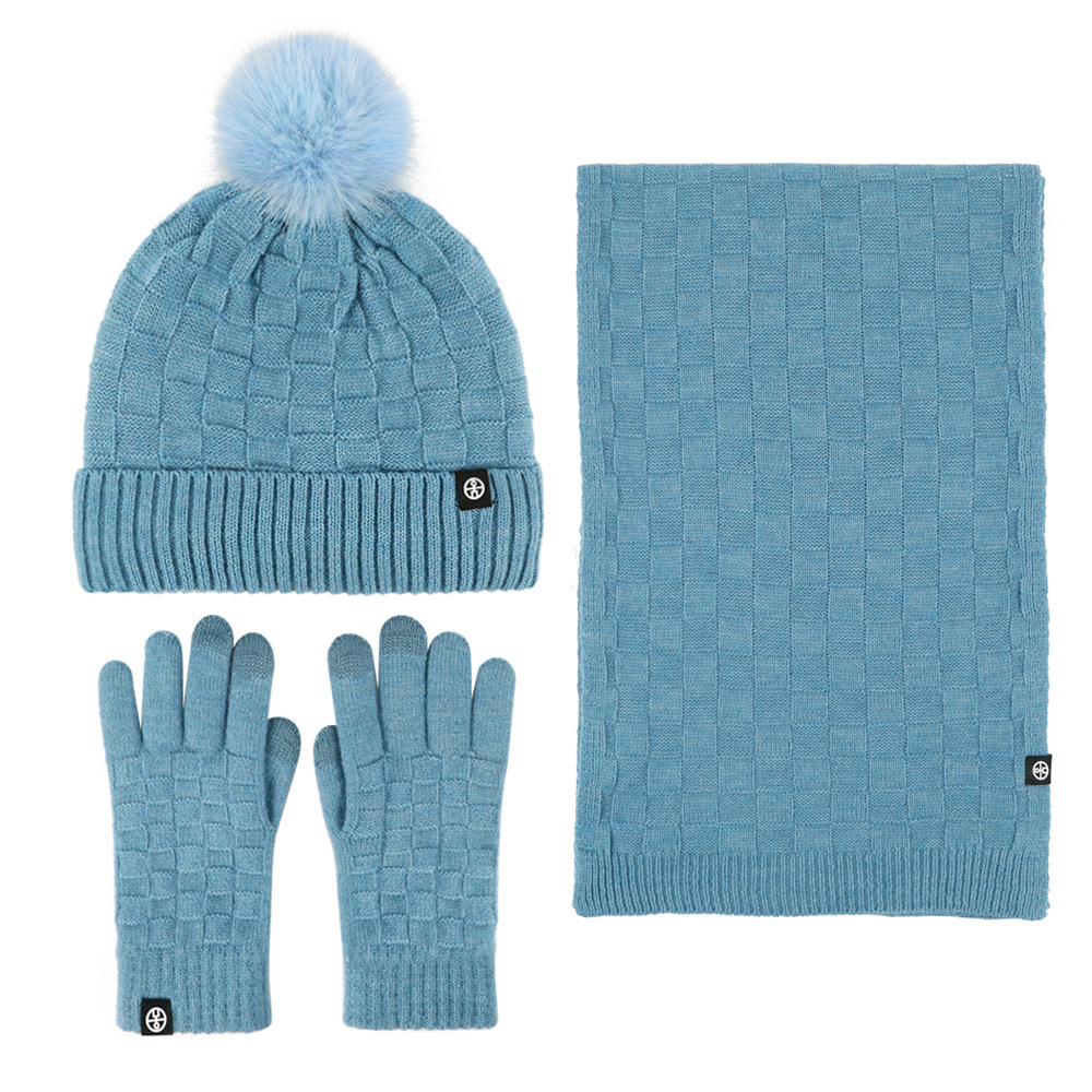 欧美冬季围巾三件套加绒户外保暖毛球针织帽子围巾手套三件套装