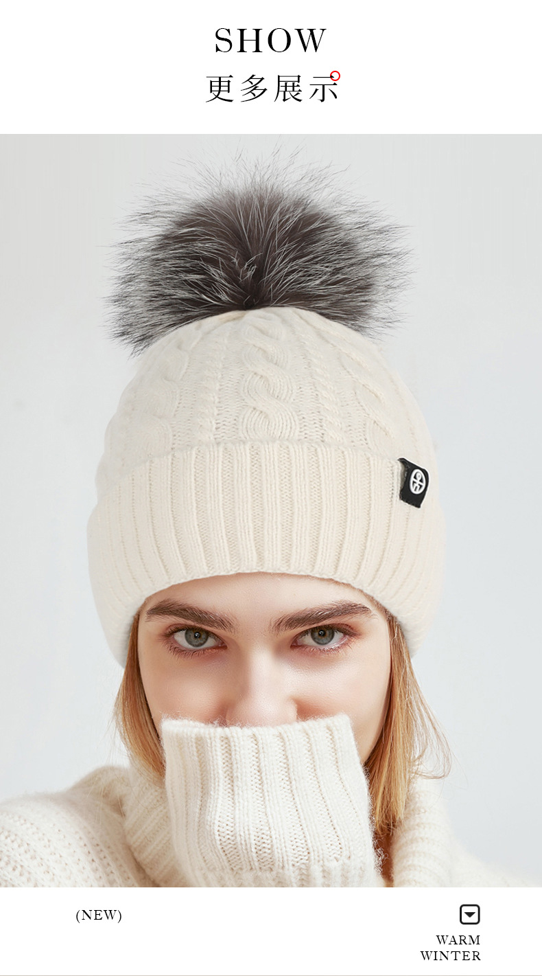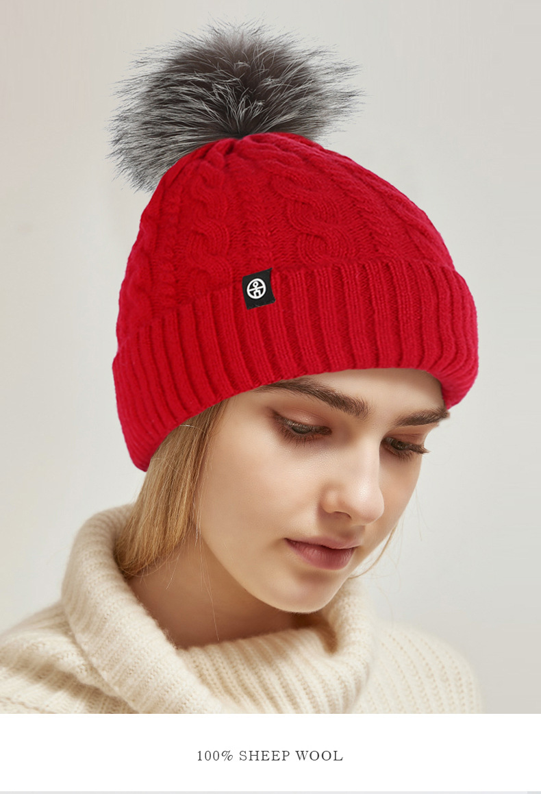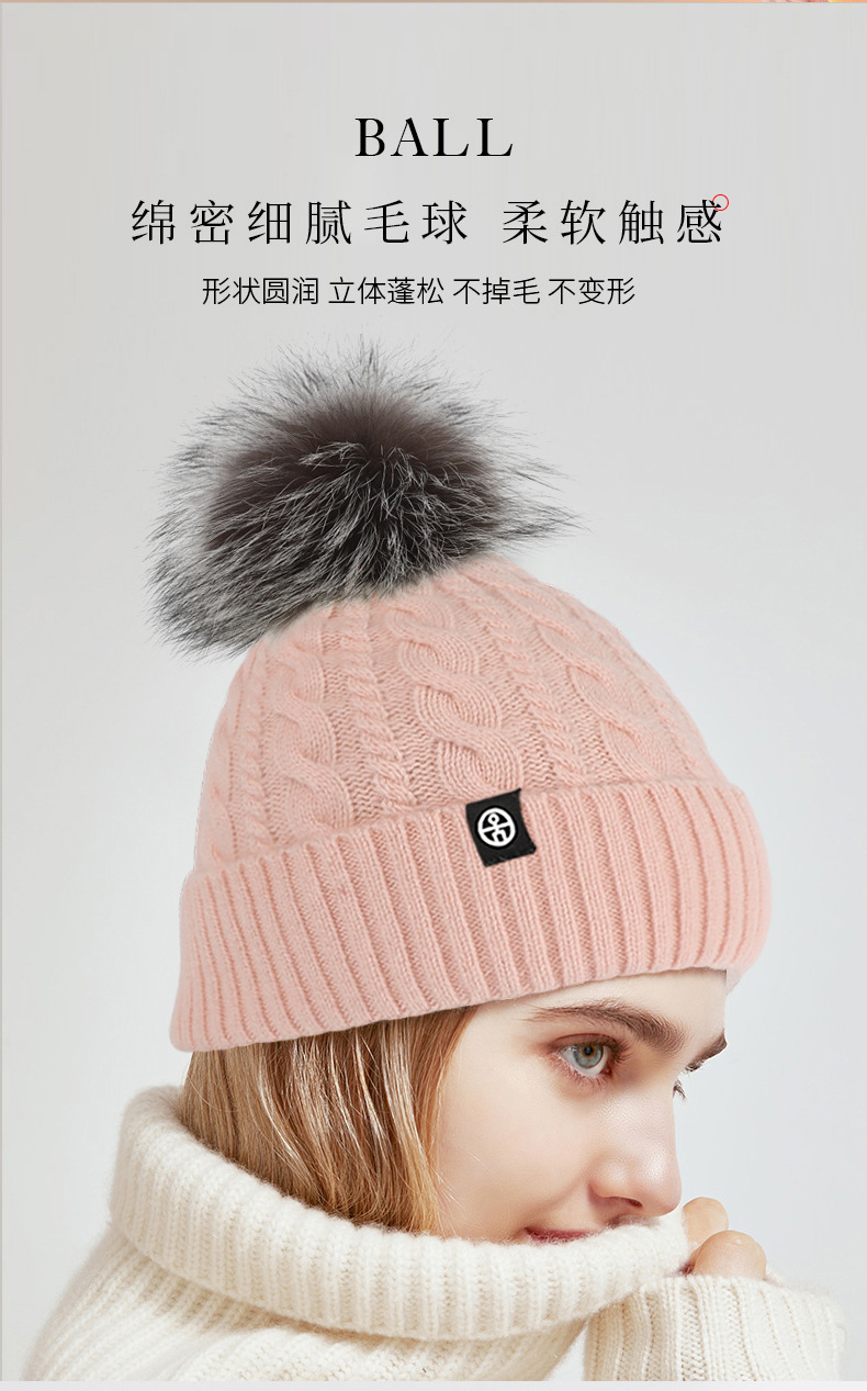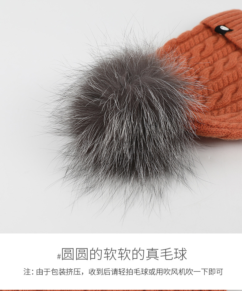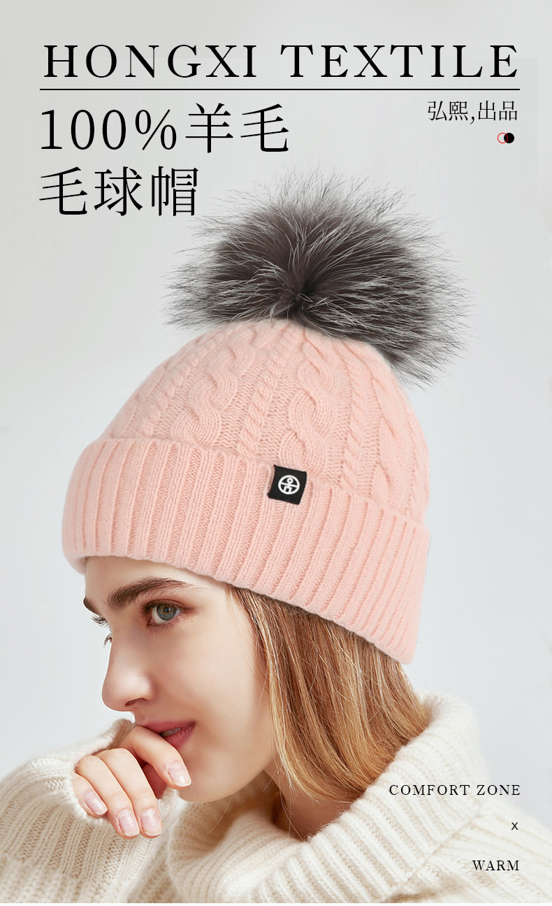 纯羊毛帽子女秋冬季跨境真毛球护耳针织帽户外保暖防风加厚套头帽