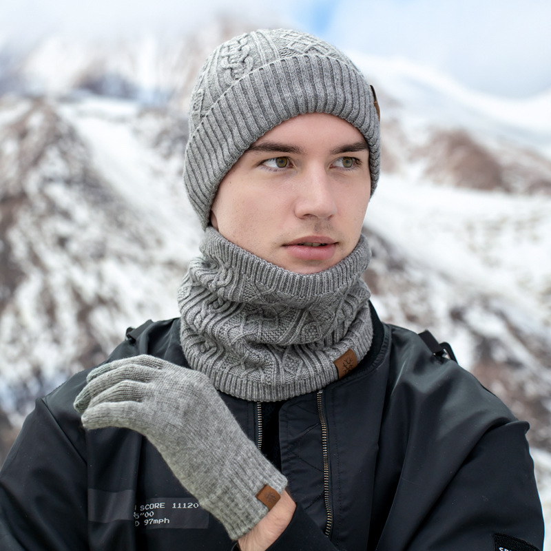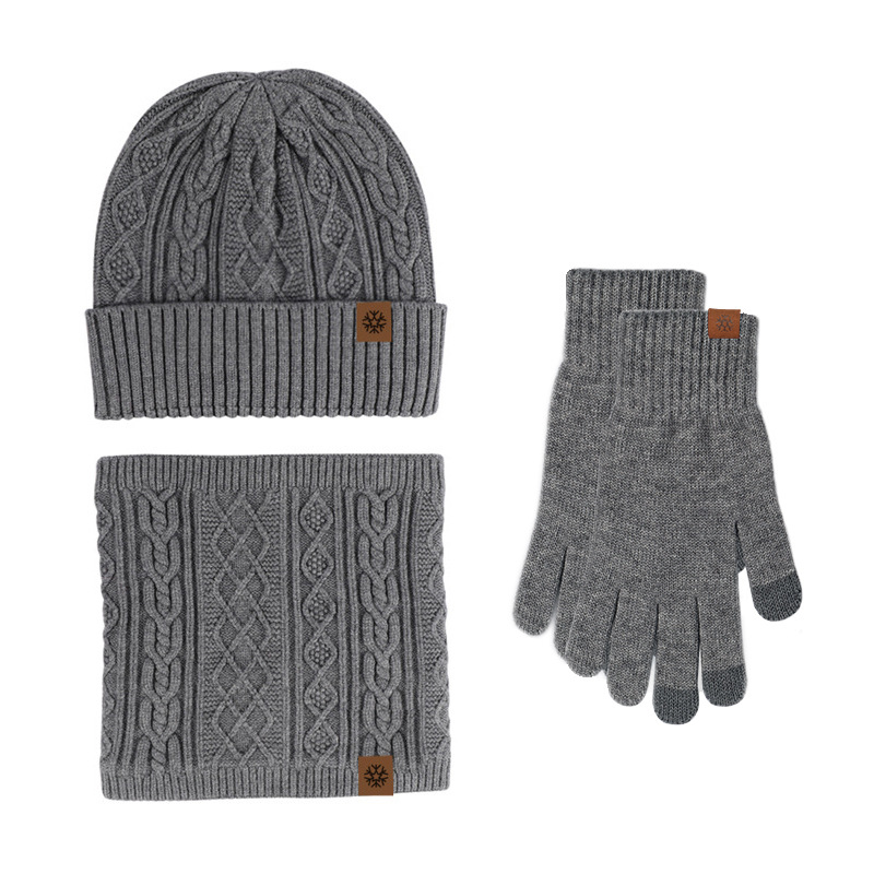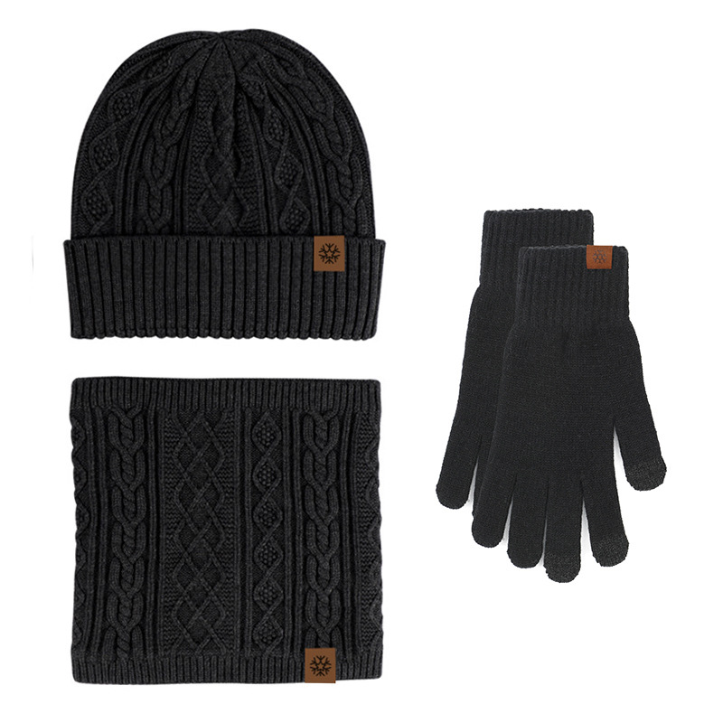 跨境专供冬季针织手套帽子围脖三件套触屏加绒保暖毛线帽子三件套
