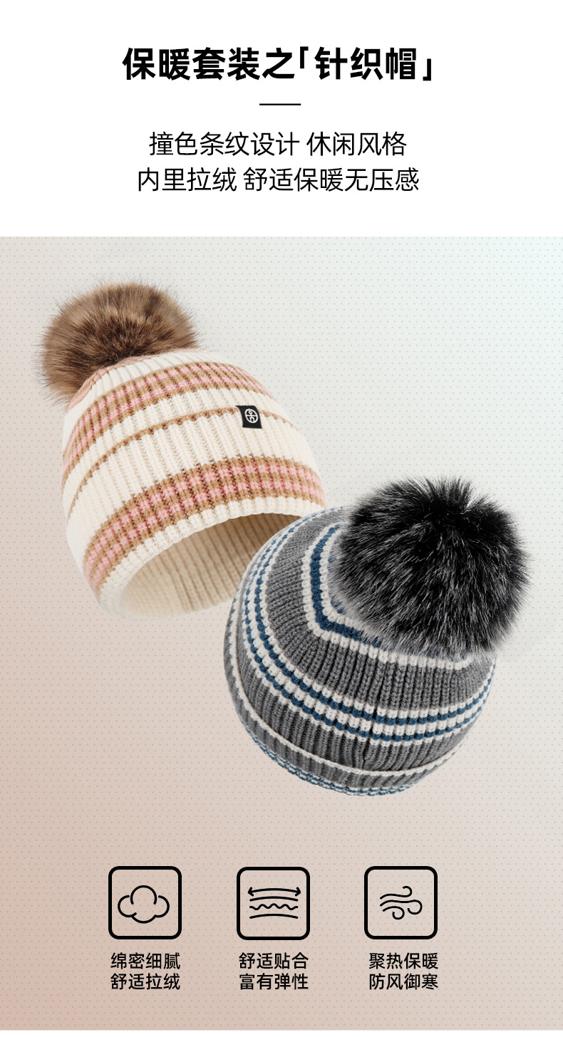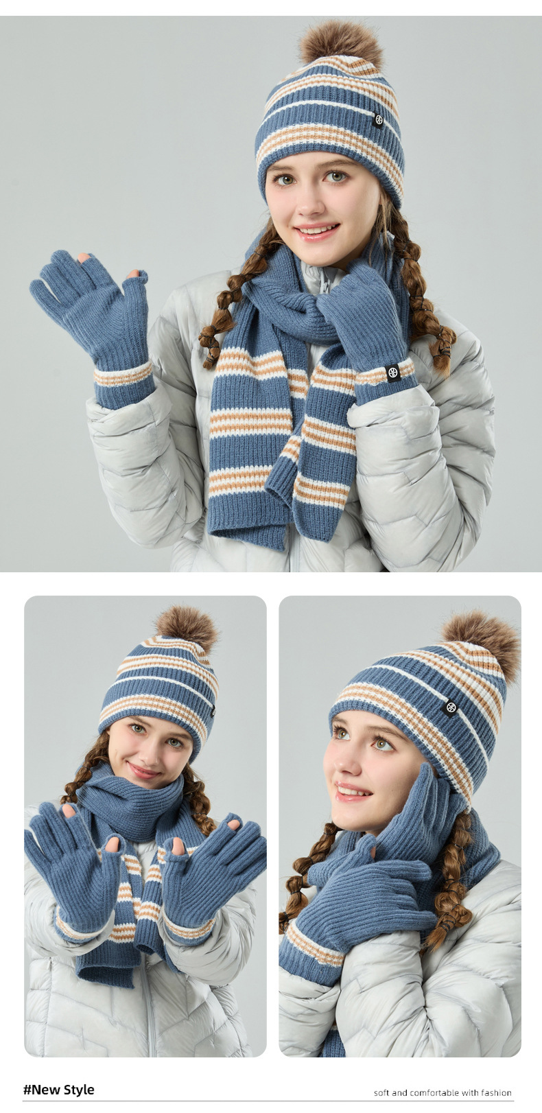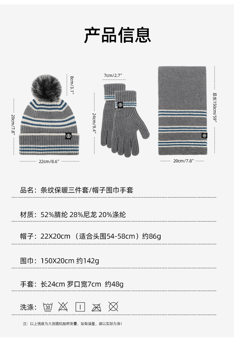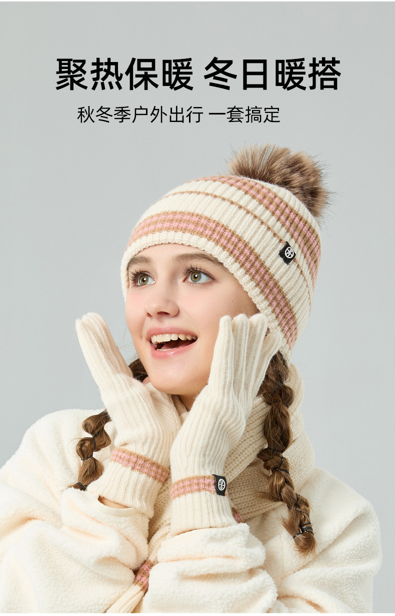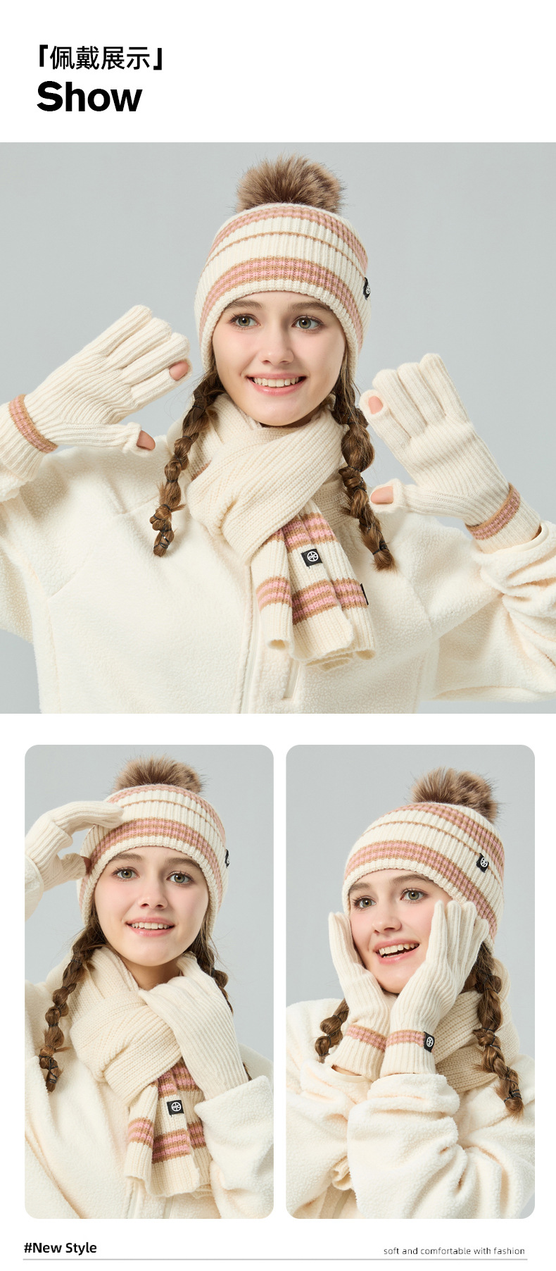 冬季保暖户外针织围巾三件套帽子条纹护耳毛球帽子围巾手套三件套