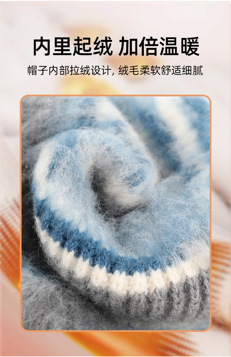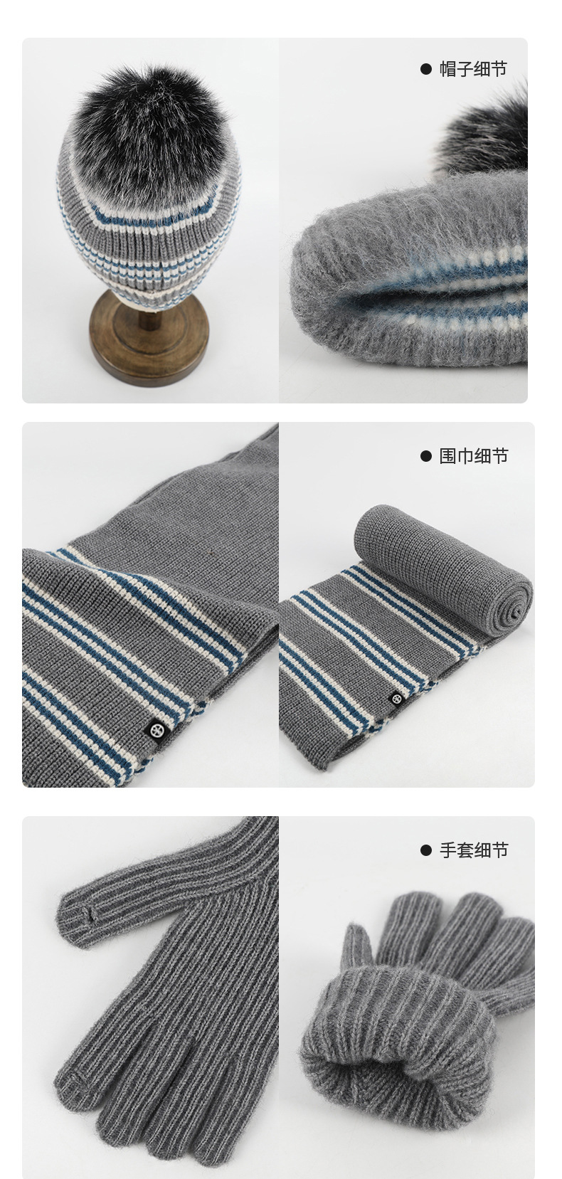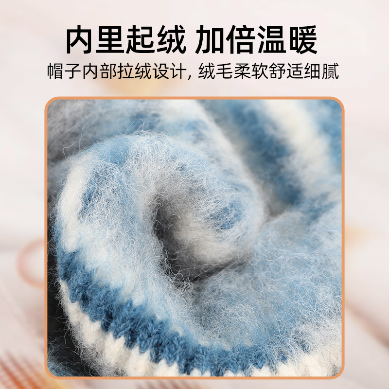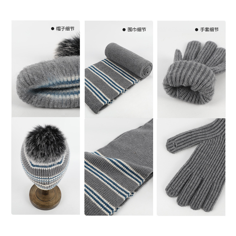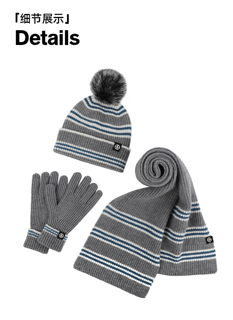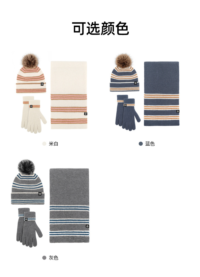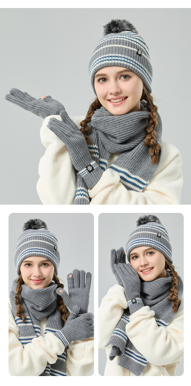 冬季保暖户外针织围巾三件套帽子条纹护耳毛球帽子围巾手套三件套